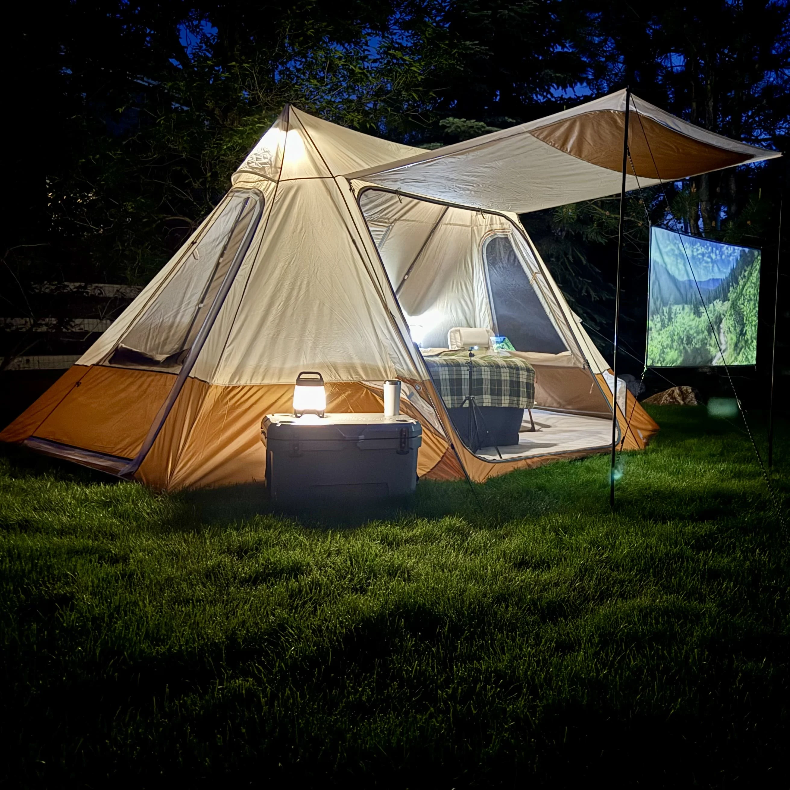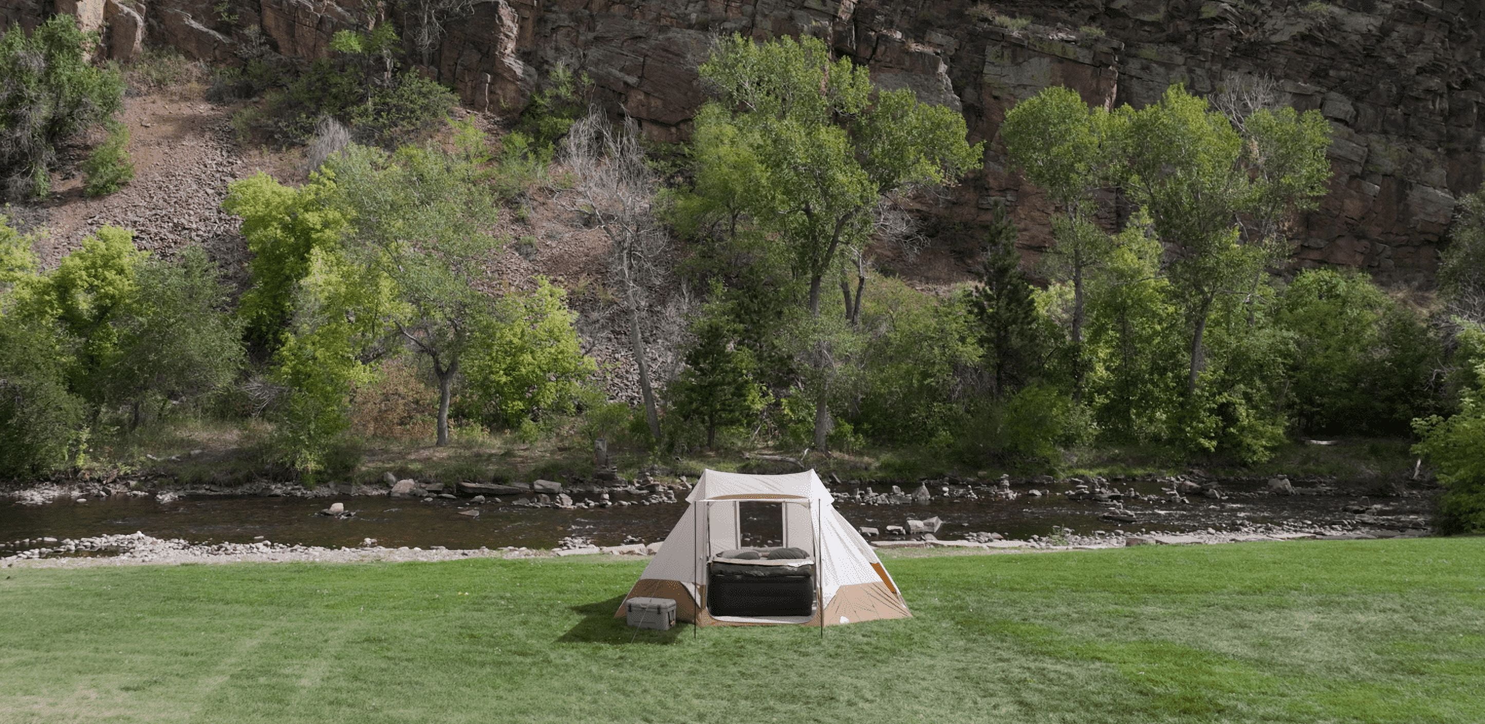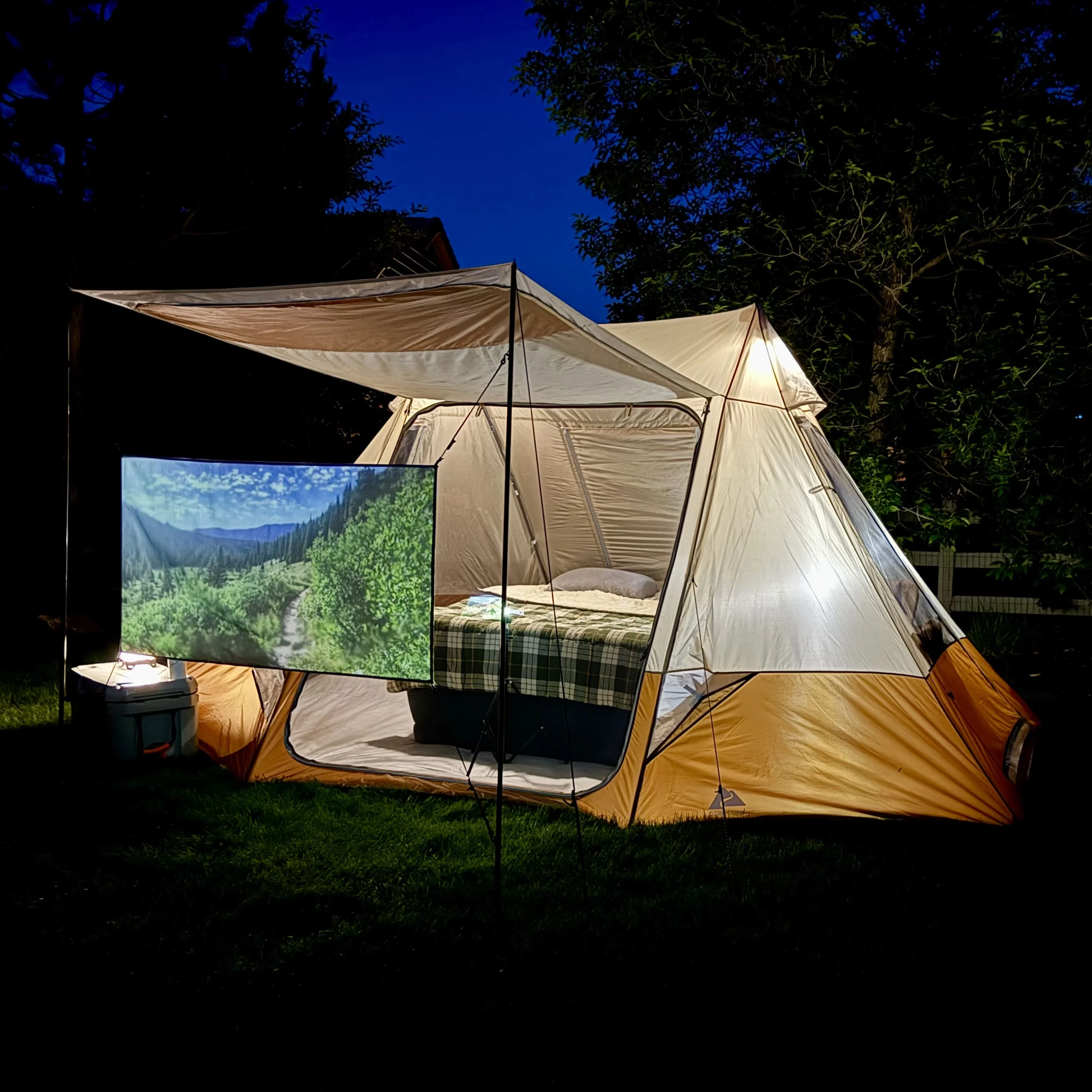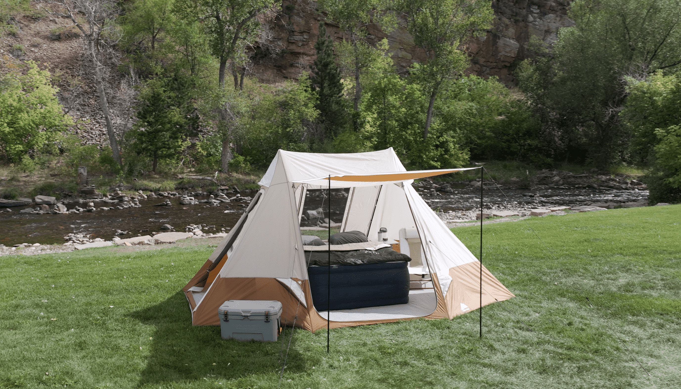 Ozark Trail 10-Person Glamping Ridge Tent with Awning Upgrade your camping experience with the Ozark Trail 10-Person Glamping Ridge Tent! This spacious tent fits up to three queen-size airbeds and sleeps 10 people comfortably—perfect for large families or groups. With a tall 90-inch peak height, you can stand and move around with ease. Stay cool and comfortable with three large windows, four mid-level vents, and two peak vents for great airflow. Three doors provide easy entry and exit from different sides, helping keep things organized. For extra outdoor space, the front awning creates a shaded lounge area—great for relaxing or socializing. Plus, the included 55-inch projector screen turns your campsite into an outdoor movie theater! Modern touches like an E-Port for power access, lantern hangers, and built-in storage pockets add convenience. Designed for all-weather comfort, the tent features durable materials and taped seams to keep you dry. Setup is quick and simple, taking just 15 minutes with two people using the extendable “A” frame poles. Guy ropes add stability in windy conditions. Despite its roomy 157 sq ft interior and 17.5 sq ft awning, this tent is easy to pack up. It folds into a compact carry bag (28 x 10.25 x 10.25 inches) and weighs only 27.72 lbs. The expandable duffle makes storage a breeze, and a 1-year limited warranty ensures peace of mind. Whether you’re heading to a festival, planning a family trip, or looking for a luxury outdoor retreat, this glamping tent delivers comfort, convenience, and adventure-ready durability!