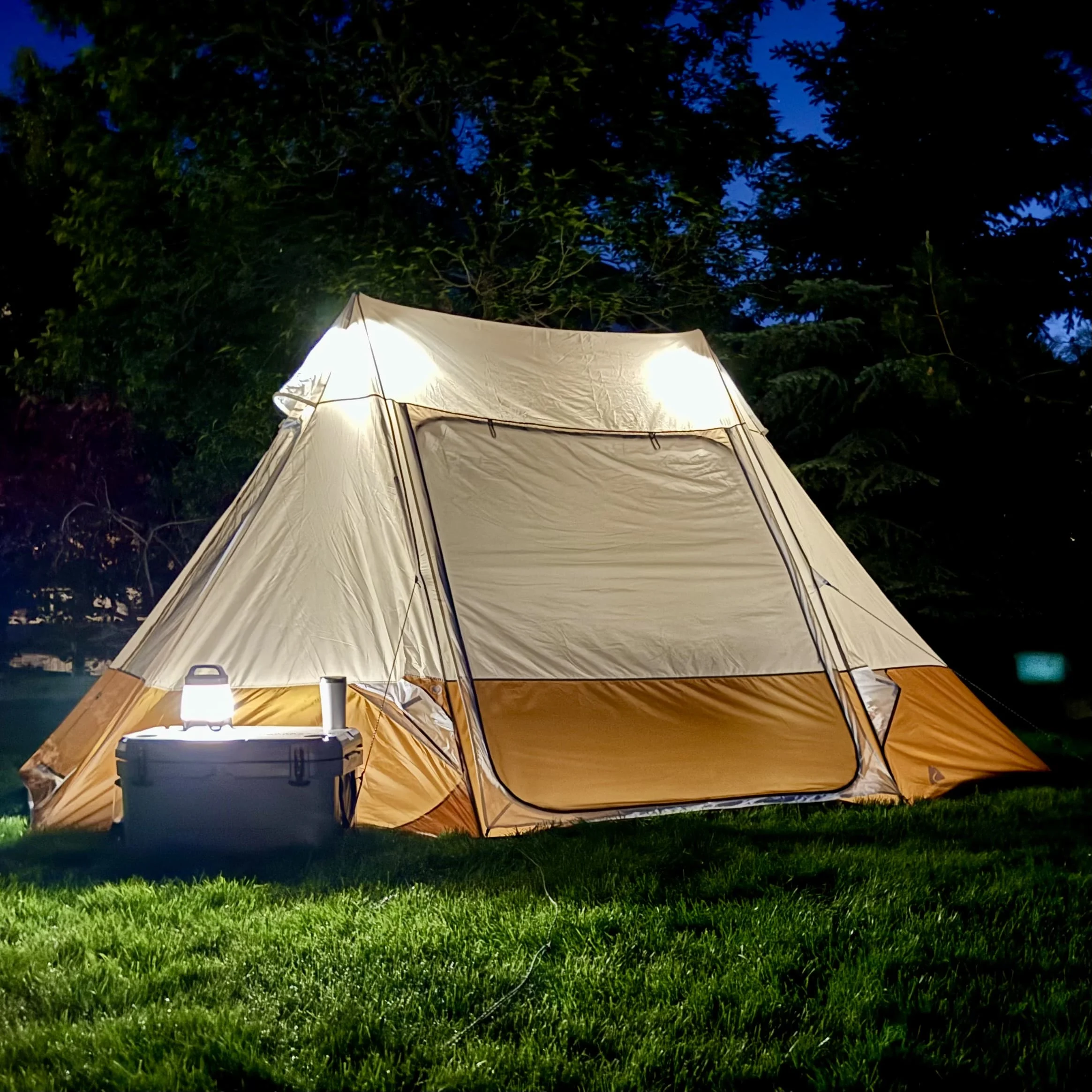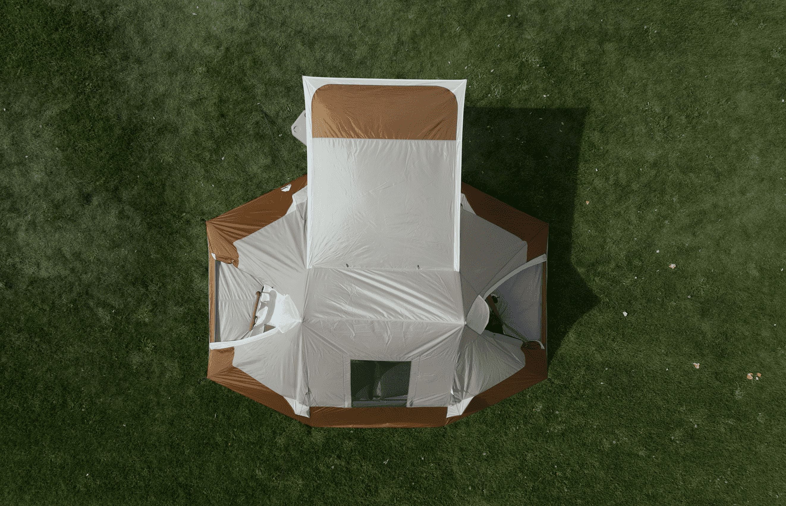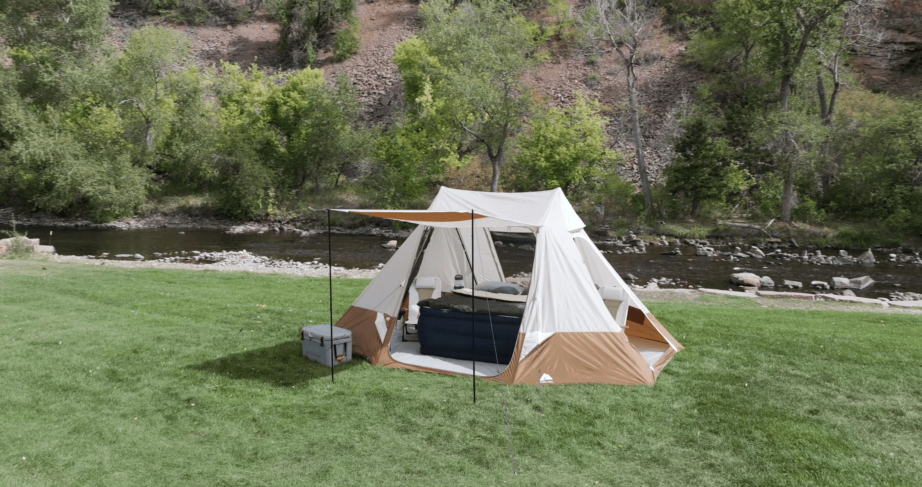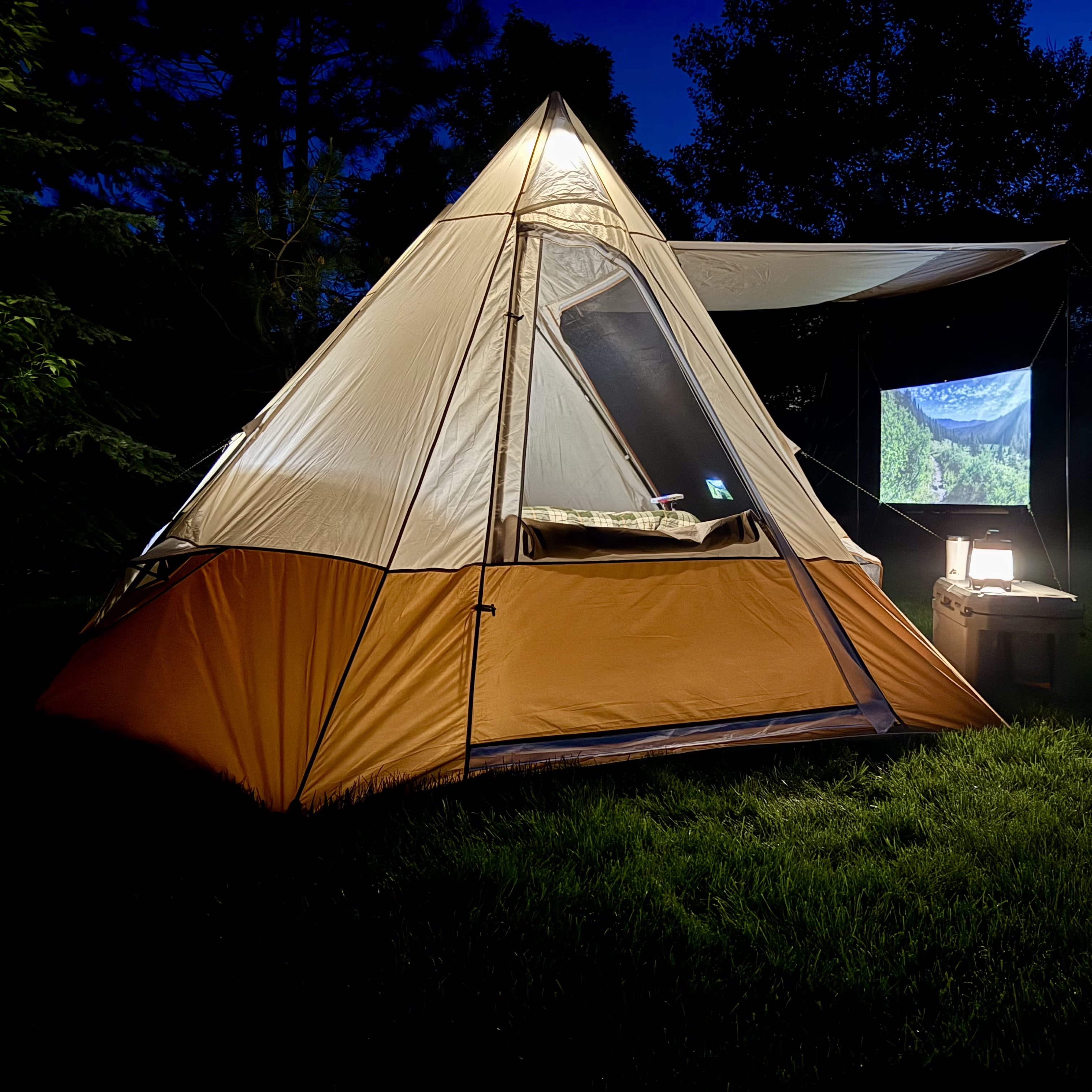 Ozark Trail 10-Person Glamping Ridge Tent with Awning Upgrade your camping experience with the Ozark Trail 10-Person Glamping Ridge Tent! This spacious tent fits up to three queen-size airbeds and sleeps 10 people comfortably—perfect for large families or groups. With a tall 90-inch peak height, you can stand and move around with ease. Stay cool and comfortable with three large windows, four mid-level vents, and two peak vents for great airflow. Three doors provide easy entry and exit from different sides, helping keep things organized. For extra outdoor space, the front awning creates a shaded lounge area—great for relaxing or socializing. Plus, the included 55-inch projector screen turns your campsite into an outdoor movie theater! Modern touches like an E-Port for power access, lantern hangers, and built-in storage pockets add convenience. Designed for all-weather comfort, the tent features durable materials and taped seams to keep you dry. Setup is quick and simple, taking just 15 minutes with two people using the extendable “A” frame poles. Guy ropes add stability in windy conditions. Despite its roomy 157 sq ft interior and 17.5 sq ft awning, this tent is easy to pack up. It folds into a compact carry bag (28 x 10.25 x 10.25 inches) and weighs only 27.72 lbs. The expandable duffle makes storage a breeze, and a 1-year limited warranty ensures peace of mind. Whether you’re heading to a festival, planning a family trip, or looking for a luxury outdoor retreat, this glamping tent delivers comfort, convenience, and adventure-ready durability!