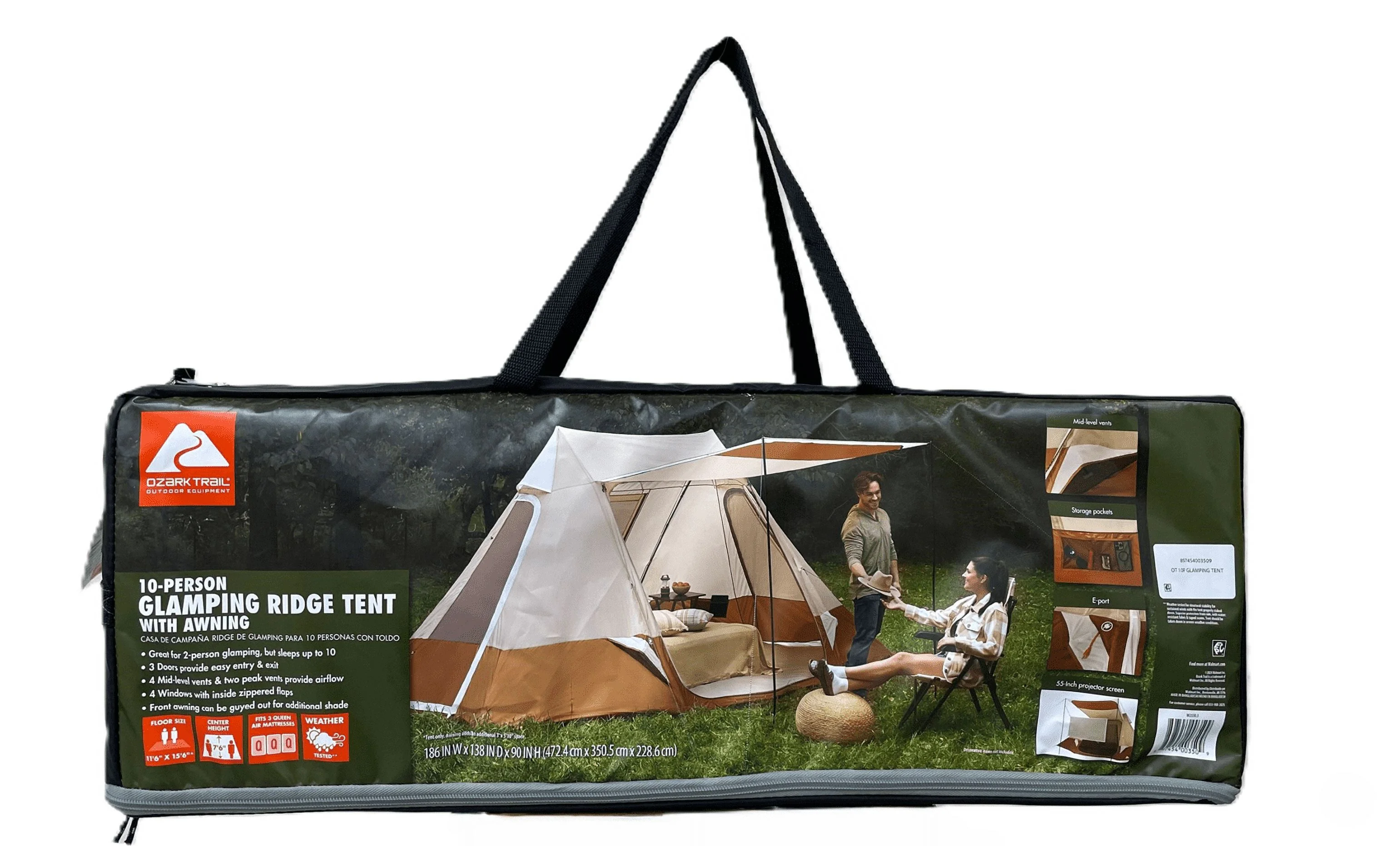 Ozark Trail 10-Person Glamping Ridge Tent with Awning Ozark Trail Brand Sleep up to 10 people Spacious interior fits up to 3 Queen airbeds 90-inch peak height provides plenty of headroom Three windows with zippered flaps provide cross ventilation Three doors for easy entry and exit 4 Mid-level vents and 2peak vents provide airflow Front awning with included upright poles can be guyed out for additional shade Included 55″ projector screen hangs between awning upright poles Taped seams for weather protection E-Port for convenient electrical cord access 2 lantern hanger crossbars at the peak of the internal poles for conveniently hanging your lantern(s) Contains hanging organizers and pockets for convenient storage of small, lightweight items 4 extendable “A” frame poles for quick set up 4 guy ropes provide wind stability Carry duffle expands to make repacking and storage easy Dimensions: Floor: 15 ft 6in x 11 ft 6in Floor Area: 157 sq ft Awning Area: 17.5 sq ft Packed Size: 28 in x 10.25 in x 10.25 in Carry Weight: 27.72 lbs. Average Set-Up Time for 2 people: 15 minutes 1-Year Limited Warranty
