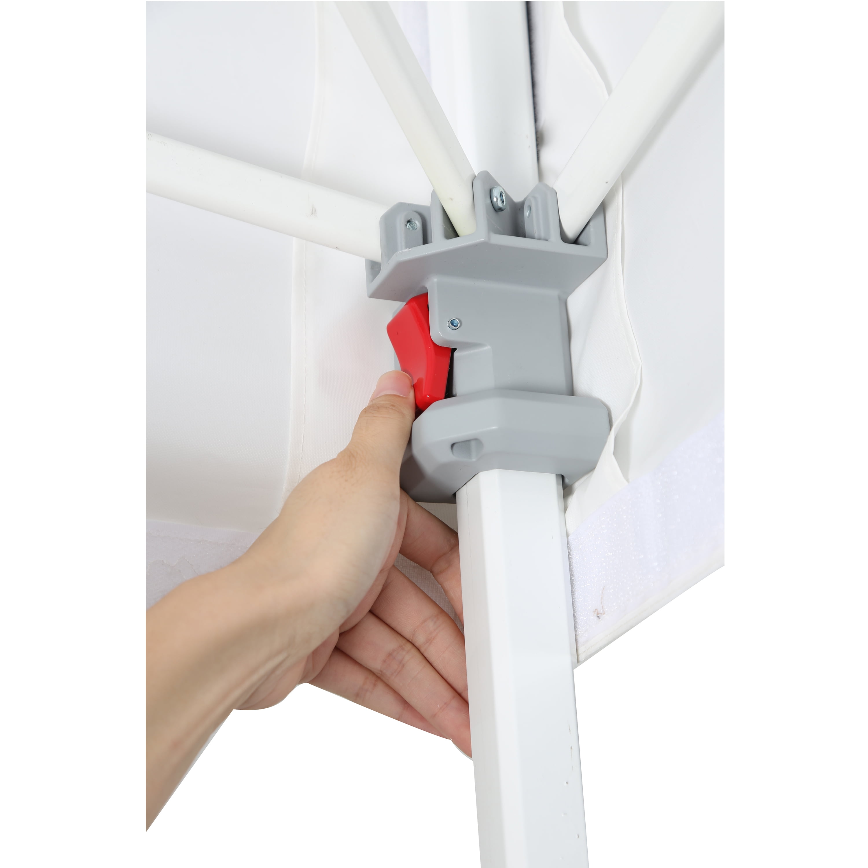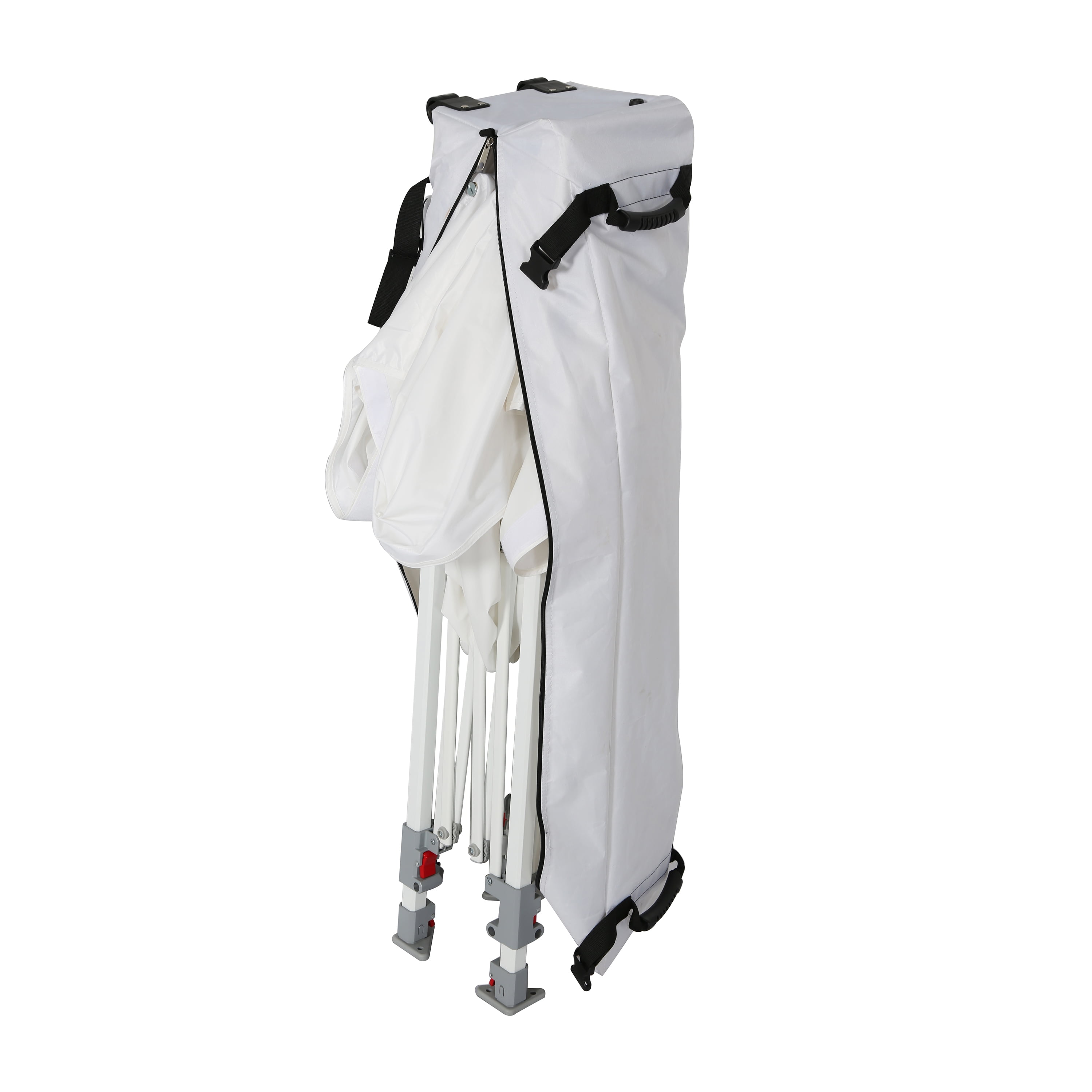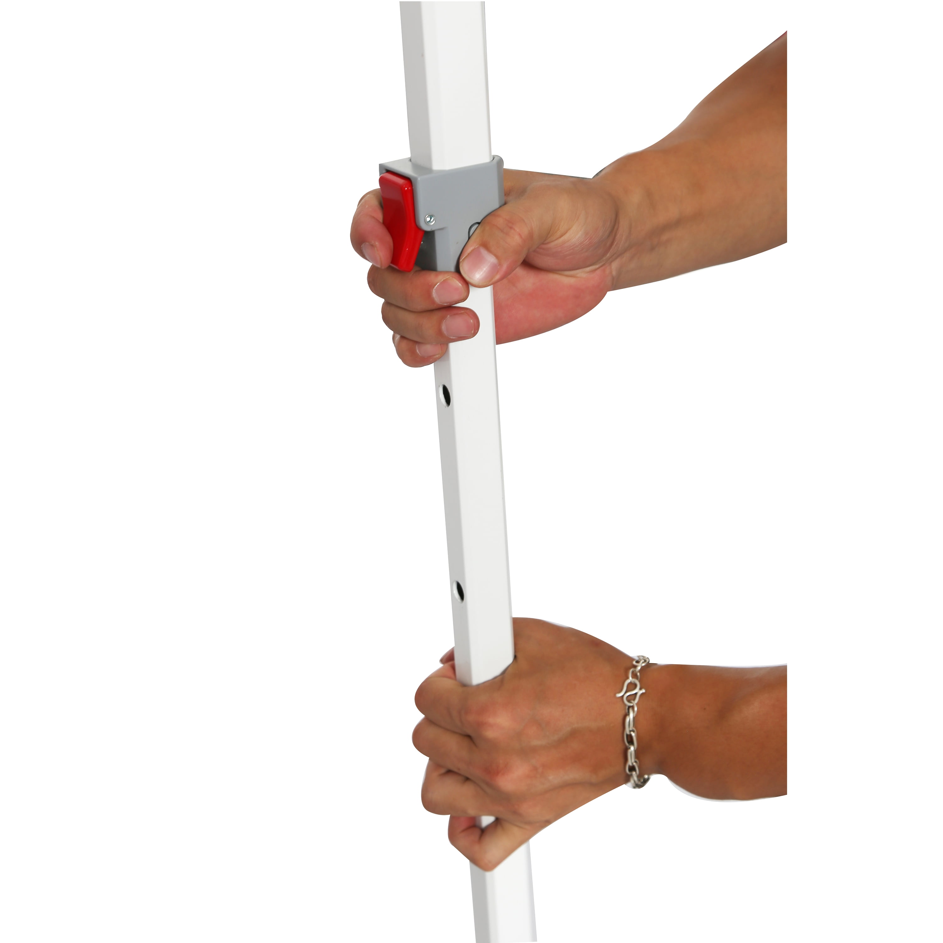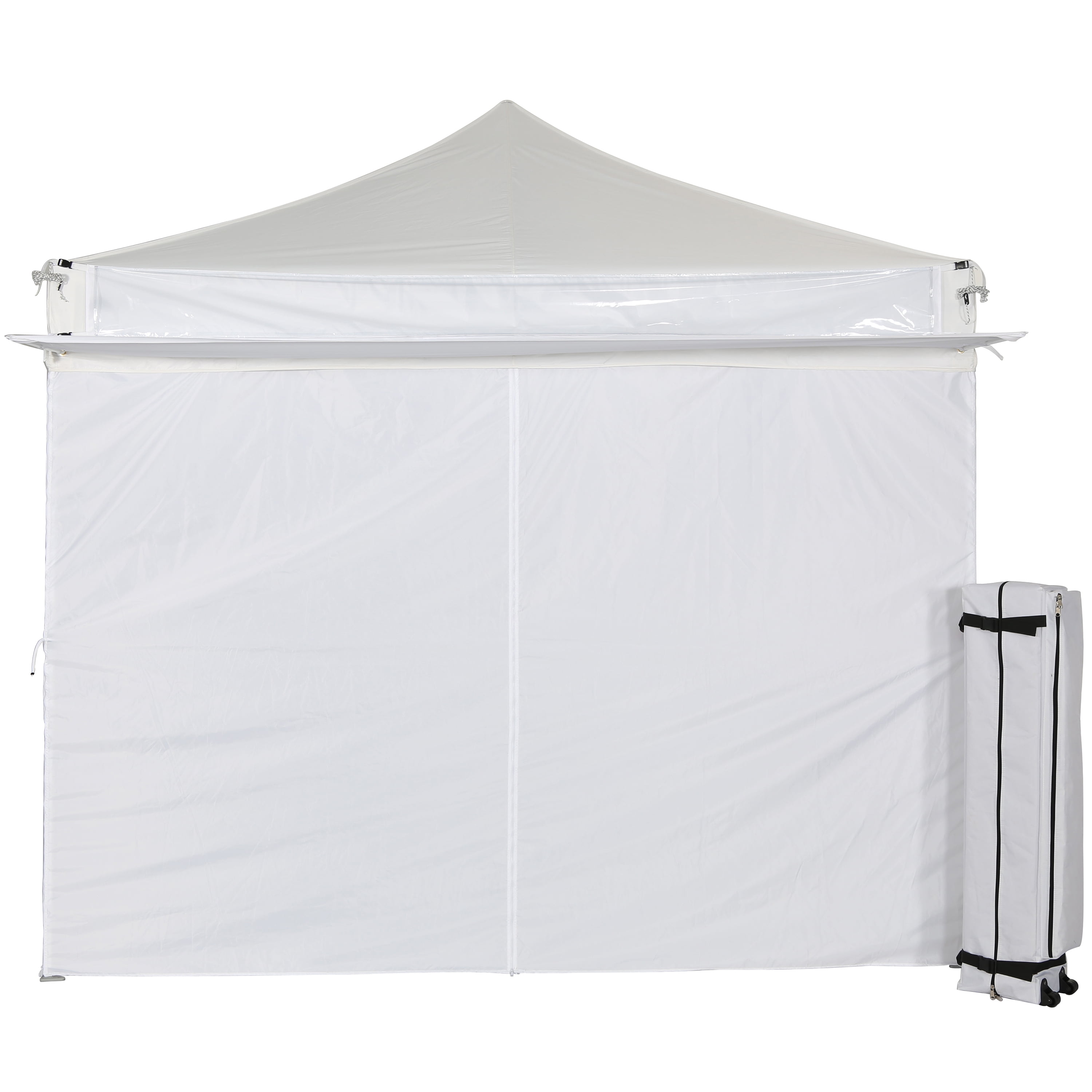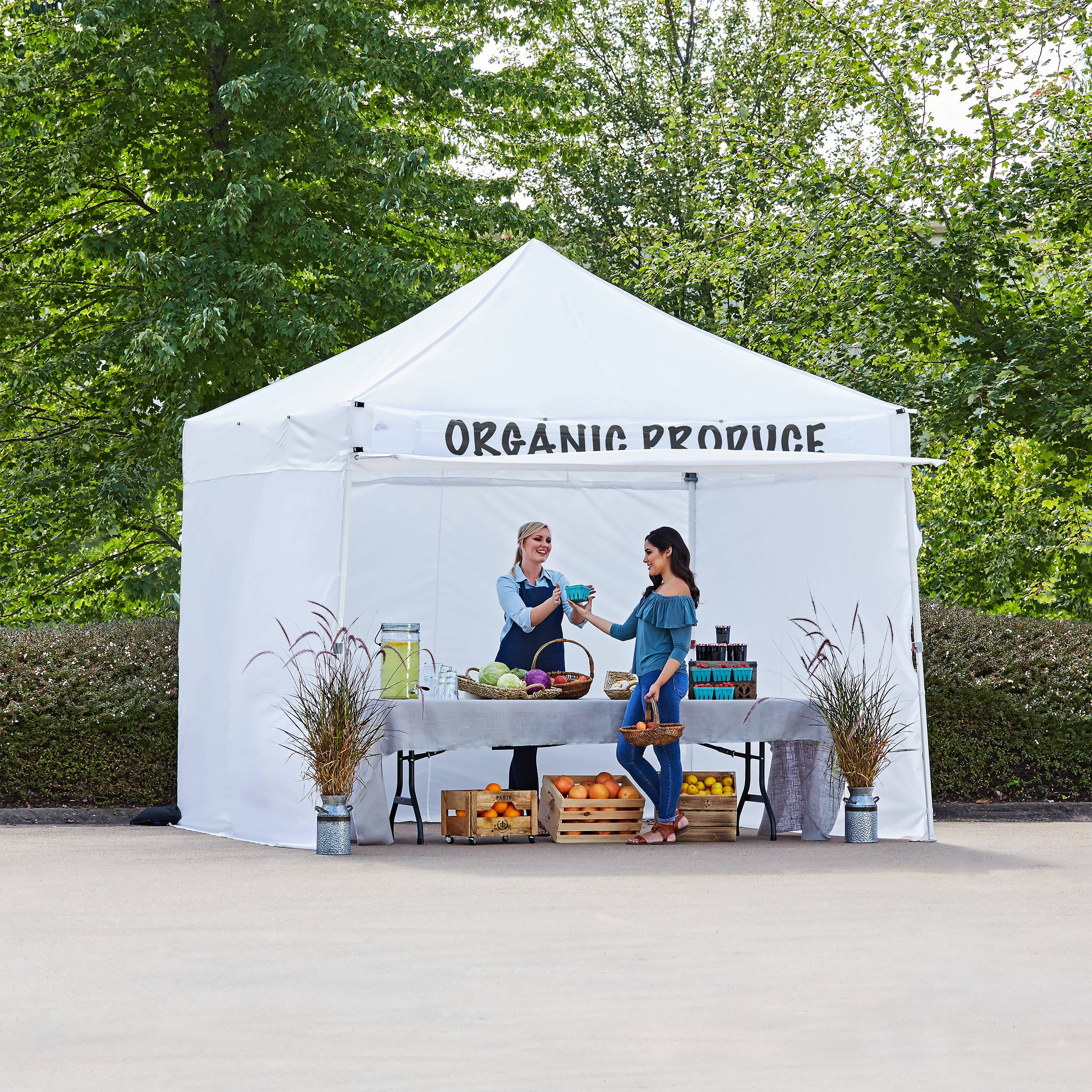 Push button locking for the frame and height adjustments Heavy 400D polyester top provides 99 percent UV protection and is water and fire resistant Four walls are included and one wall has a zipper for access under the canopy Also included are a banner holder, awning, stakes and guy ropes With a 50.5″ long storage size, our canopy can fit in most cars The roller bag has a pocket for storage of all of the accessories Frame is powder coated aluminum and steel for durability