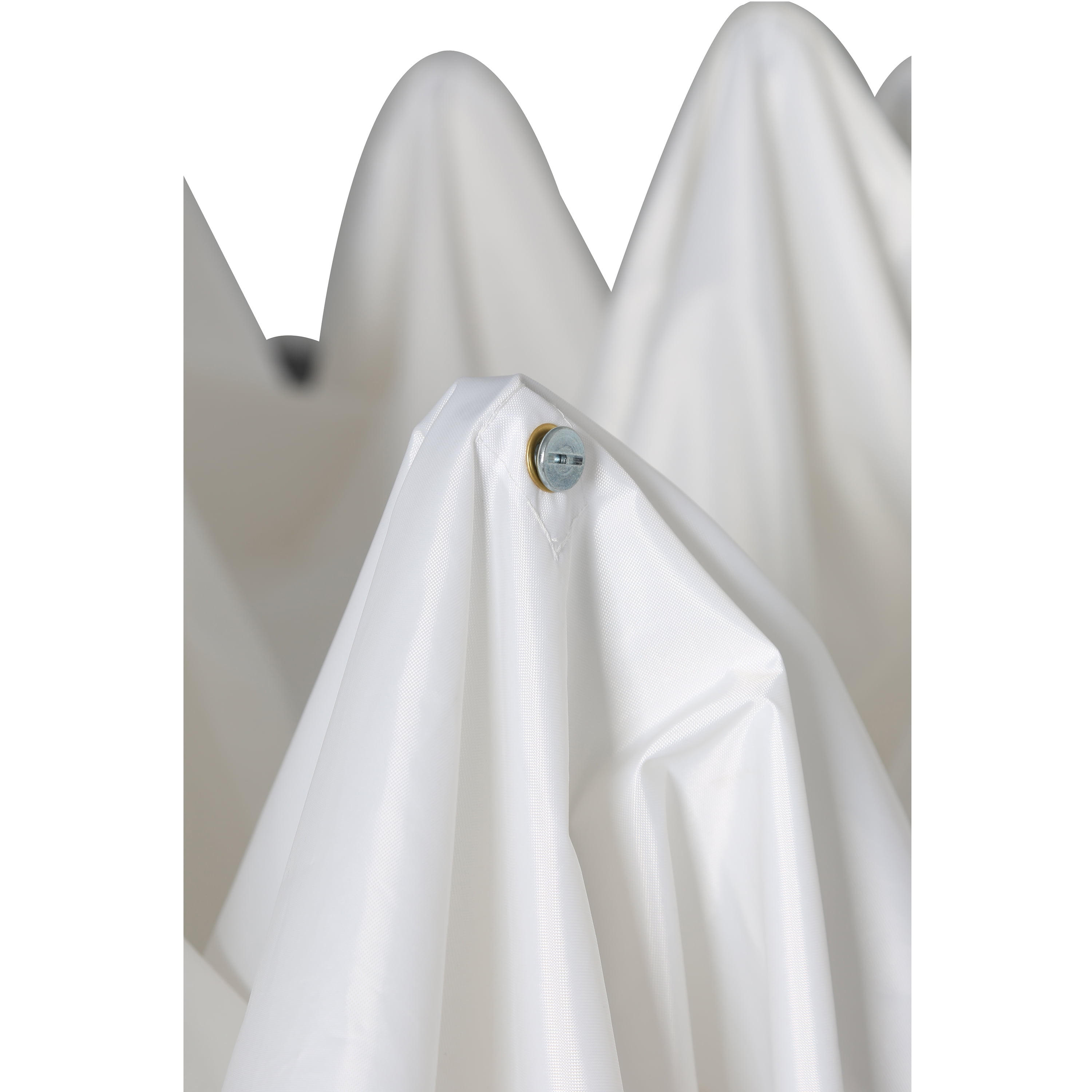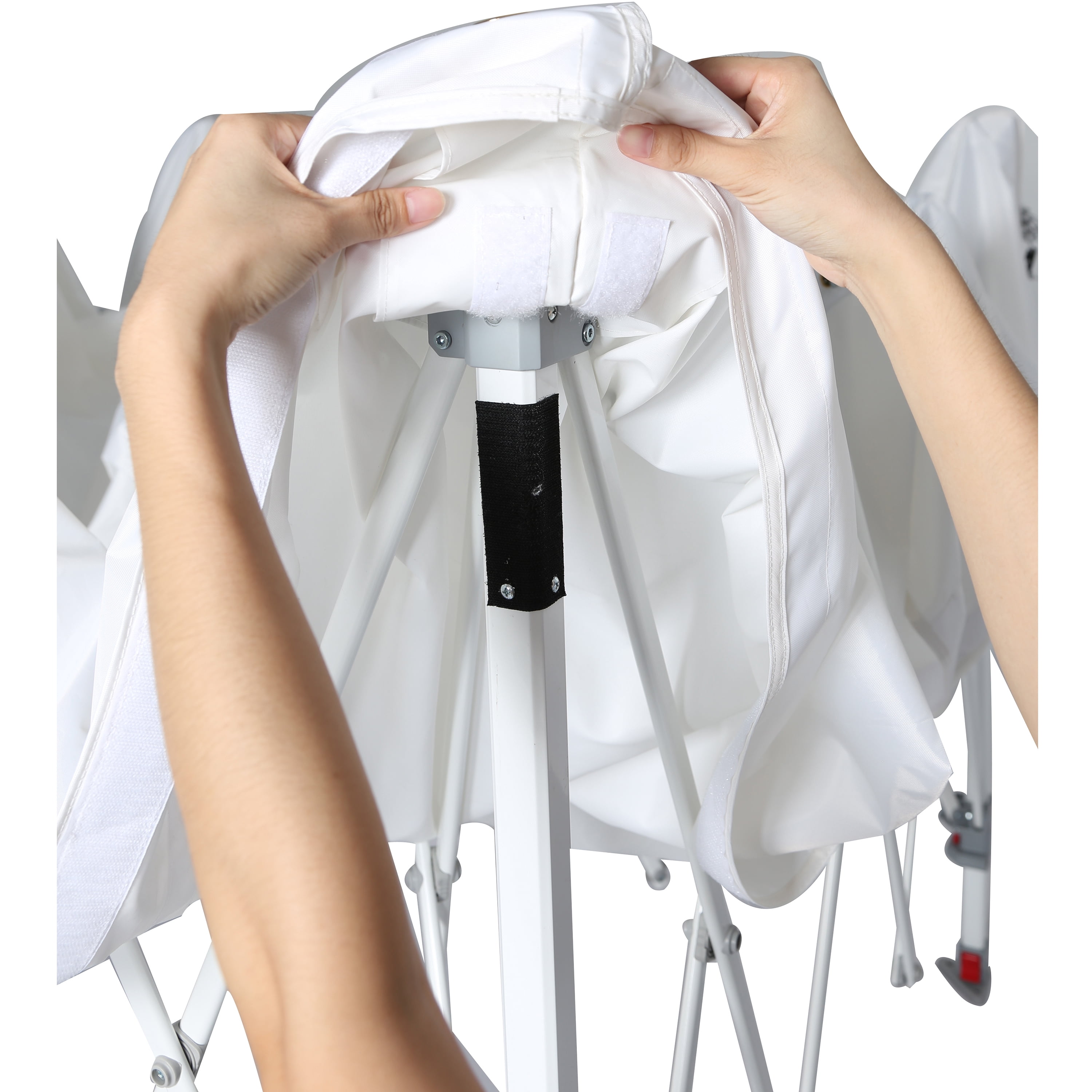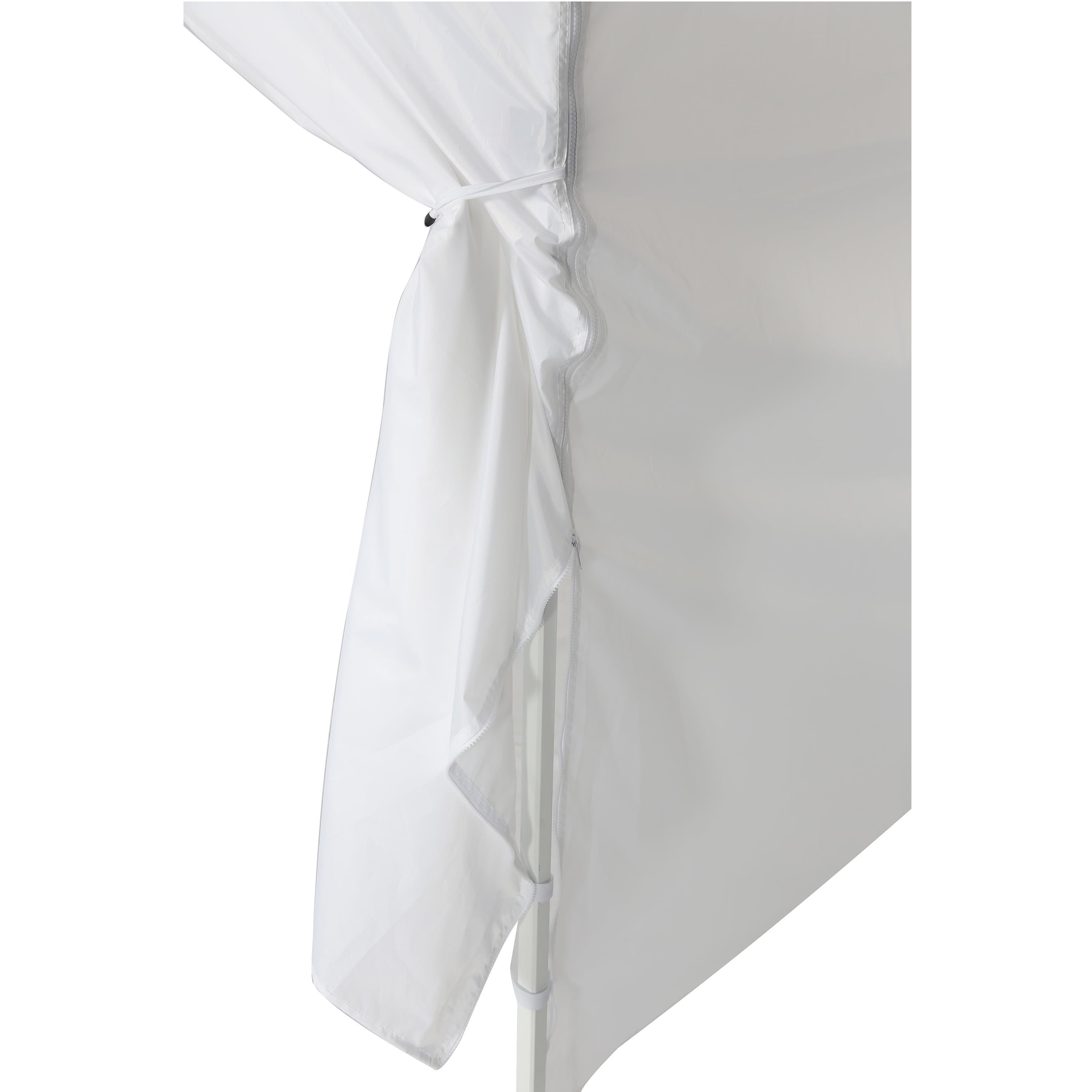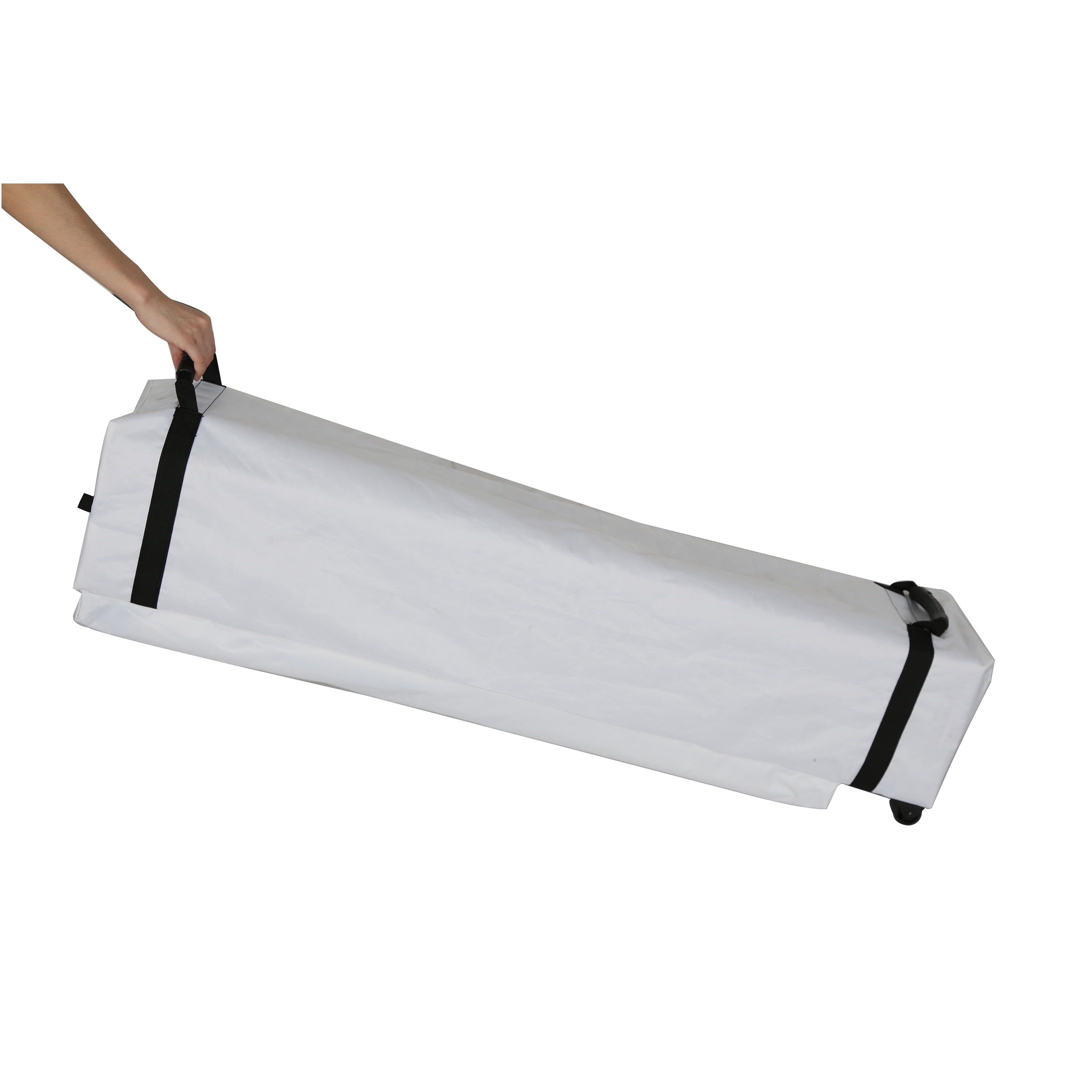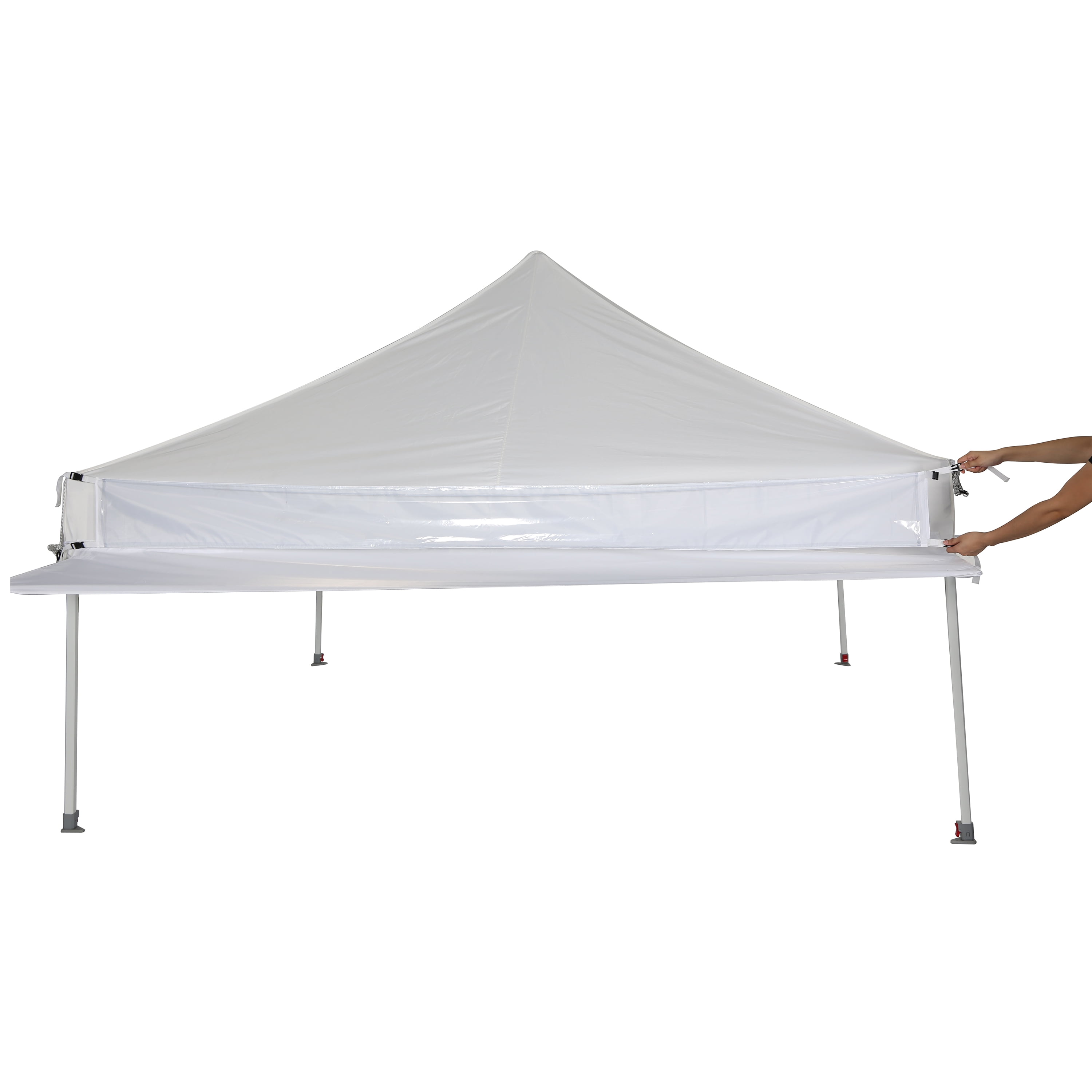 Push button locking for the frame and height adjustments Heavy 400D polyester top provides 99 percent UV protection and is water and fire resistant Four walls are included and one wall has a zipper for access under the canopy Also included are a banner holder, awning, stakes and guy ropes With a 50.5″ long storage size, our canopy can fit in most cars The roller bag has a pocket for storage of all of the accessories Frame is powder coated aluminum and steel for durability