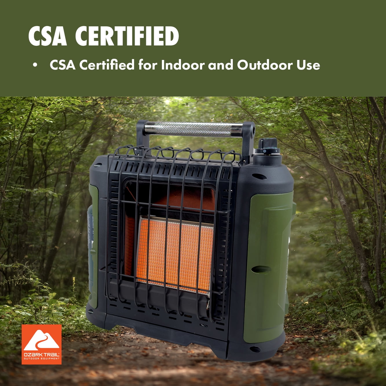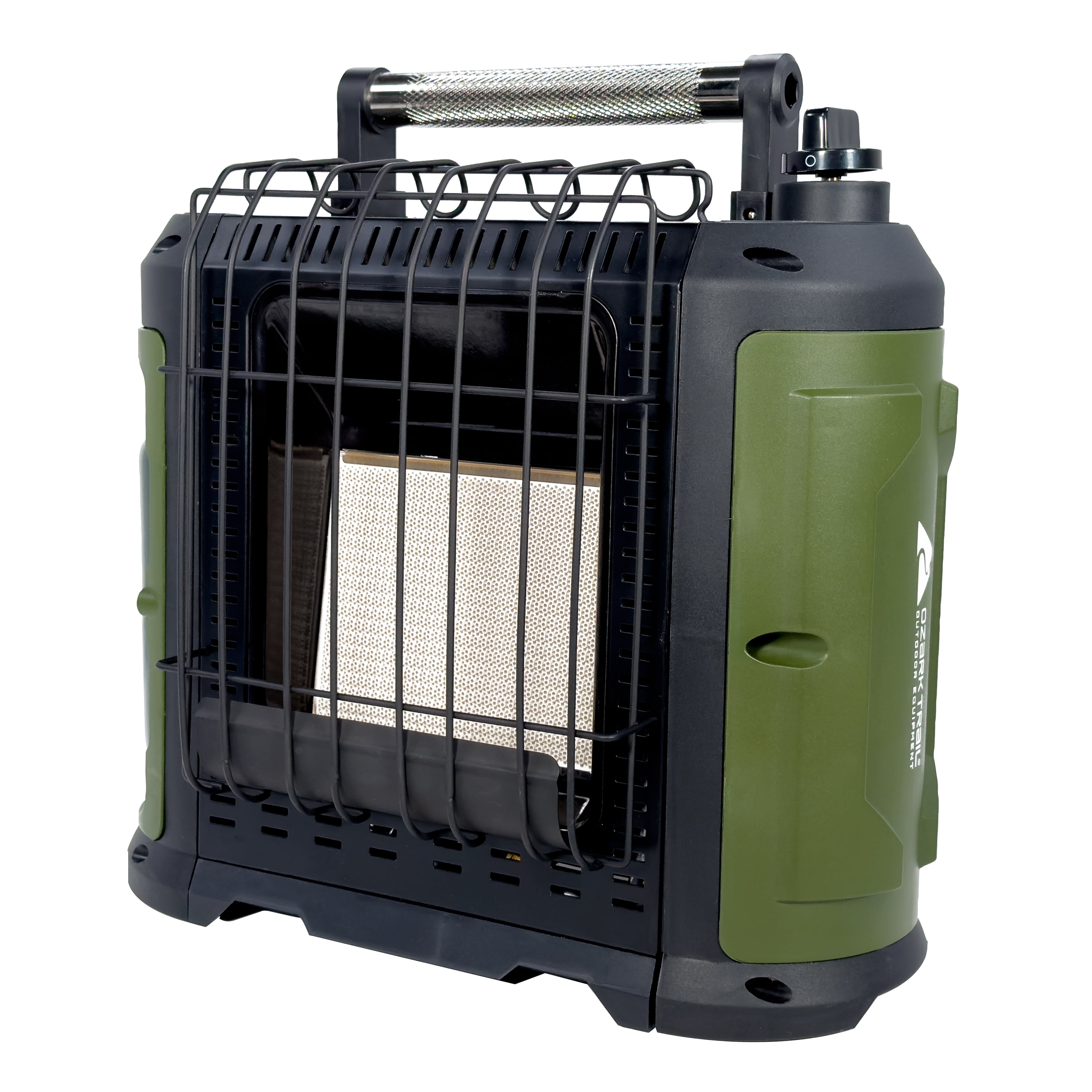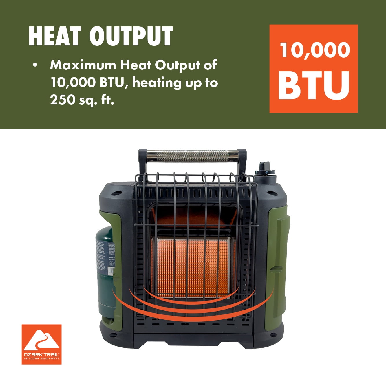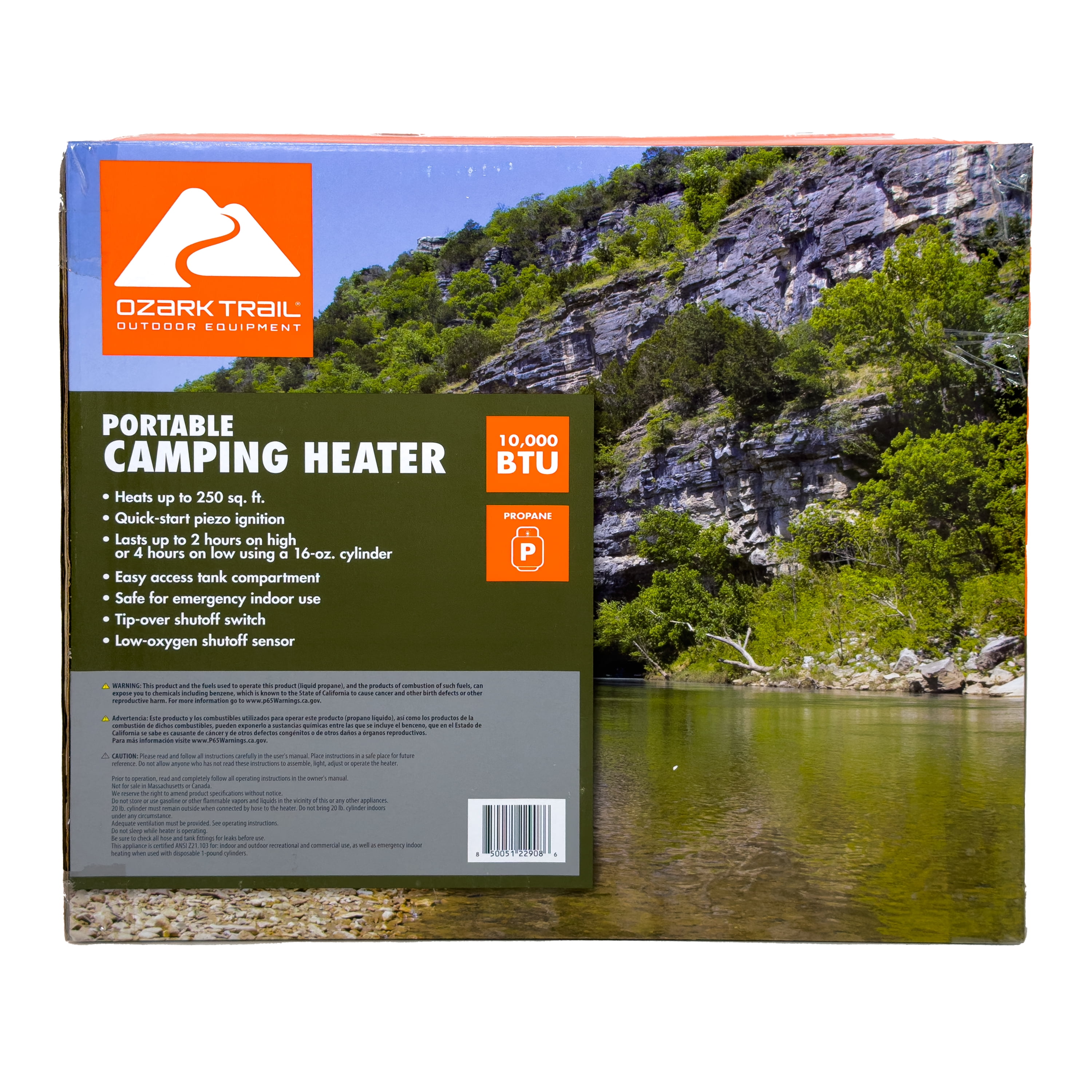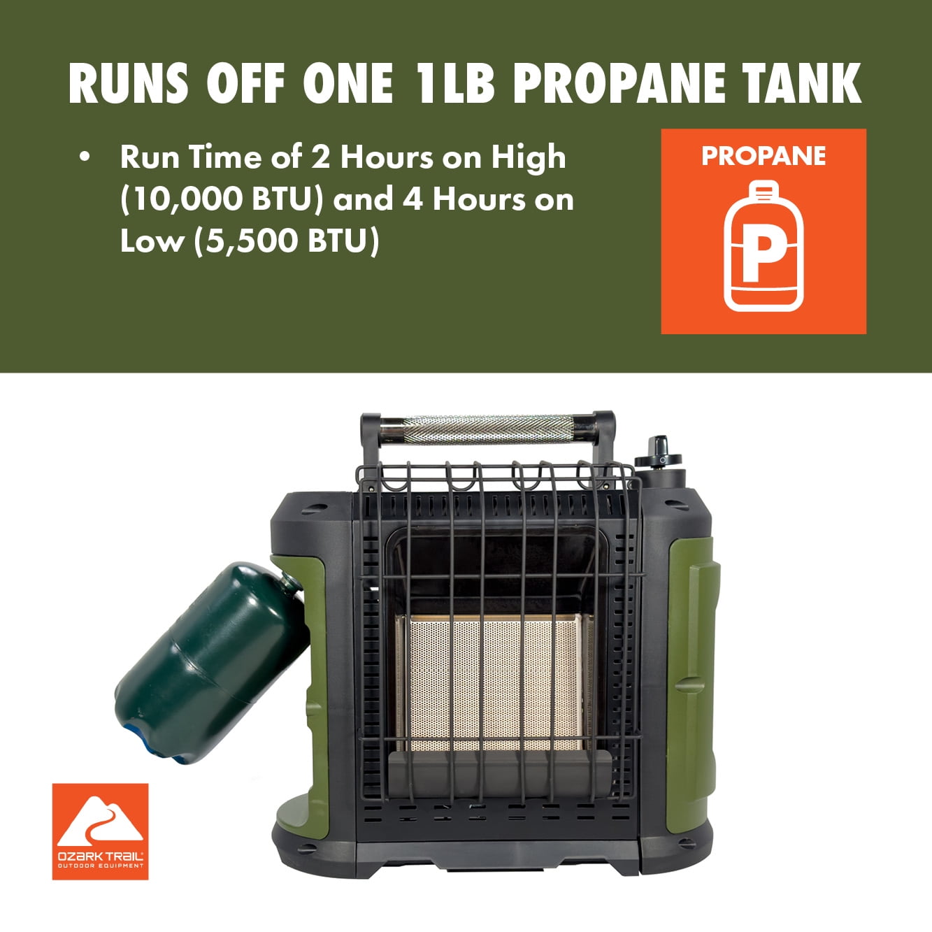 The Ozark Trail Portable Propane Heater provides great heat that you can take with you almost anywhere. With its durable styling and no need for electricity or batteries the Ozark Trail Portable Propane Heater is a great choice for heat in outdoor and emergency indoor situations. The Ozark Trail Portable Propane Heater has 2 heat settings that provide up to 10,000 BTU’s per hour on High and 5,500 BTU’s per hour on Low and also has a Tip Over Safety Switch and Oxygen Depletion Sensor for Safety. The Ozark Trail Portable Propane Heater utilizes one 1 lb propane cylinder – making it completely portable and able to be used inside in an emergency. When outdoors, you have the extra option of hooking up the Ozark Trail Portable Propane Heater to a 20 lb propane tank with the optional extension hose (Model HAKITDG) for extended runtime up to 45 Hours on High and 79 Hours on Low . The convenient carrying handle will allow you to easily move the heater to any location making it an outstanding solution for portable heating for sporting events, hunting, camping, fishing, garage/workshop, emergency indoor heating, backyard/patio heating, and many other uses.