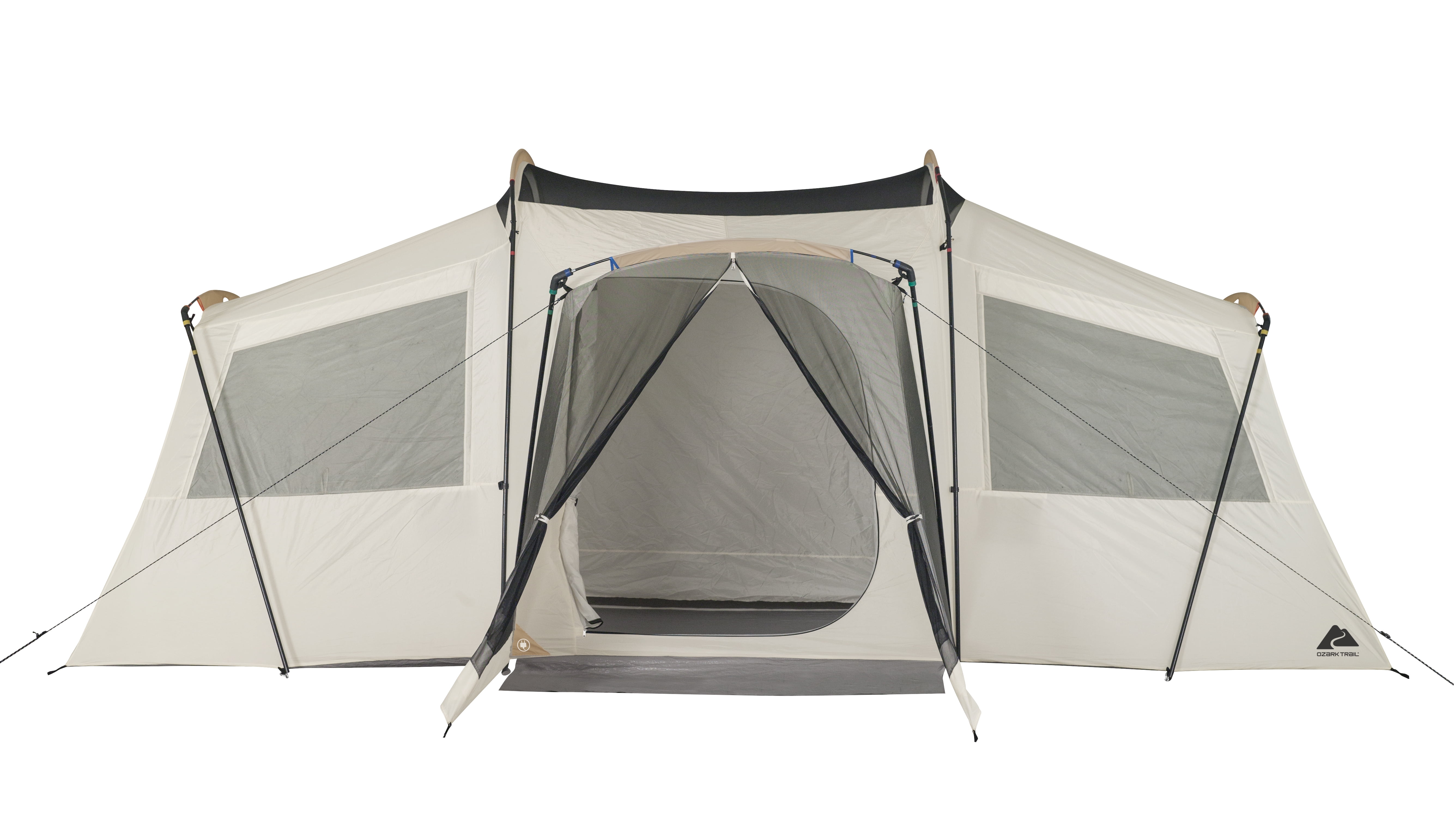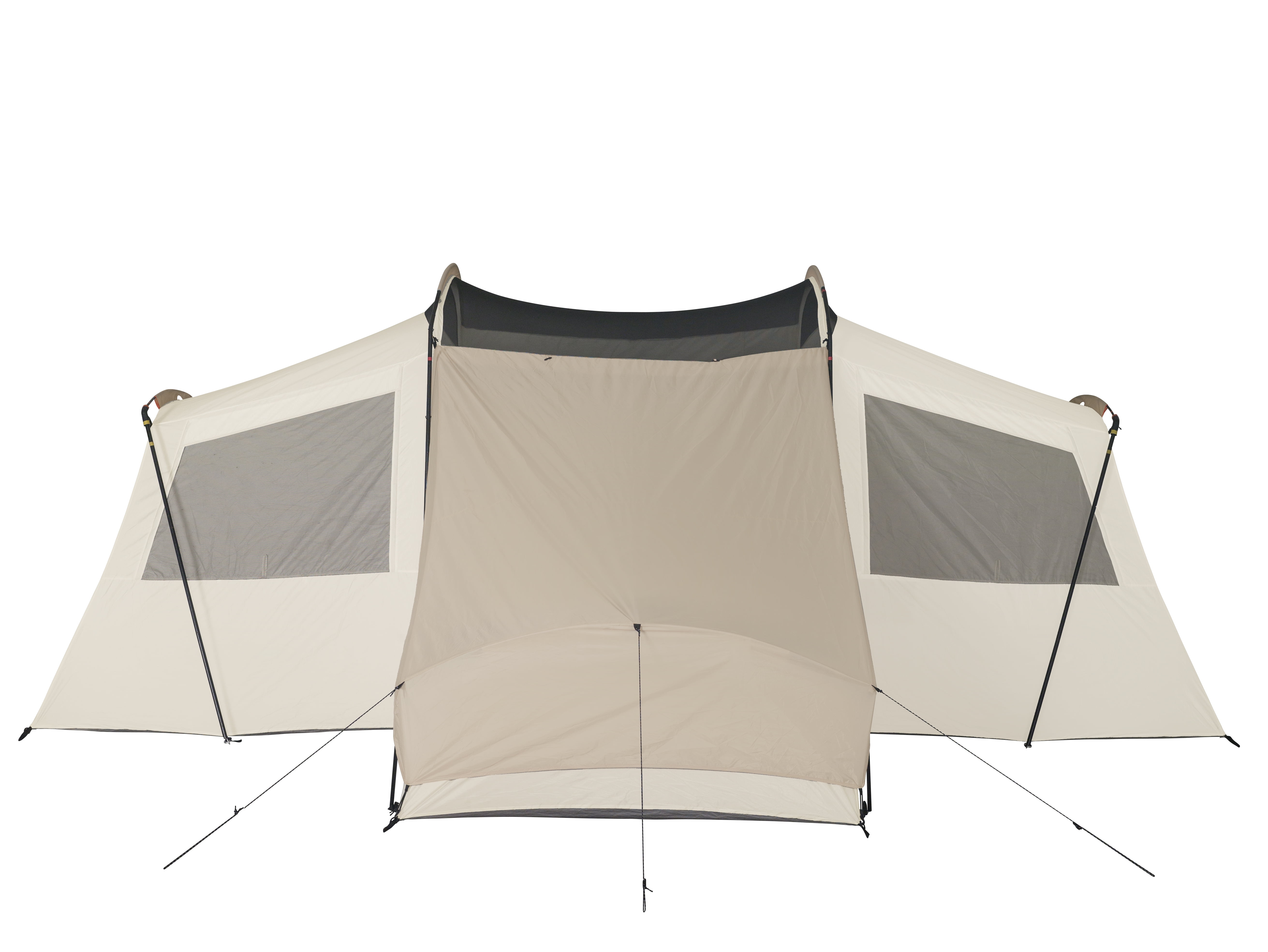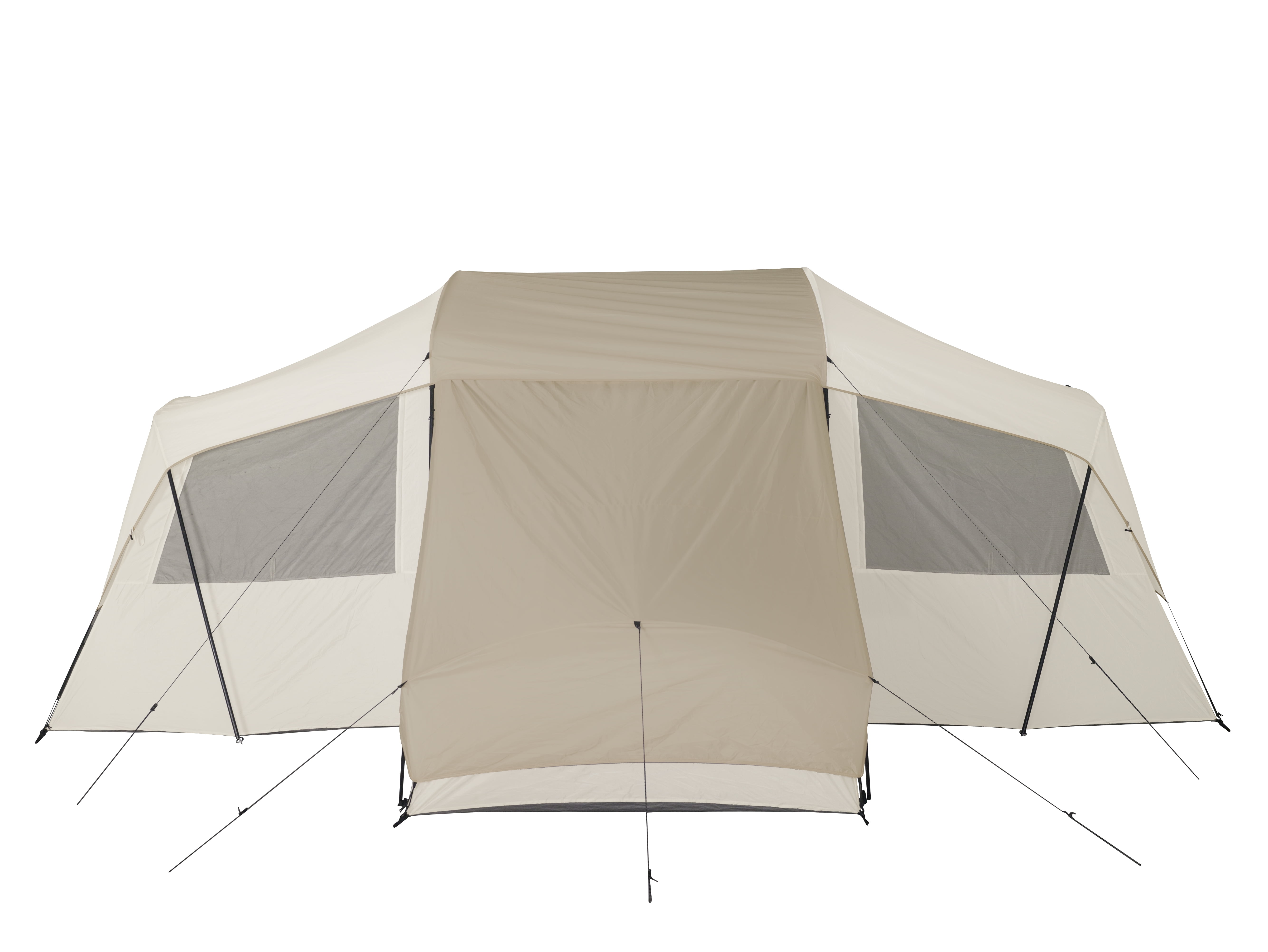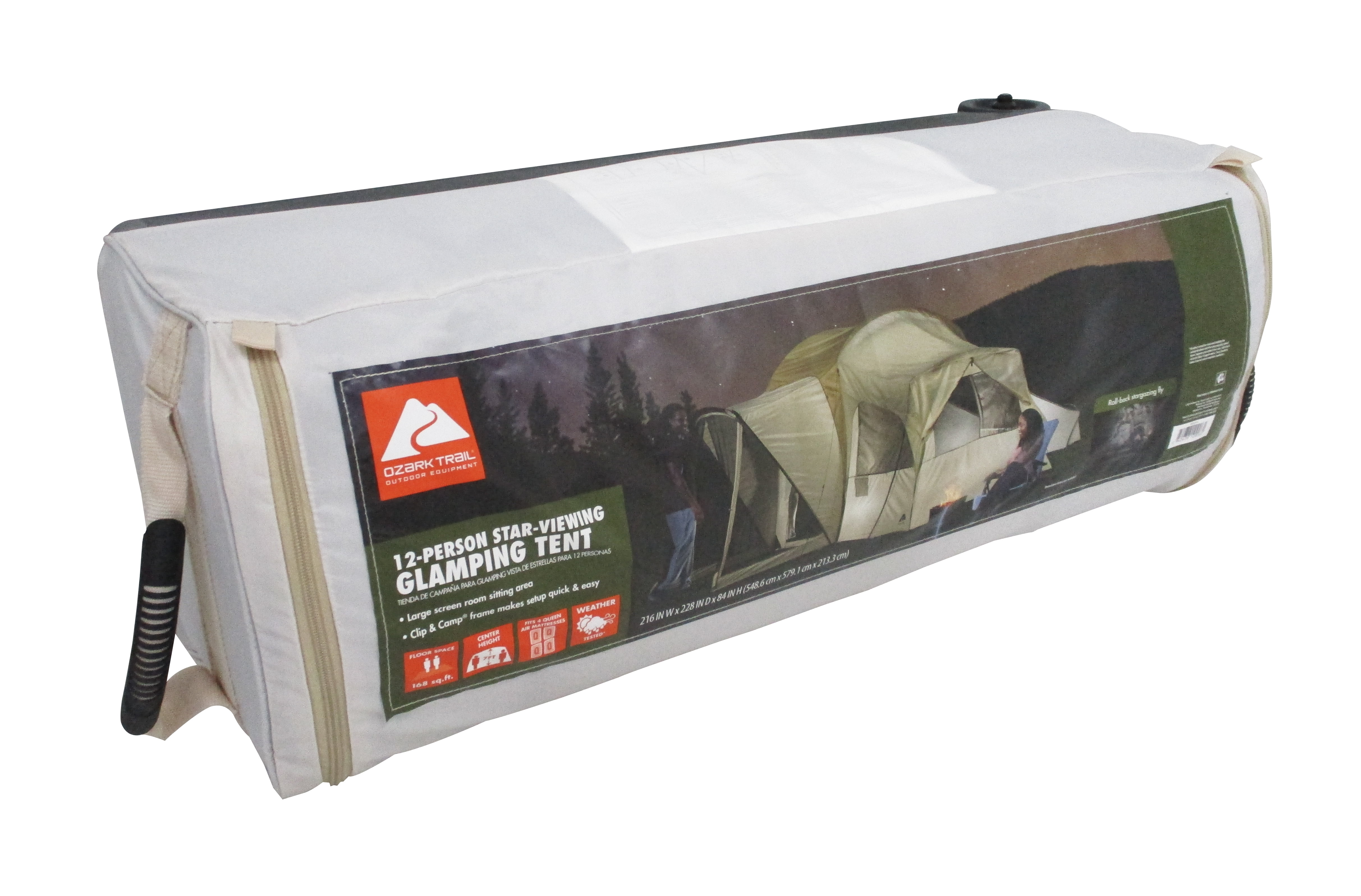 Spacious Glamping Tent for relaxing with family and friends Sleeps: 12 Large rear room with roll- back fly Large screen room sitting area 100 percent polyester with fiberglass frame. Chain corded free-standing frame system for easy set-up 6 windows and mesh roof for excellent ventilation Hanging shelves for storage Wheeled duffle carry bag 6-month replacement parts warranty