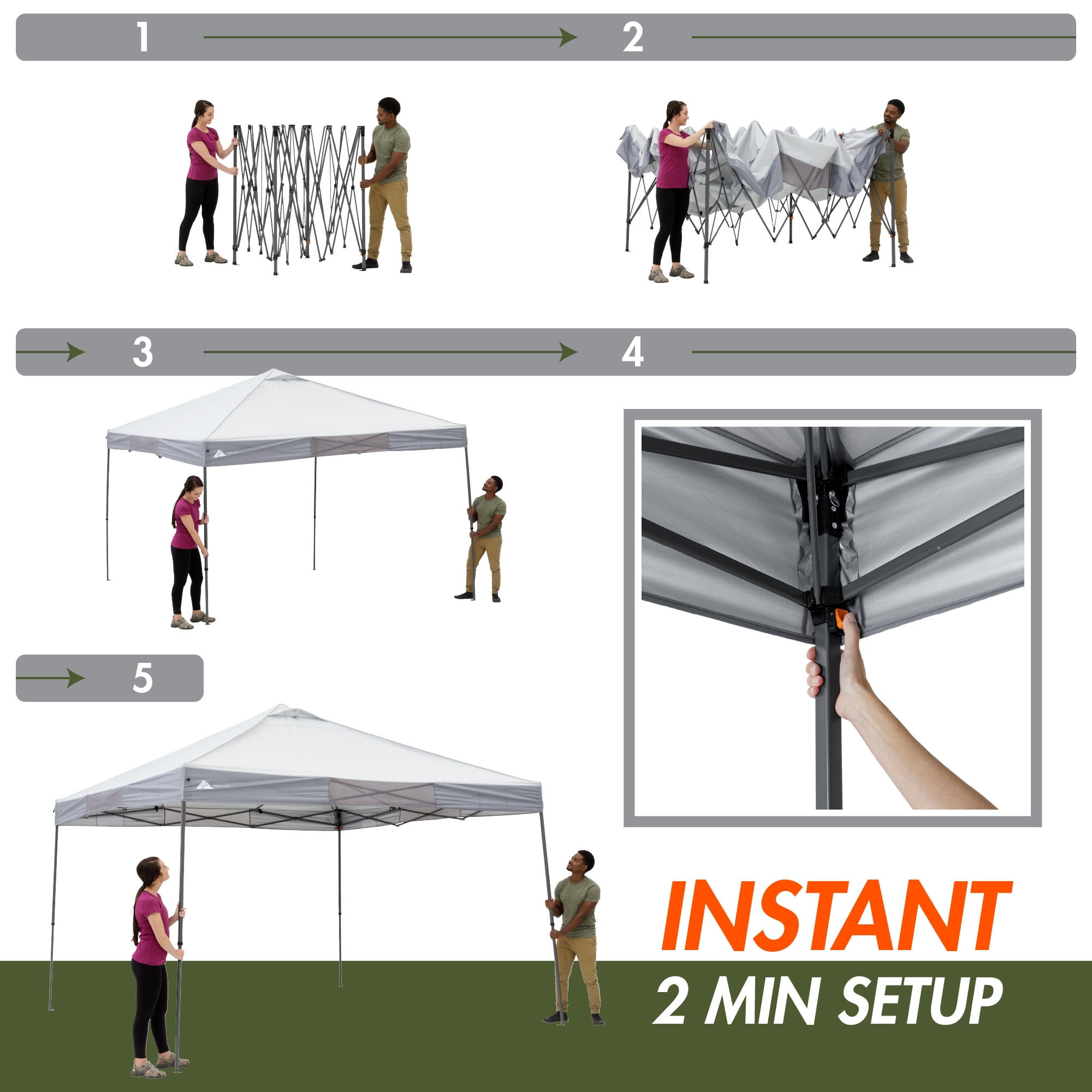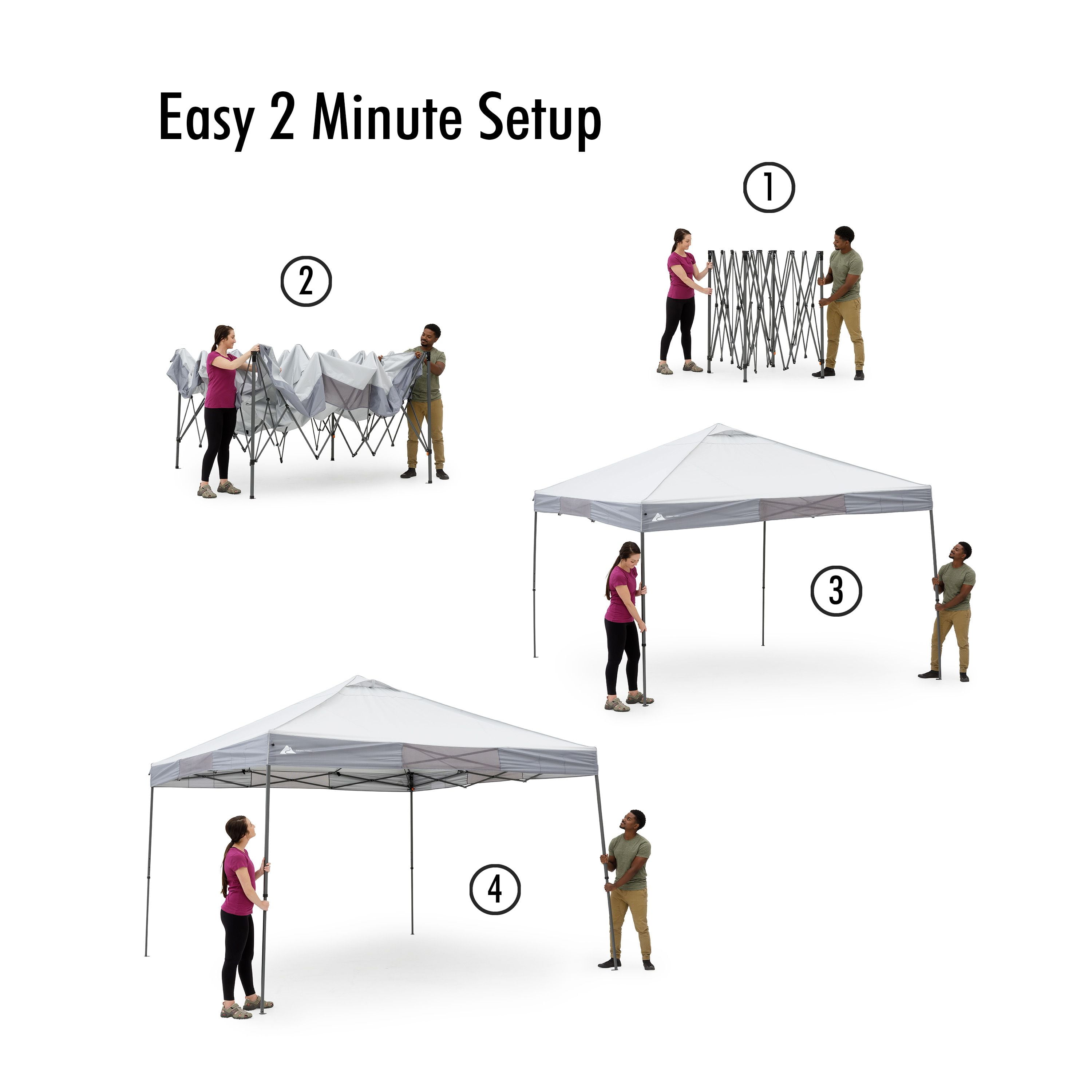 Make your tailgate, campout, or backyard party even more enjoyable with the Ozark Trail 12′ x 12′ Instant Canopy. It provides a true 144 square feet of cooling relief anywhere in just minutes. Simply extend the one-piece steel frame on this Ozark Trail instant canopy, attach the top, extend the legs, and you’re done. Adjust the shade as needed throughout the day with the easy push-button system. This outdoor instant canopy offers 50+ UV protection, so you’re guarded against the sun all day long. The top features dual roof vents and is easily attached with hook and loop fasteners to the frame. For additional circulation, simply open these two included adjustable vents. With the instant setup technology, it’s easy to have your Ozark Trail instant canopy up, having fun and grilling burgers in no time. Carry and transportation are made quick and easy with the wheeled carry bag to take it anywhere. Enjoy the outdoors with the Ozark Trail 12′ x 12′ Straight Leg Canopy.Adventure is where memories are made, whether it’s campouts in the backyard with the kids, Saturdays at the river with friends, or a week in the wilderness alone. Ozark Trail helps you and your family create everyday adventures with gear and accessories built with you in mind. From backpacks to tents, they’re rugged, dependable, and priced to be practical. Because adventure is not a destination; it’s a lifestyle.