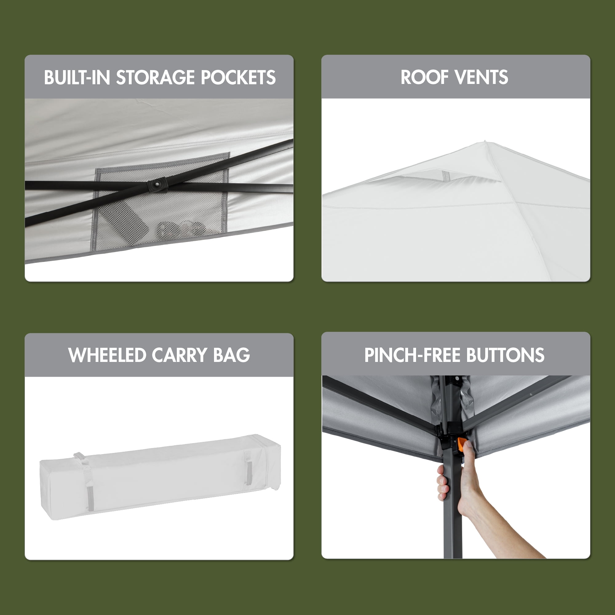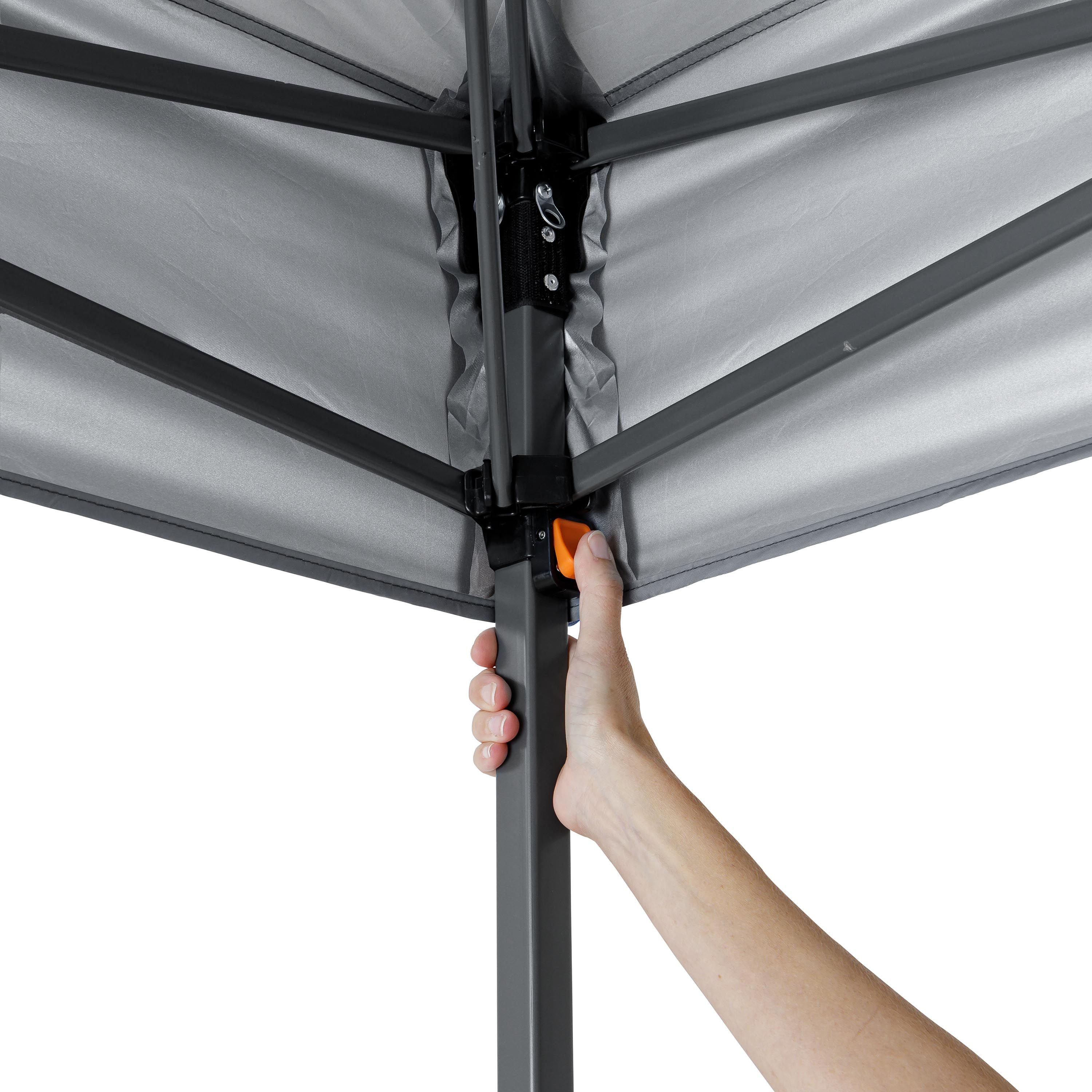 Sets up in just minutes 144 square feet of shade Easy push-button system for quick setup and takedown Heavy-duty polyester canopy and durable steel frame Canopy includes mesh pocket for storing small item like a wallet, sunglasses or keys Two roof vents and mesh panels for added ventilation Strong telescoping 3-position steel frame and feet for use on concrete or dirt UV 50+ protection to keep your cool and comfortable on warm summer days Attached guylines for added stability Includes wheeled carry bag Perfect for backyard parties, tailgates or campouts Dimensions: 12′ x 12′ x 122″ (H) Model Number: 30726
