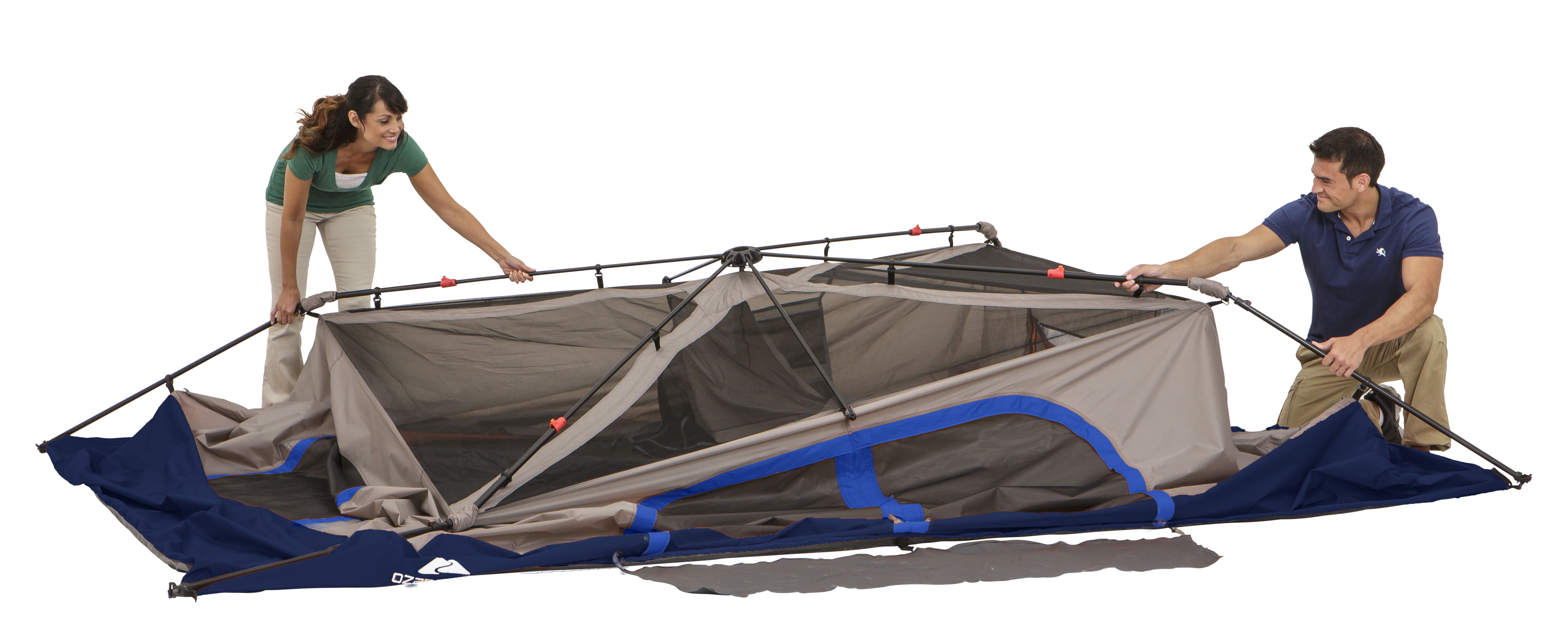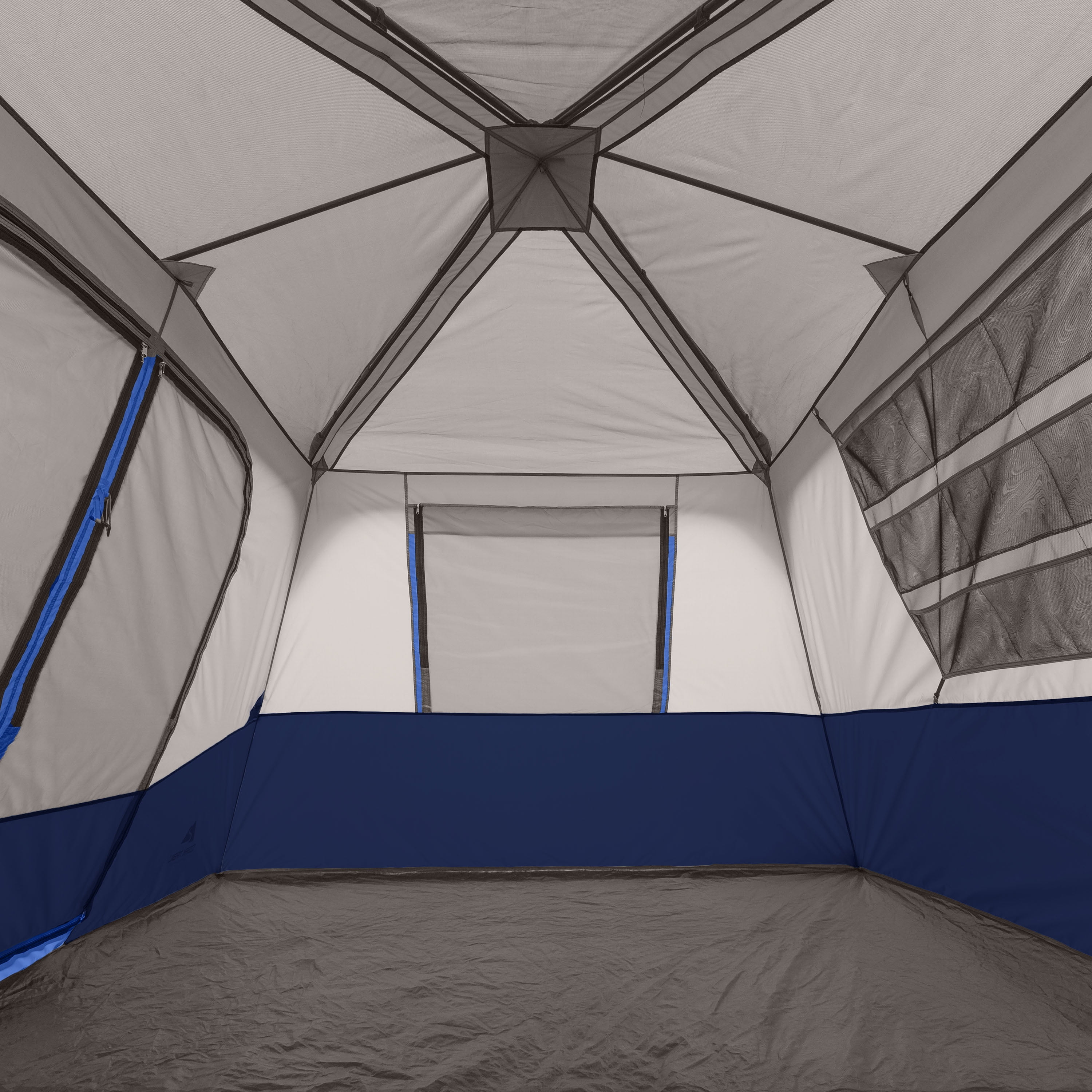 The Ozark Trail 8-Person Instant Cabin Tent sets up in under two minutes for easy and fun camping. This 8-Person tent requires no assembly because the poles are pre-attached to the tent. Just unfold, extend the legs, stake the feet and you are ready to camp. The two-room, cabin style tent has 360 views with windows on all sides and room to stand up with a huge 72-inch center height. It comfortably fits two queen airbeds or up to 8 campers in sleeping bags on the floor. Keep all your gear organized with the included hanging gear organizer. Also included are tent stakes to secure the tent, and a carry bag for easy portability and storage when not in use. Stay dry on those rainy evenings with the rainfly with factory sealed seams. Make the most of your next outdoor camping adventure with the Ozark Trail 8-Person Instant Cabin Tent.
