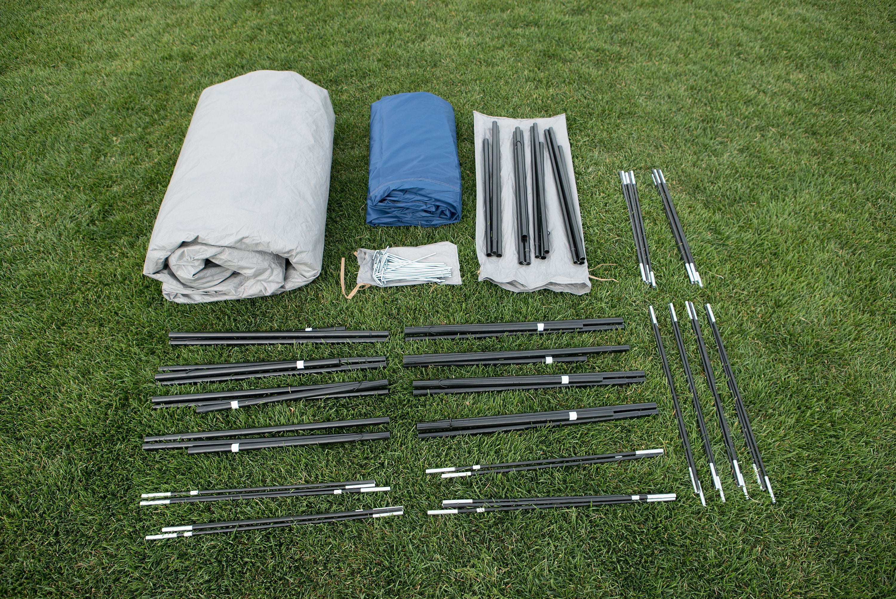 Ozark Trail 14-Person Family Tent With 3 Doors, 18′ x 18′: Features: Sleeps up to 14 people in sleeping bags Spacious interior fits 3 queen air mattresses Contains hanging organizer pockets for convenient storage of small, lightweight items E-port for convenient electrical cord access One movable hanging media pocket holds a tablet for group viewing Covered entryway provides a protected entrance into tent Four easy-access D-style doors have windows that zip for privacy or roll down for increased ventilation 78 in. center height provides cathedral ceilings for walk around room Large windows zip open to convert one side of tent into a screen room area Eight windows and a mesh ceiling provide cross-ventilation while keeping the bugs out The windows of the tent zip up to provide extra privacy and protection from rain A mesh roof provides excellent star-gazing opportunities and extra ventilation Front screen porch area for bug-free outdoor enjoyment Three rooms with separate doors for easy access One removable room divider allows you to choose whether you want one big room or two separate rooms Removable fly with taped seams for weather protection Pre-attached corner molds simplify set-up Six guy ropes provide stability Easy to assemble with a pin & ring frame attachment system Packed inside a convenient-to-carry duffle with expandable bottom Dimensions: Floor Dimensions: 18 ft. x 18 ft. Center Height: 78 in. Floor Area: 203 sq. ft. Packed Size: 27.5 in. x 11.8 in. x 11.8 in. Carry Weight: 35.7 lbs. Specifications: Sleeping Capacity: 14 people Tent Body Fabric: Poly Taffeta 185T 600mm Floor Fabric: Polyethylene Rainfly Fabric: Poly Taffeta 185T 600mm Mesh Fabric: Poly Mesh Carry Bag Fabric: Poly Oxford 600D Frame Material: Fiberglass and Steel Poles Number of Seasons: 3 Number of Rooms: 3 Number of Doors: 3 external & 2 indoor Number of Windows: 8 Number of E-ports: 1 Number of Media Pockets: 1 Number of Wall Pockets: 3 Number of Bottle Pockets: 3 Number of Poles: 6 Fiberglass & 2 Steel Number of Guy Ropes: 6 Number of Steel Stakes: 17 Average Set-Up Time for 2 people: 20 minutes Additional Information: 1-Year Limited Warranty Assembly required. Instructions are sewn into the carry bag and can also be downloaded from the Manuals & Guides section below. For product questions or replacement parts, please contact our Customer Service Department at 1-833-908-2025 or email [email protected] Model No.: W731