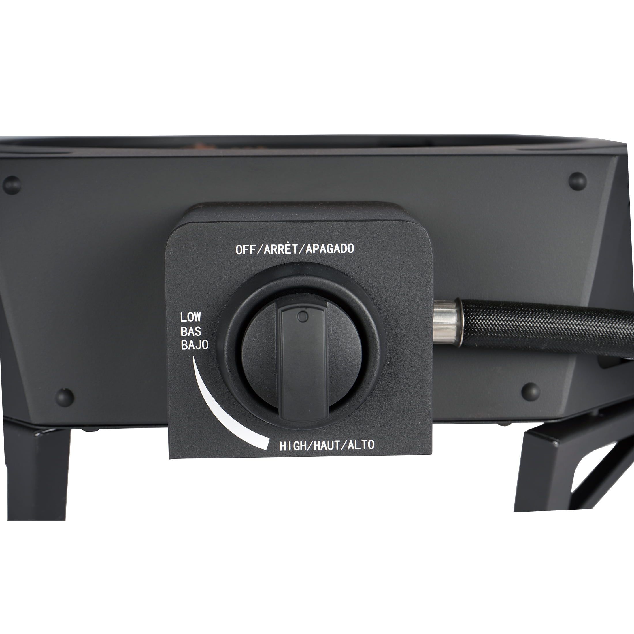 Ozark Trail 15″ 54,000 BTU Propane Black Steel Portable Fire Pit with Locking Lid Includes a locking lid with handle for carrying portable fire pit one-handed Control panel design to easily change the flame’s intensity Total 54,000 BTU output with an 11 ft heat radius Use with 5, 10, and 20 lbs propane tank (not included) Included lava rocks for even heat and flame distribution Firepit comes with 6 ft hose and regulator One-hand integrated ignition 15″ L x 15″ W x 7.1″ H, and 15.6 lbs