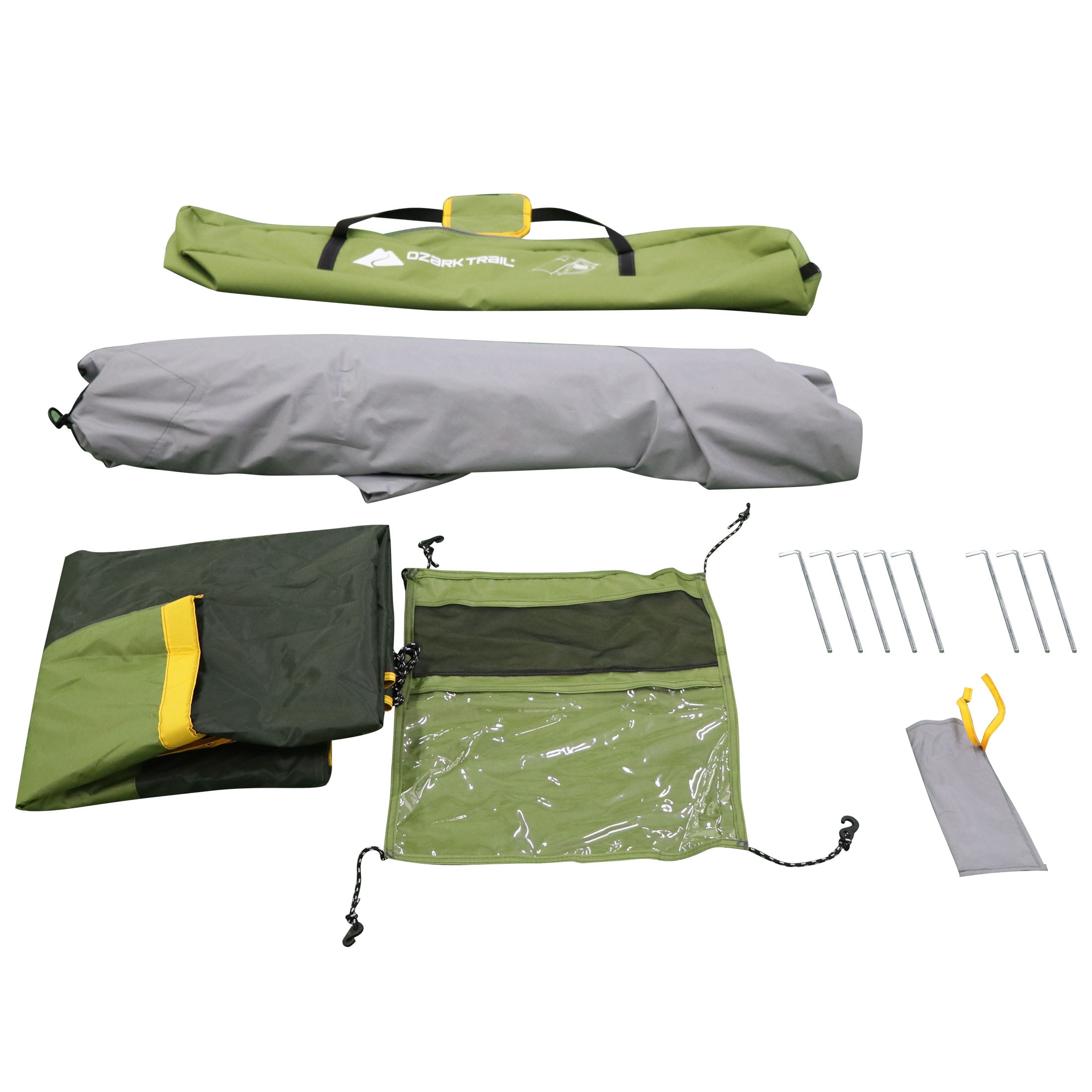 The Ozark Trail 2P Hub Tent is perfect for compact shelter while you are in the wilderness. Designed to comfortably hold 2 people and at just under 8 pounds, this tent provides adequate shelter in a small package to save you on storage and transportation space. When camping, there’s nothing worse than a tent that’s too hard to set up. That’s why this tent was designed with a simple to use fiberglass hub style frame that sets up in minutes so you can spend more time relaxing. Also included is four mesh vents and one rear window to provide ideal ventilation. Want to add a few comforts of home while camping? If so, there is an E-port for connecting power and a tablet holder for devices, as well as mesh pockets on the interior. Before heading out on your next camping trip, make sure to grab the Ozark Trail 2P Hub Tent. Maximum Occupancy 2 persons. Color is Green. 2-Person tent, pop up hub tent. Instant Tent. Weight: 11.88 lbs.