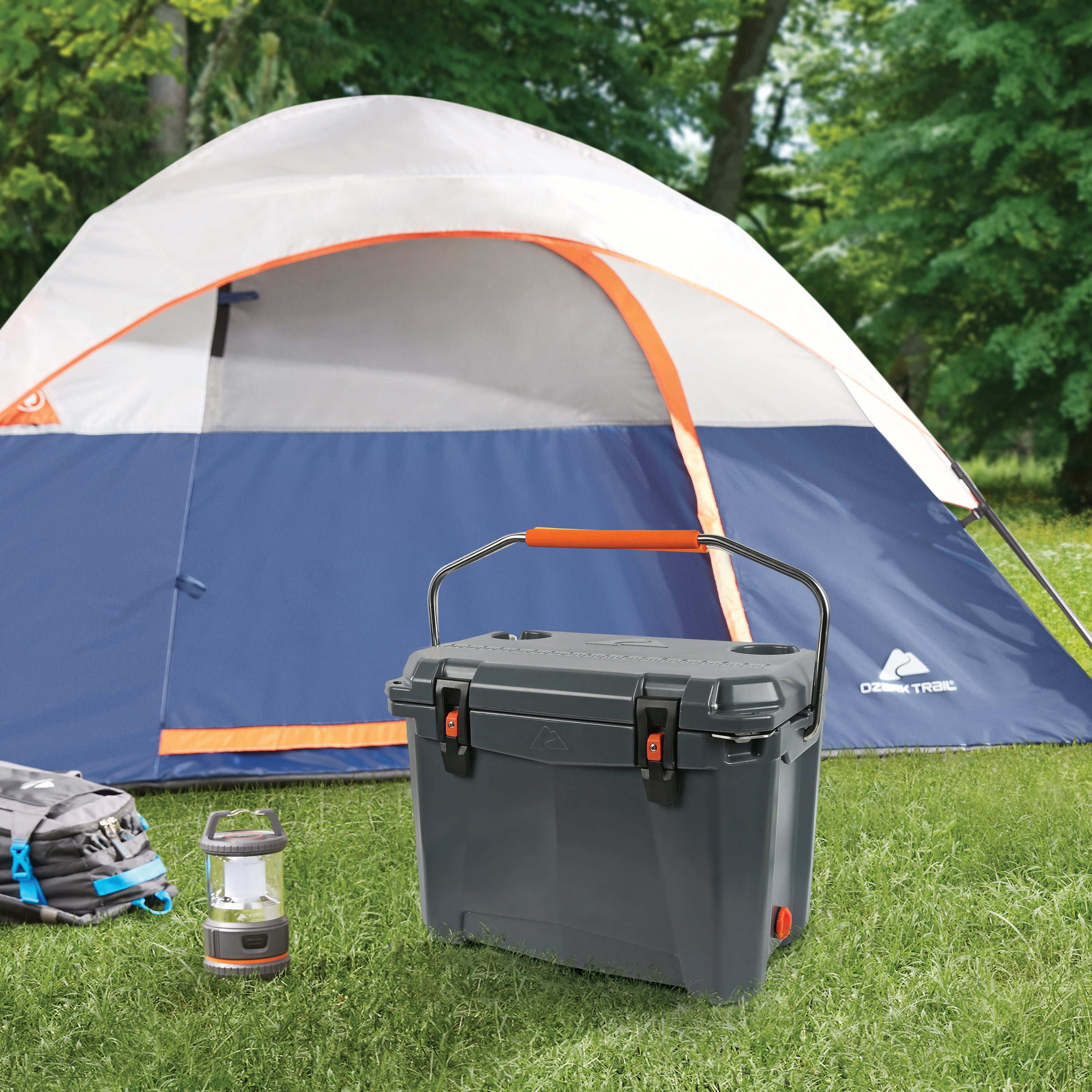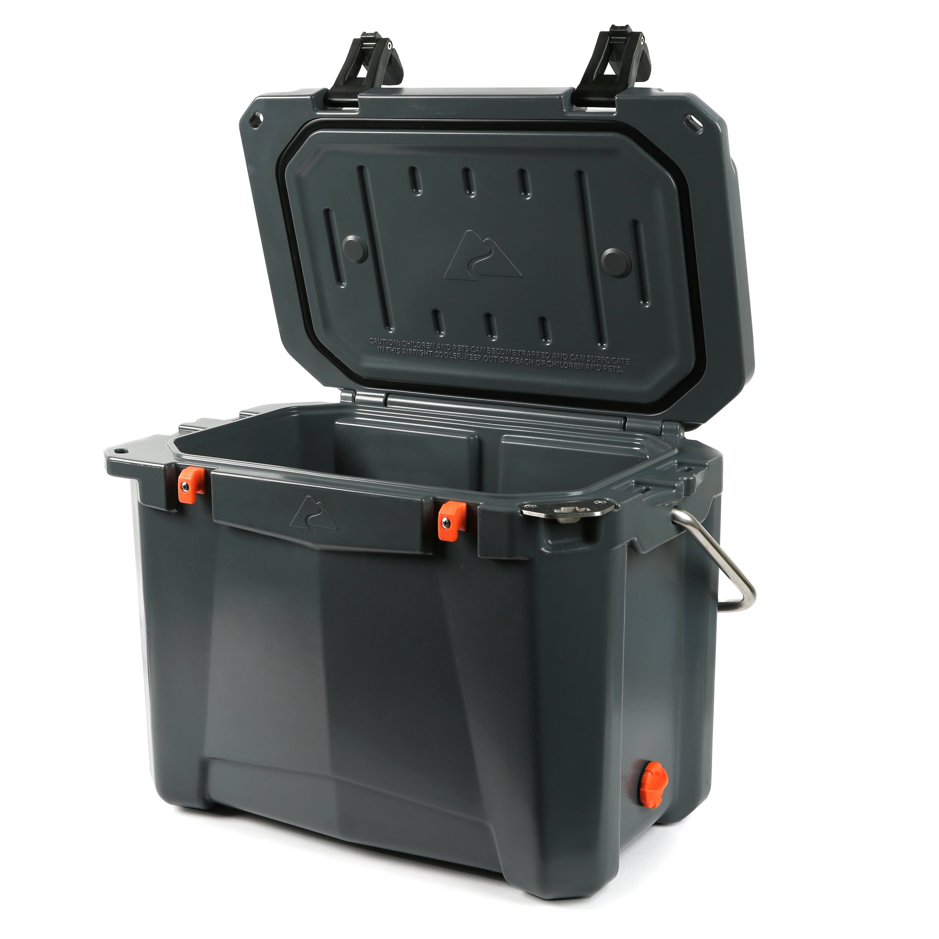 Ozark Trail 26 Quart High Performance Roto-Molded Cooler with Microban®, Grey Premium insulation keeps ice for days Portable cooler is roto-molded, seamless, one-piece construction with UV-resistant exterior Air-tight, super-seal gasket keeps the cold in and the heat out Includes new, easy open cam latches Heavy duty handles with comfort grip Industrial strength, stainless steel locking plate with built-in bottle opener Certified bear-resistant by the Interagency Grizzly Bear Committee With fish ruler and 2 drink holders on lid Limited 5 Year Warranty Check out all Ozark Trail products! ‘s Ozark Trail Brand has ice chests and coolers for all of your needs. Our range includes soft and hard coolers for camping, hydrating, toting and rolling – Ozark Trail can keep you cool all summer long! Assembled Product: Assembled Product: Assembled Product Height 13inx15.5inx21.25in. Product Weight 14.66 lb. Coolers holds 24 cans. Color: Gray
