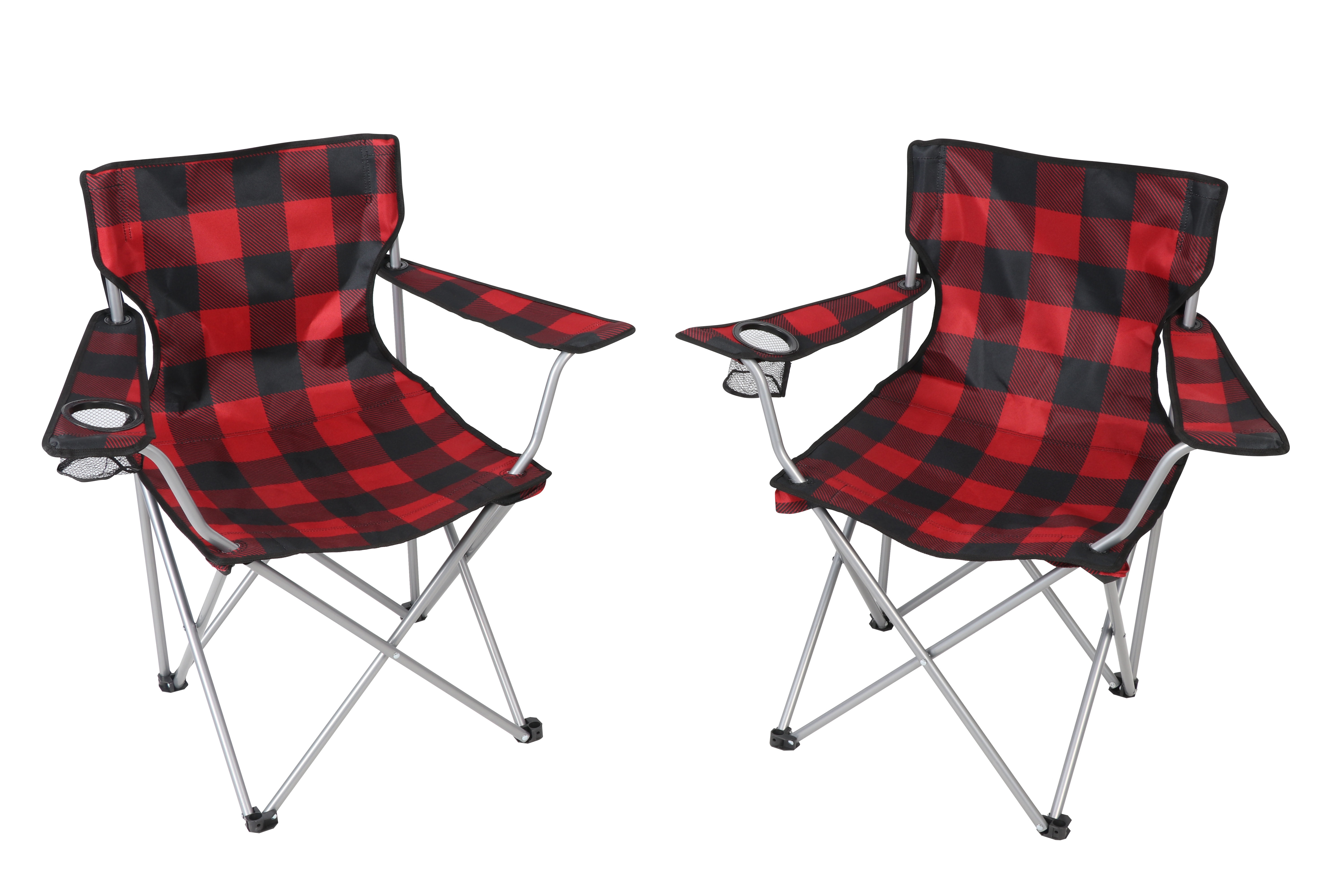 Ozark Trail Buffalo Plaid Camping Chairs and Blanket Combo, Red: 3-piece combo set with 2 quad folding chairs and one blanket Chairs feature a durable steel tube frame with powder coating Blanket made with durable 600D polyester Blanket and chairs perfect for picnics, tailgating or camping Includes carry bag for easy storage and transport Easily folds for convenient carry and storage Weight capacity: 250 lbs. Chair product dimensions (inches): 32” x 19” x 32” Blanket product dimensions (inches): 59” x 78.7” Adult use Red and black chair