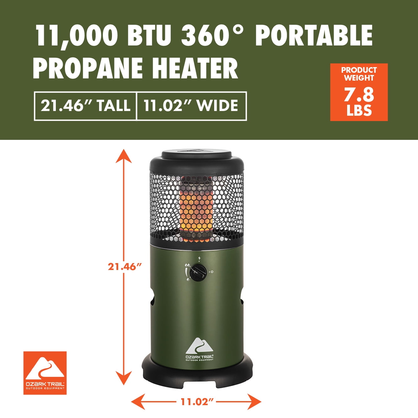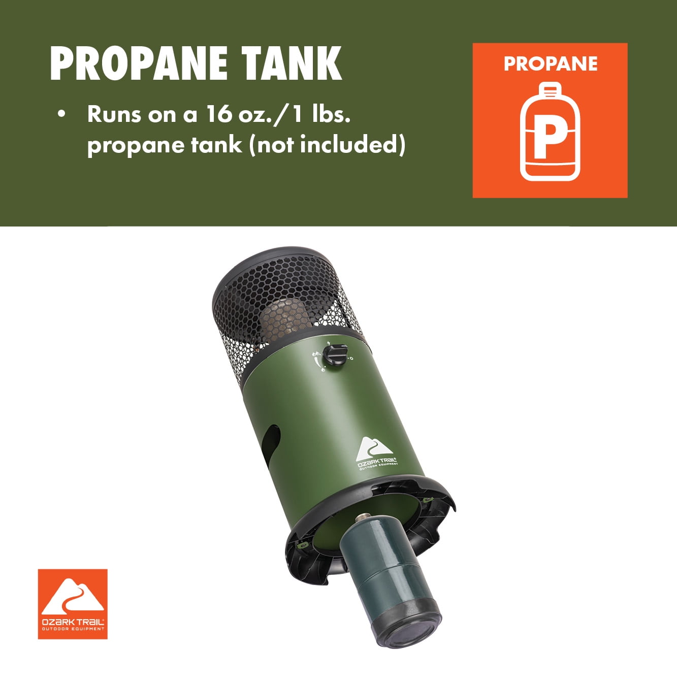 The Ozark Trail Flare 360° Propane Portable Indoor/Outdoor Heater, Green provides 275 sq. ft of heat all-around for your patio get-together or camping weekend. Share stories in the cooler months outdoors thanks to the heater’s 11,000 total BTUs. When used indoors, a low-oxygen shutoff sensor turns the propane gas off if there’s not enough oxygen in the room. A tip-over safety switch will also turn off the heater if it’s knocked over. This heater uses a 16 oz./1 lbs. propane tank (not included).
