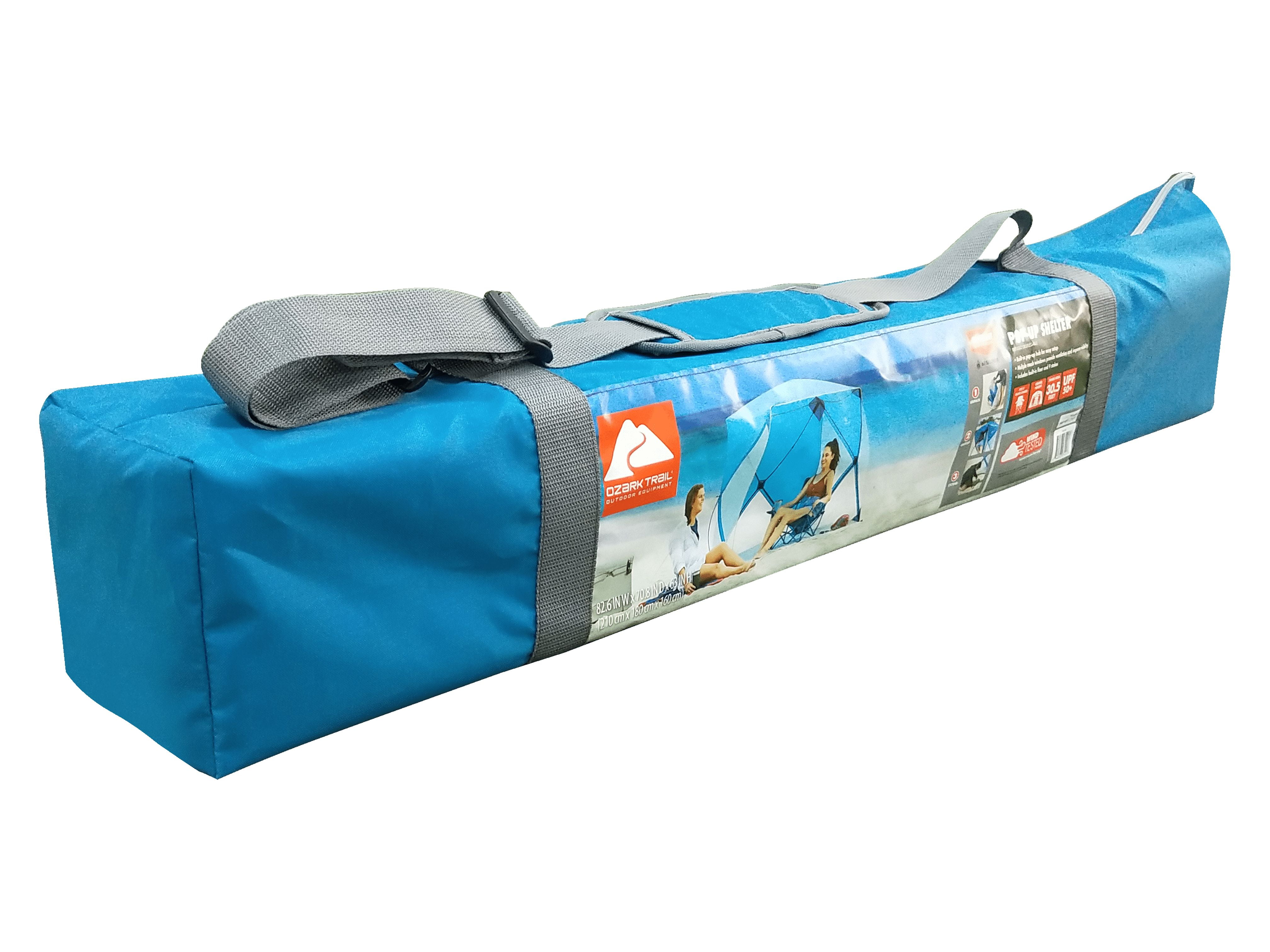Ozark Trail 6.8 ft x 5.9 ft Pop-up Beach Shelter : Large enough for two standard quad chairs and additional gear Offers UPF50+ protection from the sun Multiple mesh windows and vents Carry bag with extra wide opening for packing up easily Adjustable shoulder strap on carry bag for convenient and comfortable transport Product weight: 8.24 lb. Open dimensions (inches): 82” x 70” x 63” Closed dimensions (inches): 40.16” x 5.5” x 5.5”