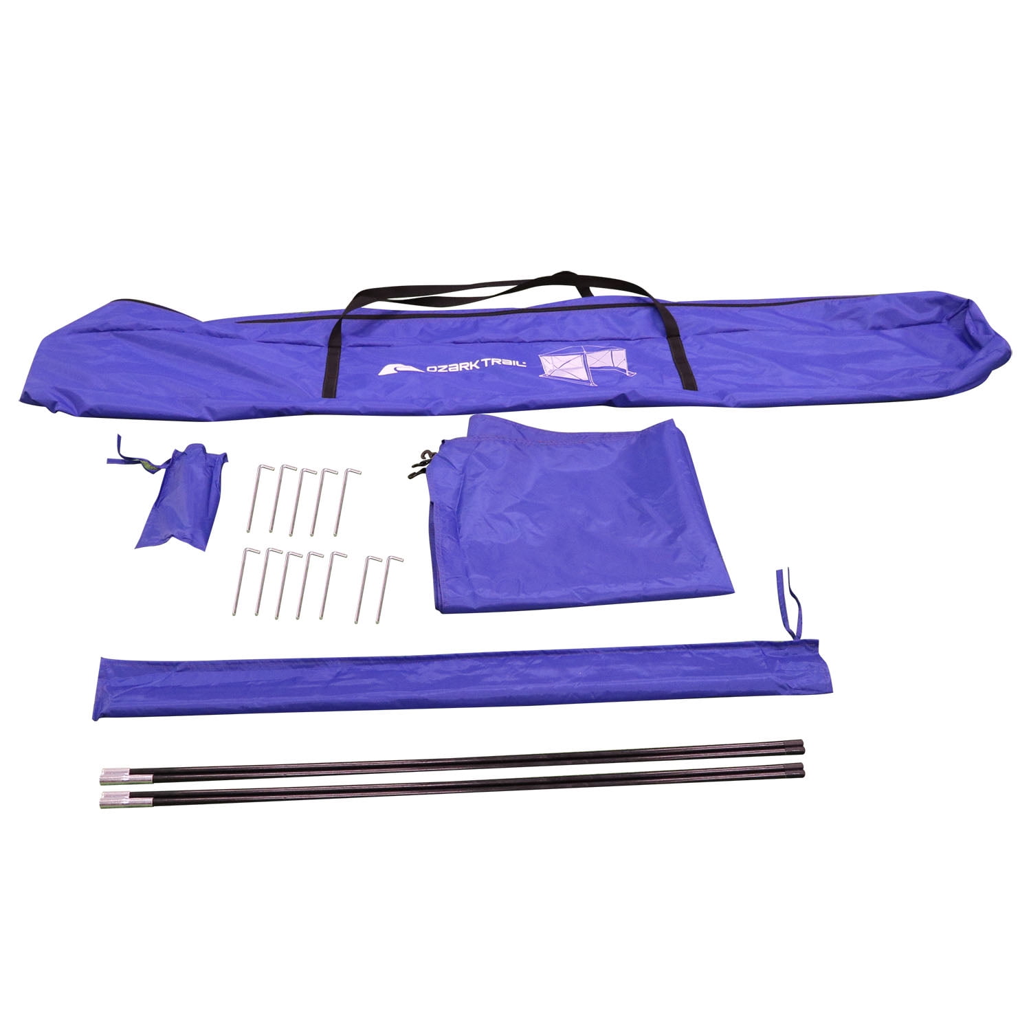 Ozark Trail 6 Hub Outdoor Camping 11’x10’x88.5″ Screen House Simple to use fiberglass hub style frame sets up in minutes Durable 150D polyester with water resistant coating, UPF 50, and reinforced panels on roof Polyester mesh offers protection from pesky insects and provides great ventilation Extra-large full panel door allows for easy entering and exiting Carry bag included for storage and transportation Dimensions: 11′ x 10′ x 88.50” Product weight (pounds): 25.21 pounds Color: Blue One Large Room