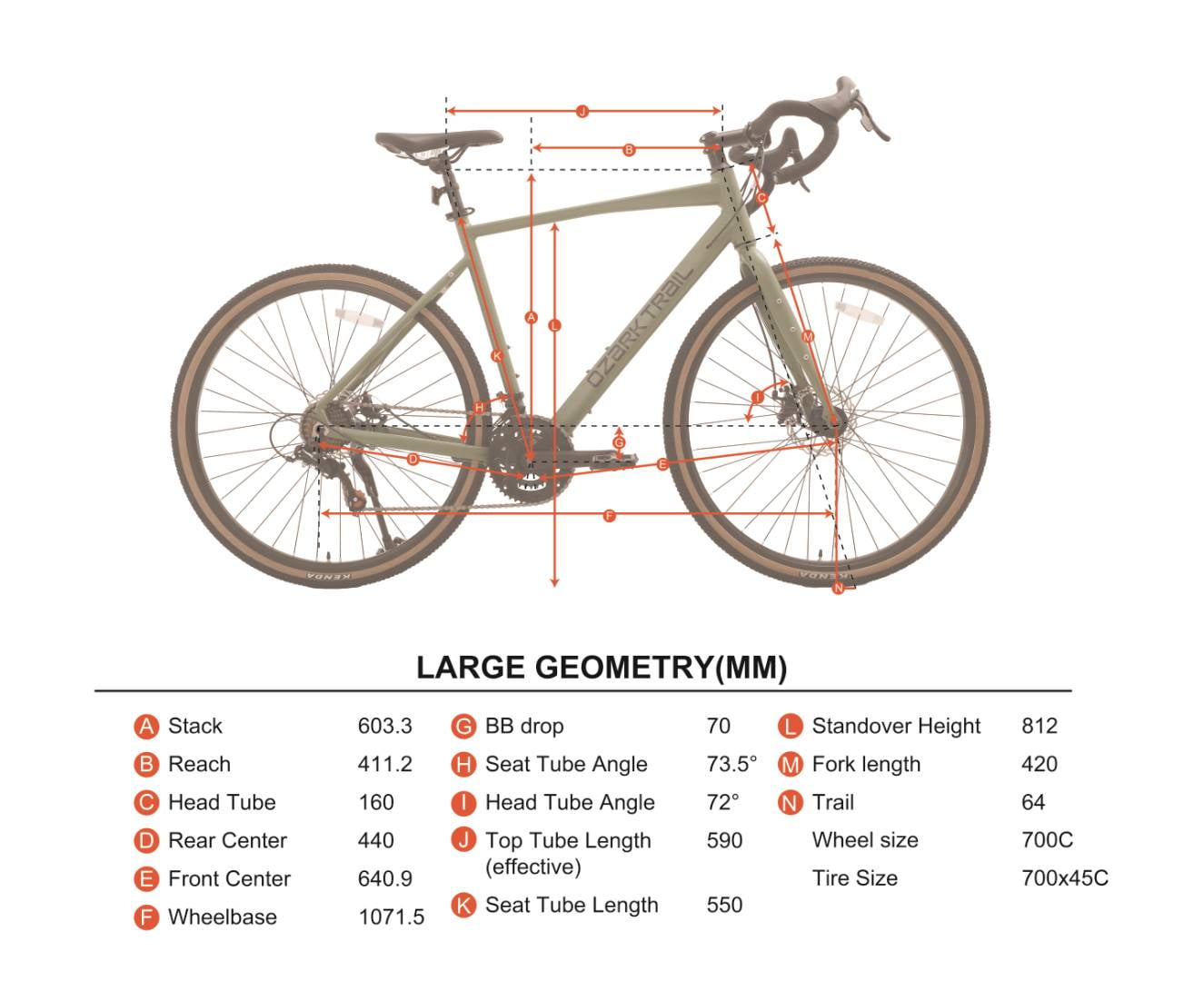 Ozark Trail 700C G.1 Explorer Gravel Bike, Large Frame, Green, Adult, Unisex Internal cable routing protects cables and gives the bike a clean, sleek look Frame: 6061 Aluminum Gravel bike with nutserts, Integrated Frame Mounts Fork: Steel front fork with nutserts, Quick Release Weight: 30.4 lbs Shifter: L-TWOO 2*7 speed brake and shifter dual lever Front Derailleur: L-TWOO 2 speed R5007 Rear Derailleur: Shimano Tourney 7 speed TZ500 Crank: 170mm length Bottom Bracket: Neco BC35, 122.5mm, One-piece cartridge Freewheel: 14-28T, 7 Speed Chain: 7 Speed Pedal: Plastic, Wide Platform Saddle: Gravel Saddle, steel rails, 150mm width