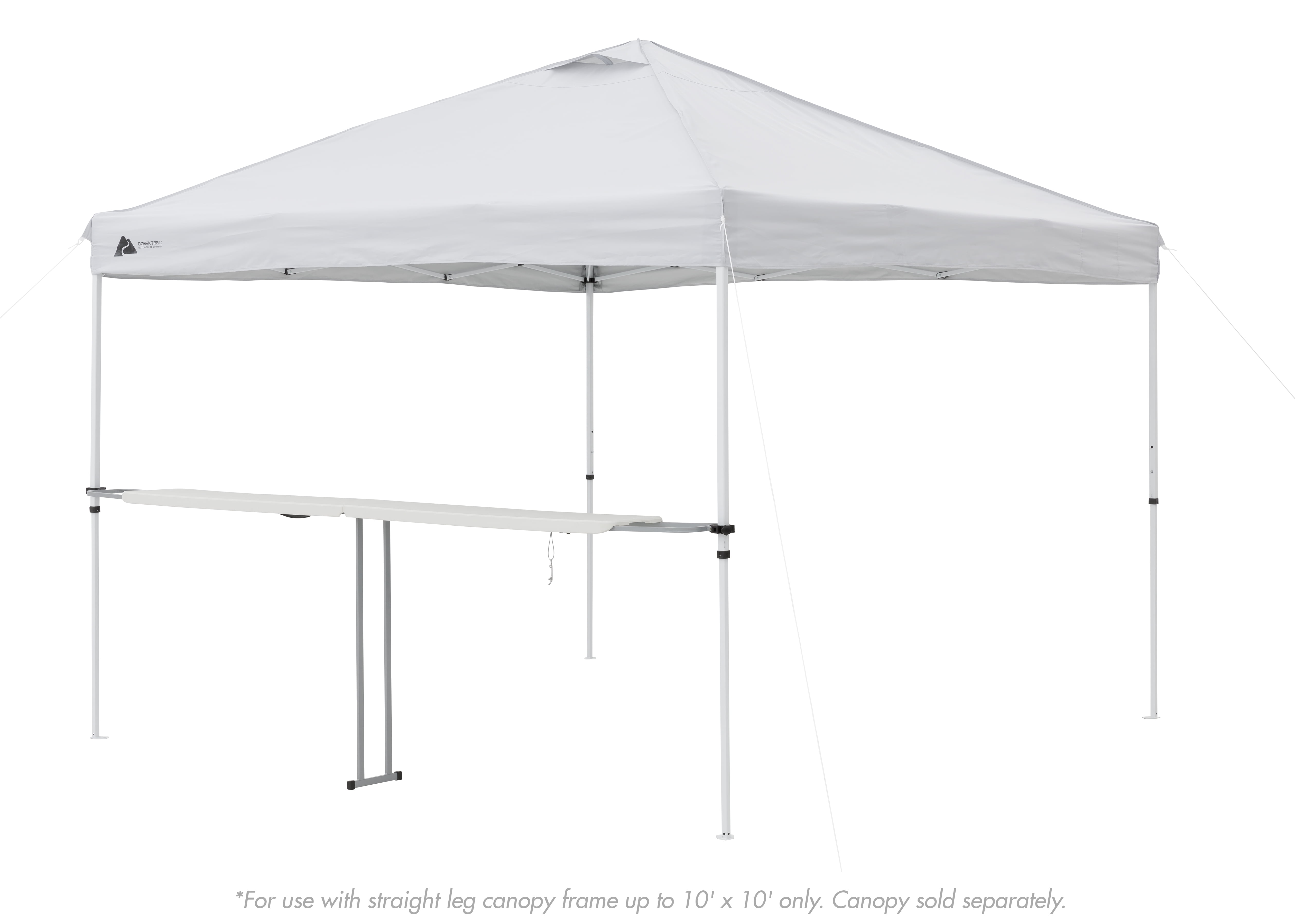 Ozark Trail 8-Foot Extendable Tailgate Table, White: For use with straight leg canopy frame up to 10′ x 10′ only Canopy sold separately Adjustable clamps secure to multiple leg widths Bi-fold design for space-saving storage Built-in carry handles for easy transportation Included bottle opener Useful for tailgating, picnics, or a backyard party Bar-height canopy table for comfort and convenience Durable steel legs 12″ table depth for plenty of space for serving snacks and drinks Table height of 39″ or just over 3′ Dimensions: 92.5” x 12” x 39” (H) Model #: 30723