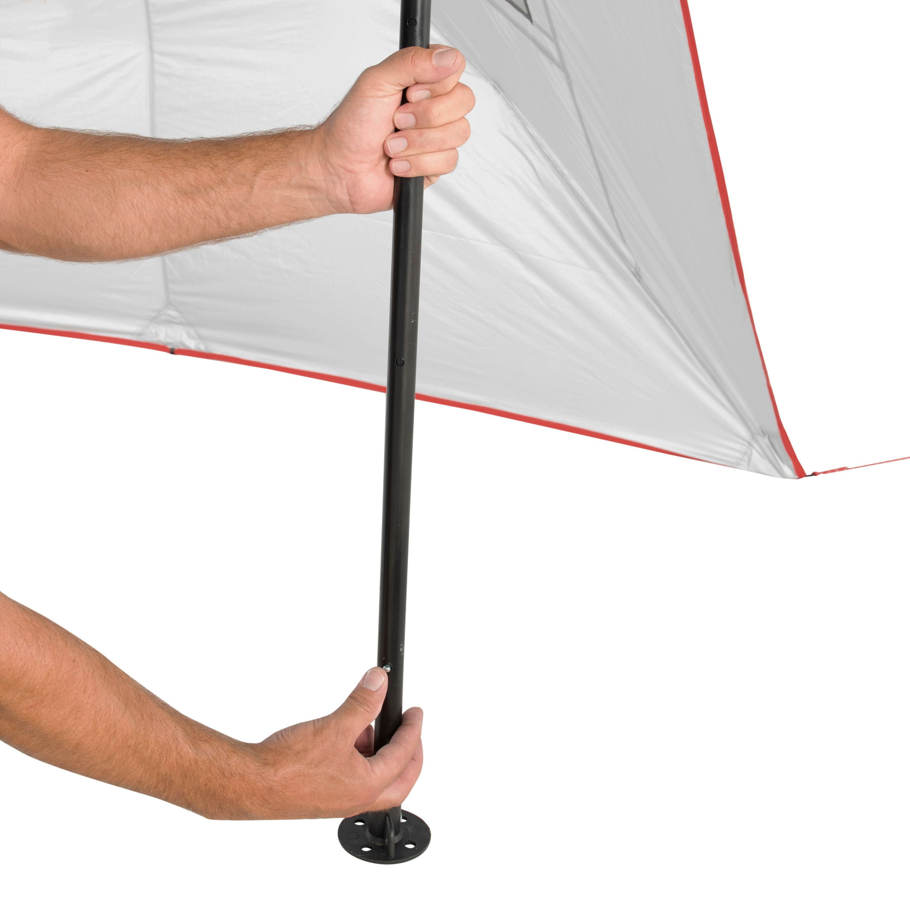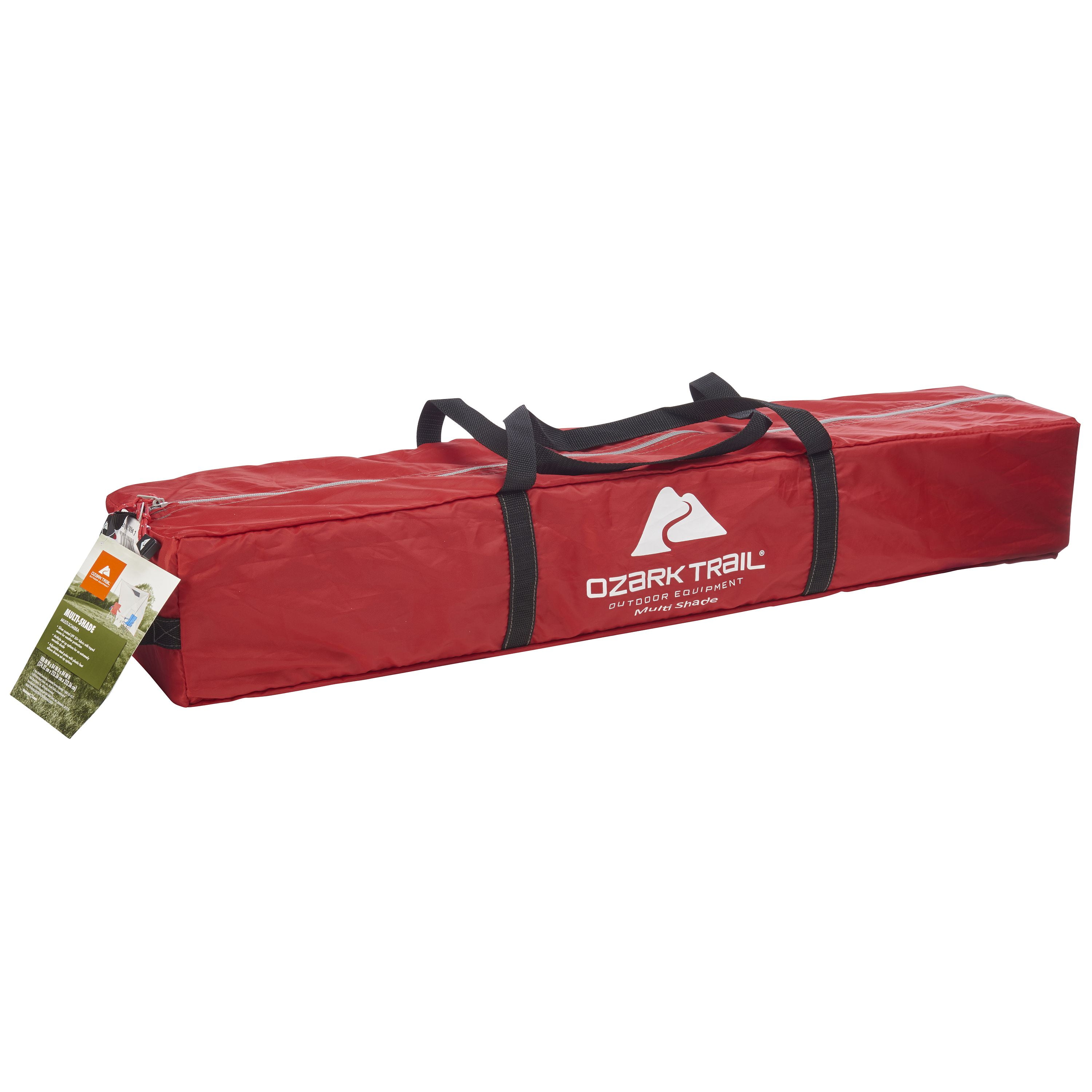 Ozark Trail Multi-purpose Sunshade with Dual Roof Vents: Multi-Functional Set-Up Options: Acts as a lean-to in vertical or horizontal orientation Secures to rear or side of a vehicle Can attach to a fence Sets up as traditional canopy using 4 steel poles Can be used without poles and staked down flat for gear storage in inclement weather Features: Great outdoor shade for tailgating, camping or sporting events Silver coated UPF 50+ fabric with taped seams for weather protection Multiple set up options for an extremely versatile shade Includes adjustable steel poles to customize the height Four steel poles with plastic deck feet allow for diverse set-up options Comes with 2 straps to assist in mounting to vehicle Includes webbing strap set-up aid to ensure poles are set the correct distance apart Two windows provide extra ventilation Reflective red guy ropes for increased visibility 4 guy ropes provide stability Dimensions/Weight: Floor Dimensions: 9 ft. x 7 ft. Floor Area: 63 sq. ft. Center Height: adjustable up to 84 in. Packed Size: 34.5 in. x 5.75 in. x 5.75 in. Packaged Weight: 13.3 lbs. Specifications: Body Fabric: Poly Taffeta 185T 1200mm UPF 50+ Silver Coated Mesh Fabric: Polyester 68D Carry Bag Fabric: Poly Oxford 210D Frame Material: Fiberglass and Steel poles Number of Windows: 2 Number of Deck Feet: 4 Number of Mounting Straps: 2 Number of Poles: 7 Number of Guy Ropes: 4 Number of Steel Stakes: 4 Average Set-Up Time for 2 people: 10 minutes Additional Details: 1-Year Limited Warranty Assembly required. Instructions are sewn into the carry bag and can also be downloaded from the Manuals & Guides section below. For product questions or replacement parts, please contact our Customer Service Department at 1-833-908-2025 or email [email protected] Model No.: W908.1