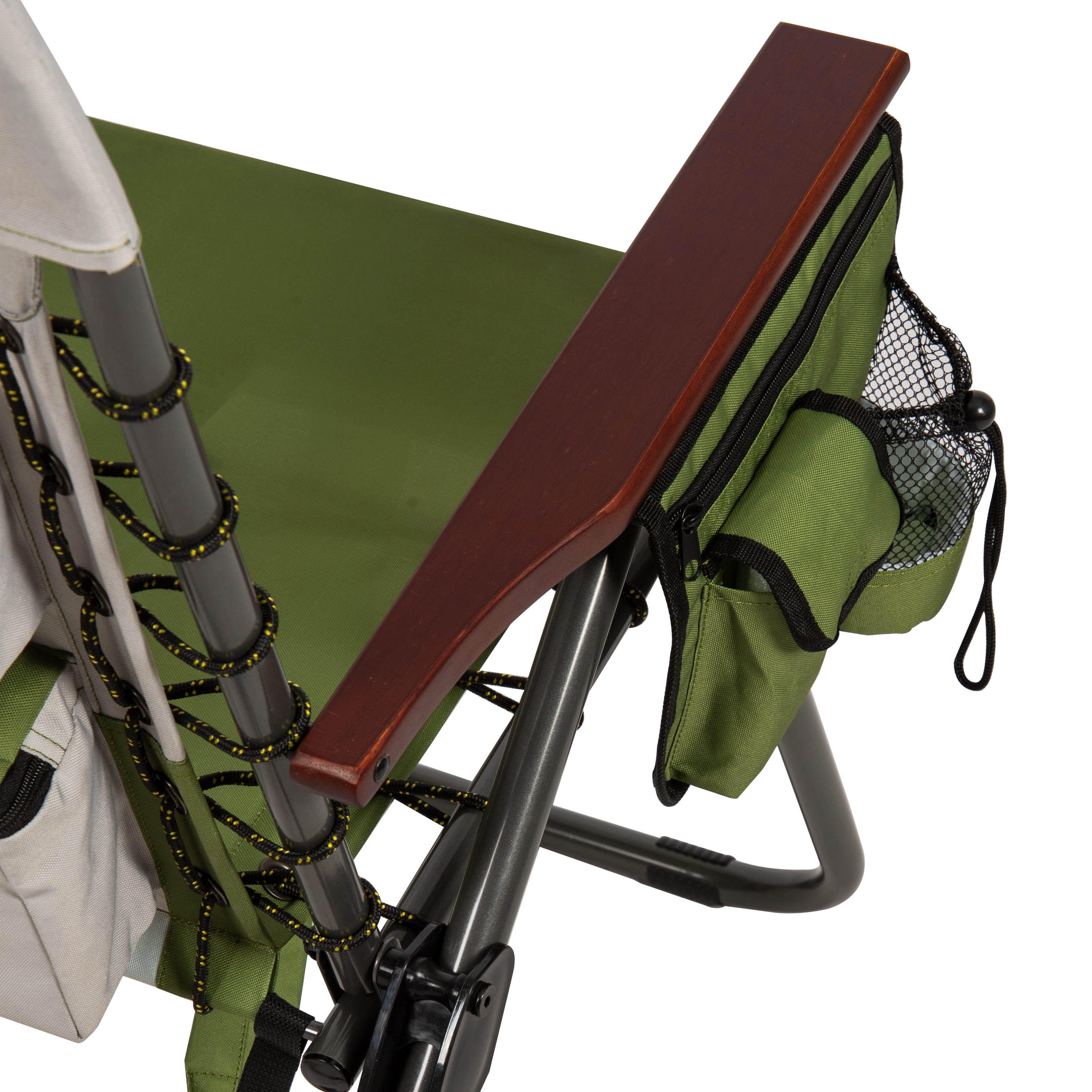 Sit in comfort with this Ozark Trail Backpack chair with premium wood arms. Choose from one of four positions and enjoy the large adjustable foam pillow. 17″ Seat Height allows for comfort for all ages. Adjustable backpack straps allows for easy transportation. On the back there is a dry storage pocket along with an insulated pocket as well. One the side is a premium drink holder and valuables pouch. This chair is great for camping, sporting events, tailgating, and more! Chair weighs 12.5 lbs.