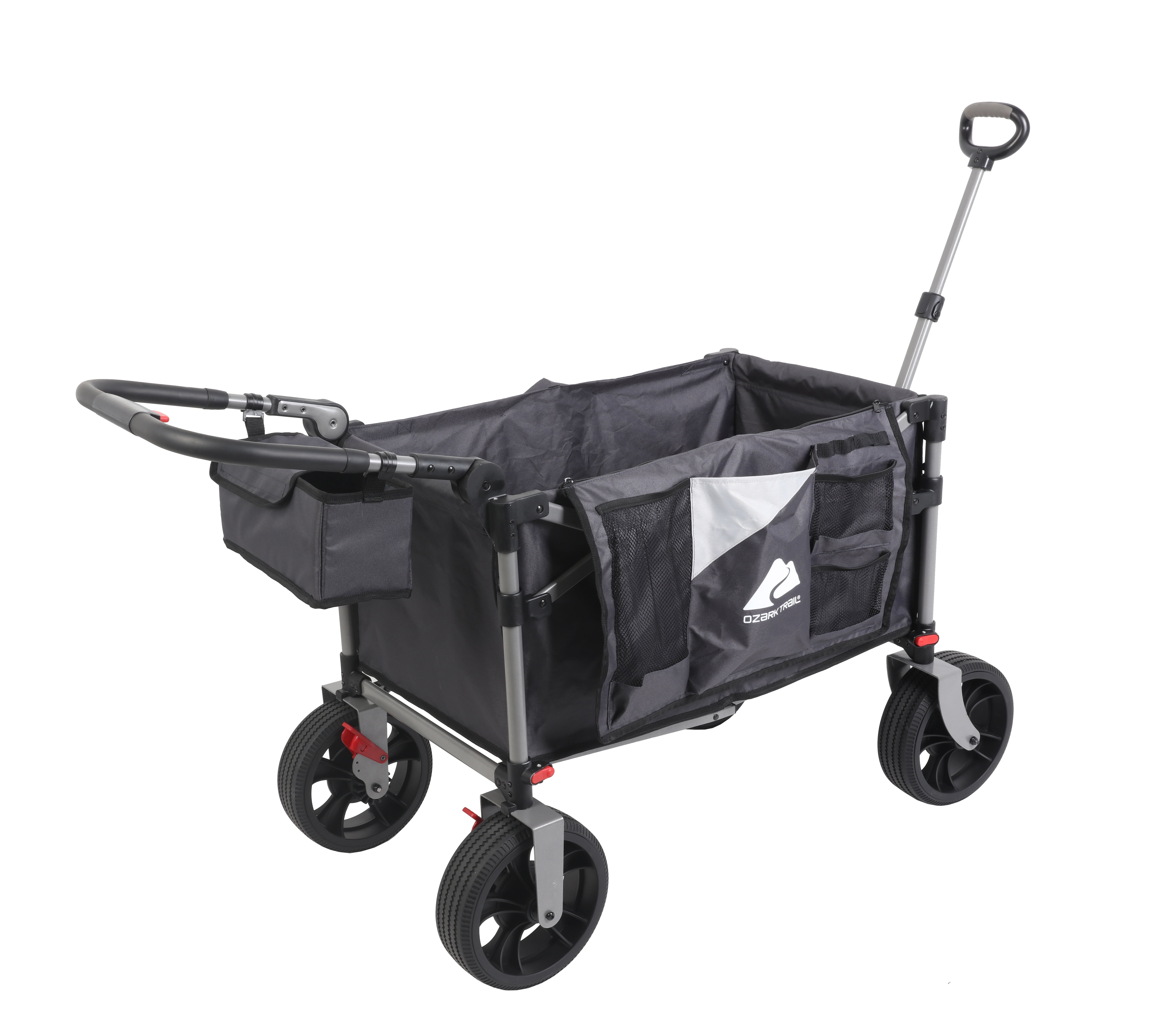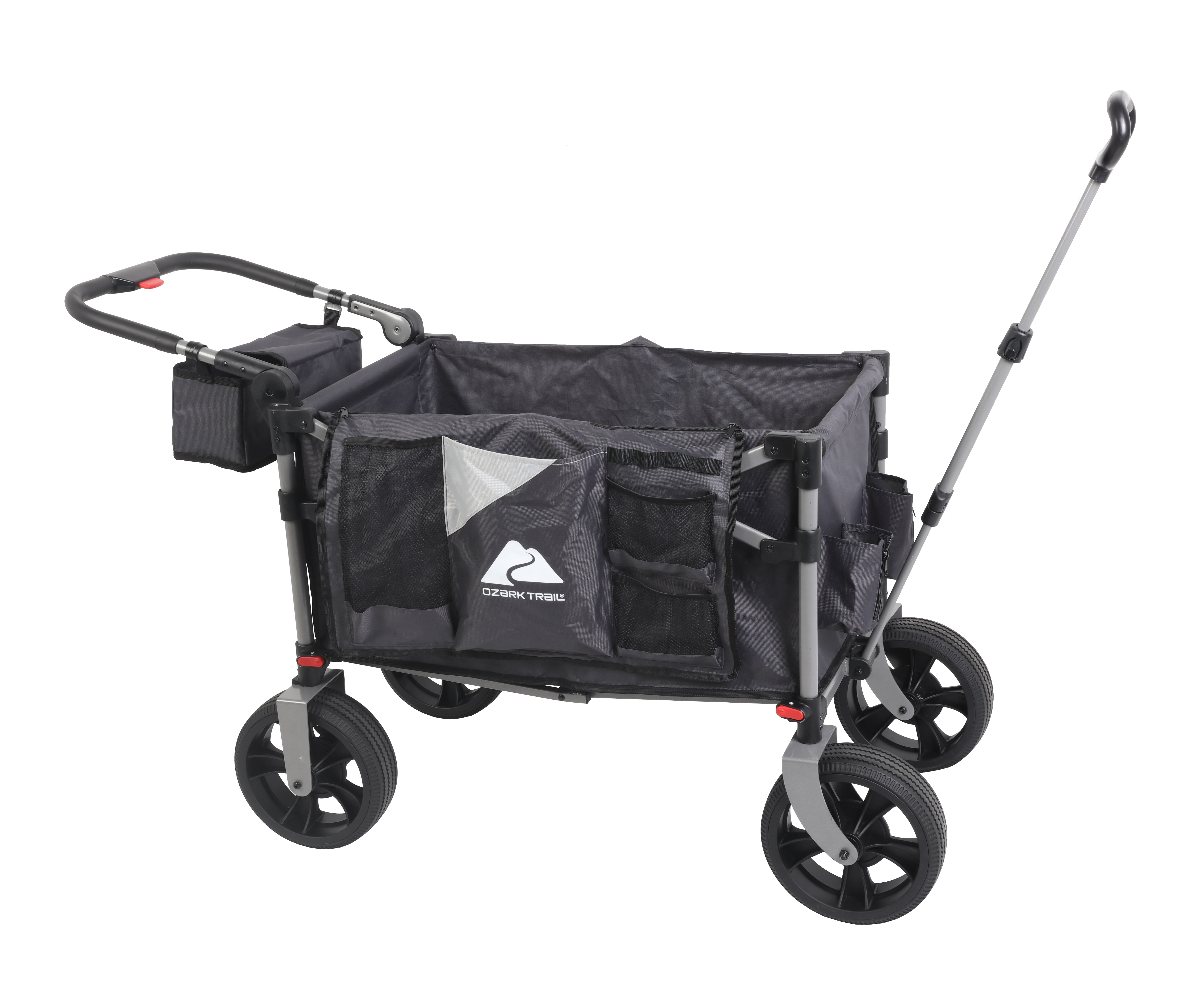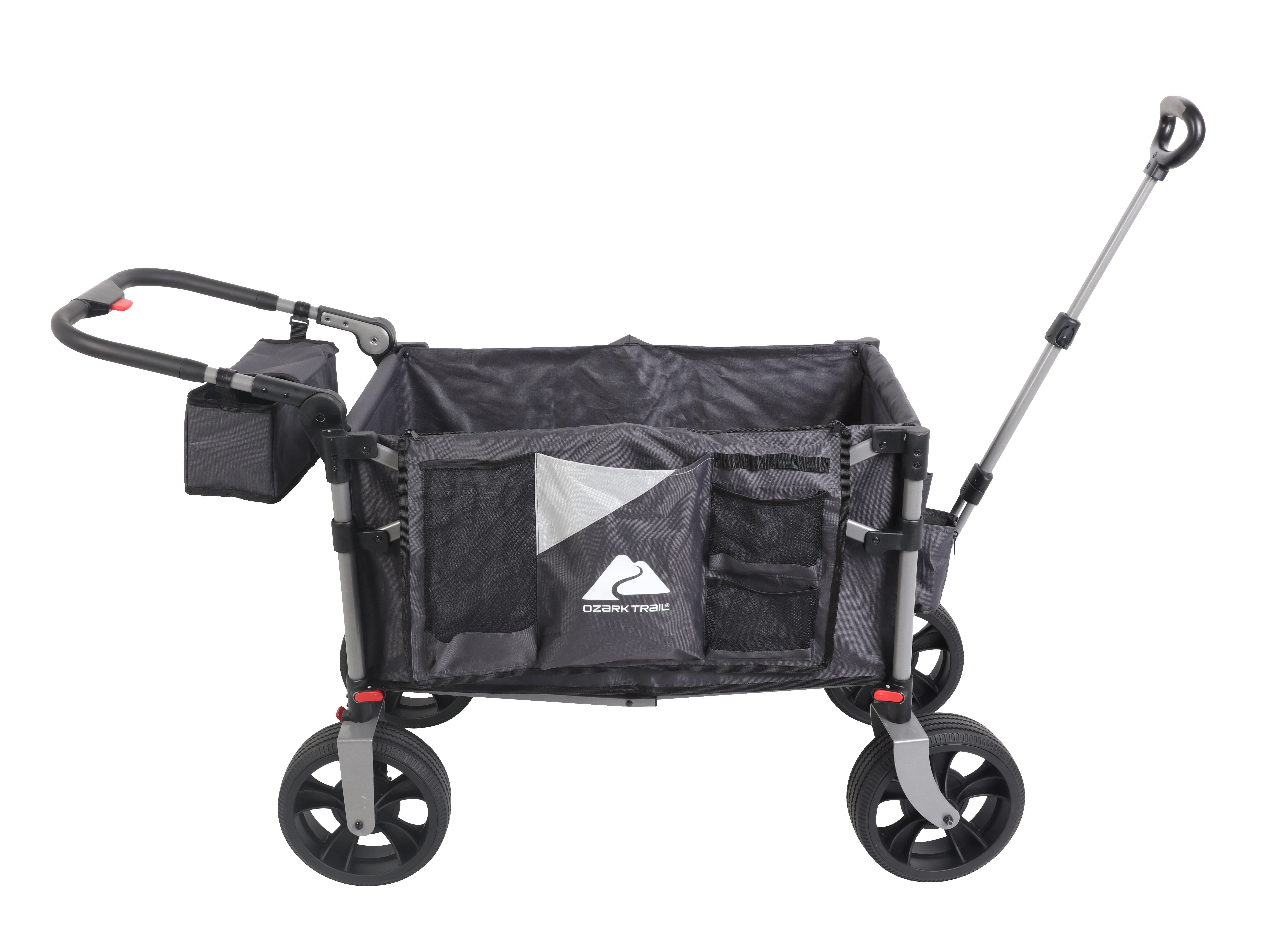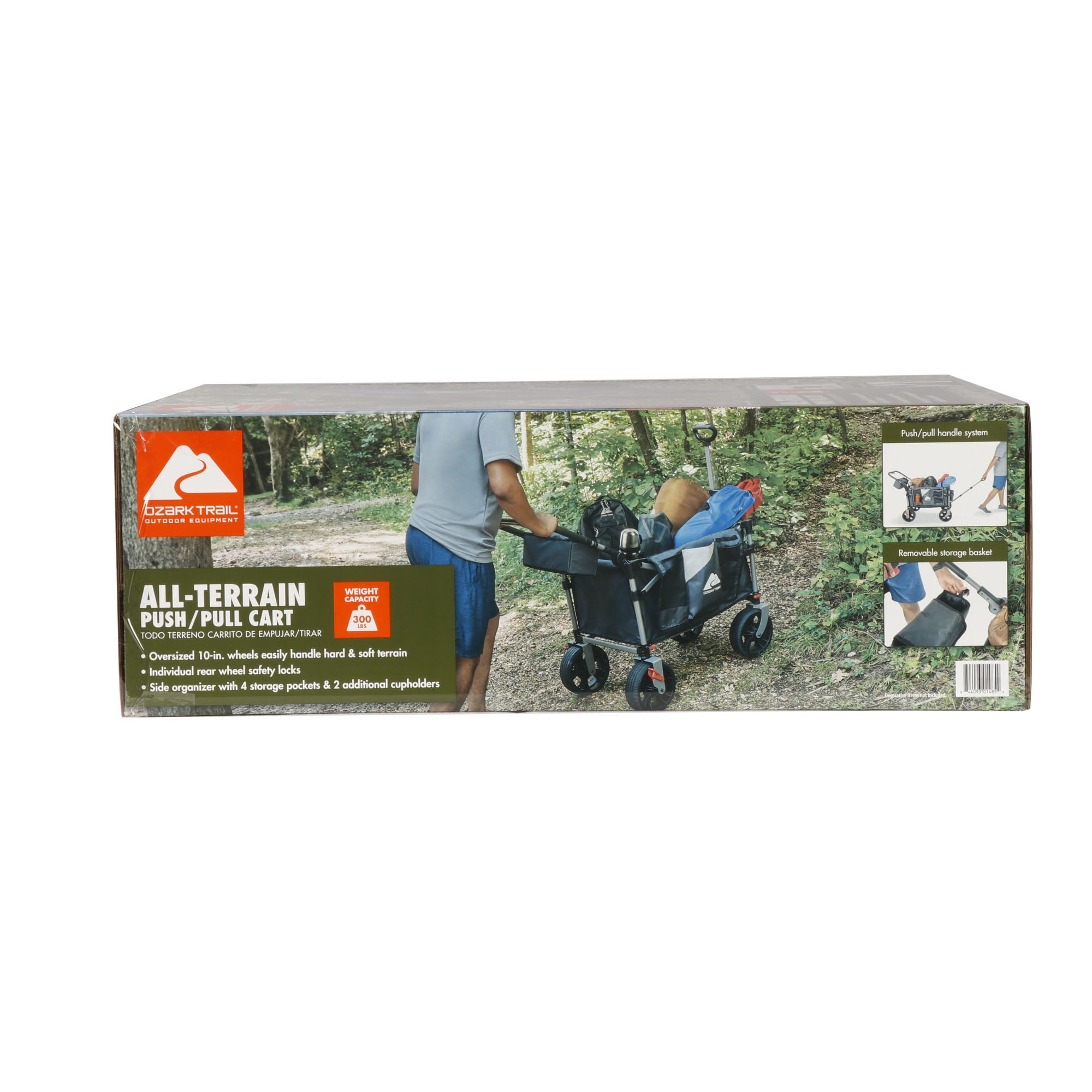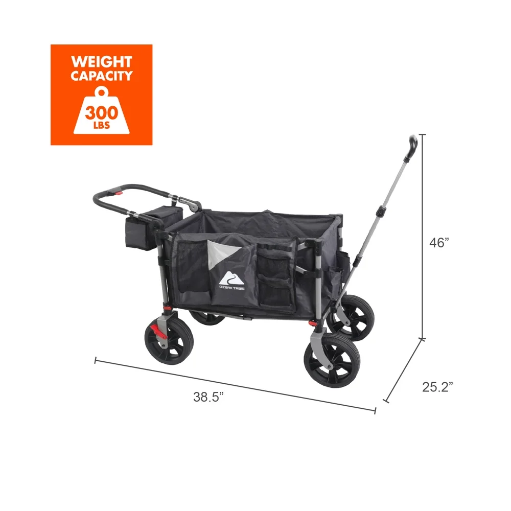 Ozark Trail Push and Pull Wagon Quick to set up and take down Removable wheels for space saving storage Brake system makes wagon easy and safe to use Adjustable handle with ease steering All-terrain 10″ wheels move smoothly on sand or grass with ease Adjustable push handle and a 3-section telescopic pull handle for easy hauling Pockets on the front and back for storing important items Weight capacity (pounds): 300 lbs. Open dimensions (inches): 38.5” x25.6” x 48”