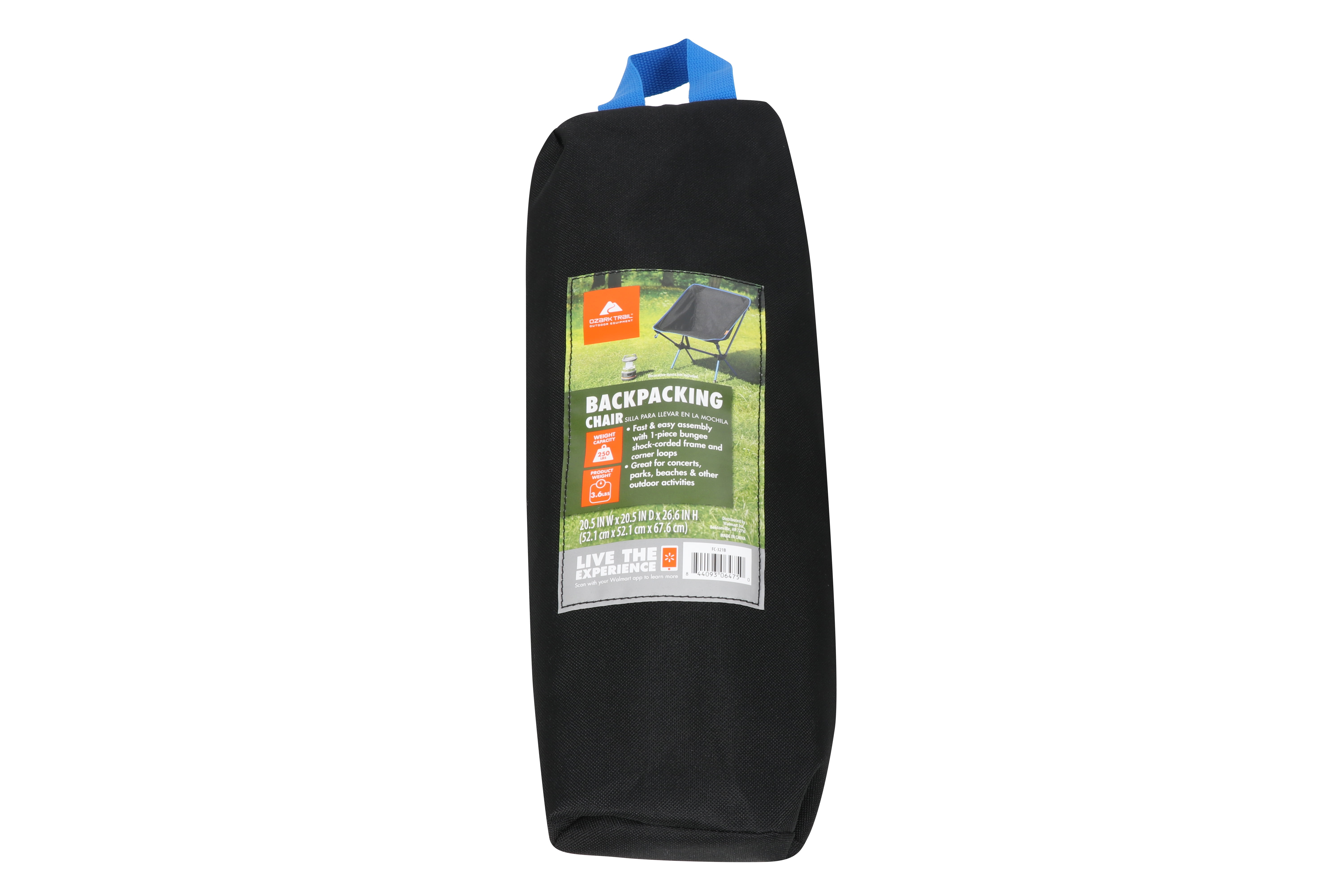 Ozark Trail Camping Chair, Black: 600D polyester fabric with PVC coating Overall size: 20.5″ L x 20.5″ W x 26.6″ H Shock corded steel tube frame with powder coating for weather corrosion resistance Product weight: 3.3 lbs. Carry bag included for easy transport Frame breaks down to compact size and is rolled up in the chair fabric and place directly into the carry bag Folded dimensions in carry bag: 15″ L x 5″ W Black with blue trim and blue frame Model #: FC-321B Adult Black chair