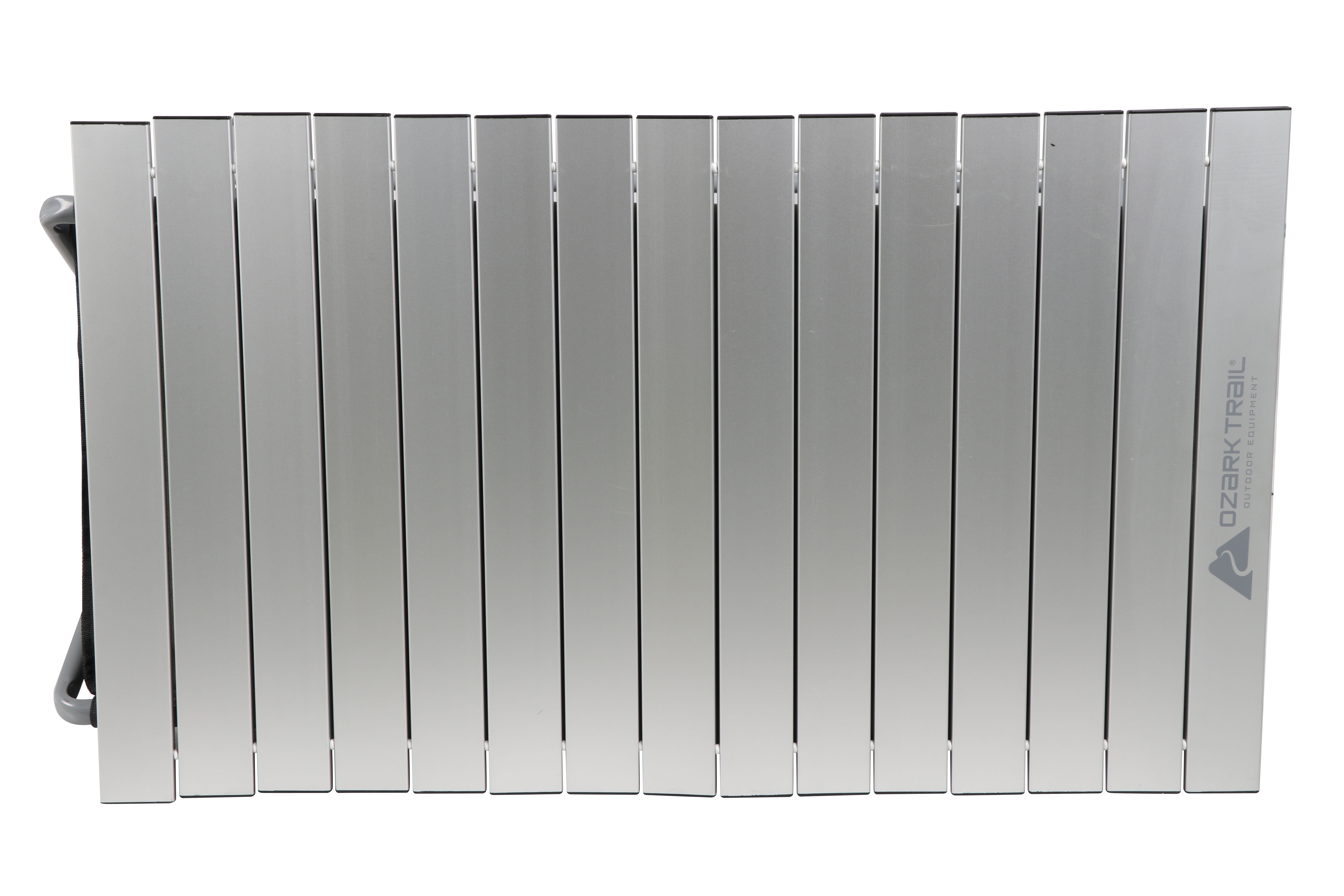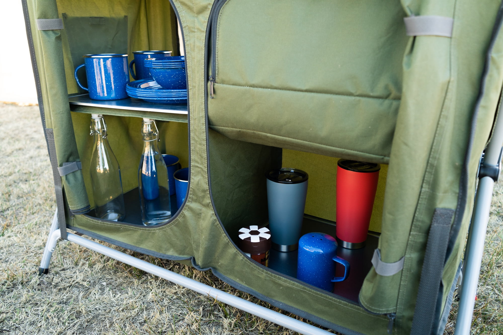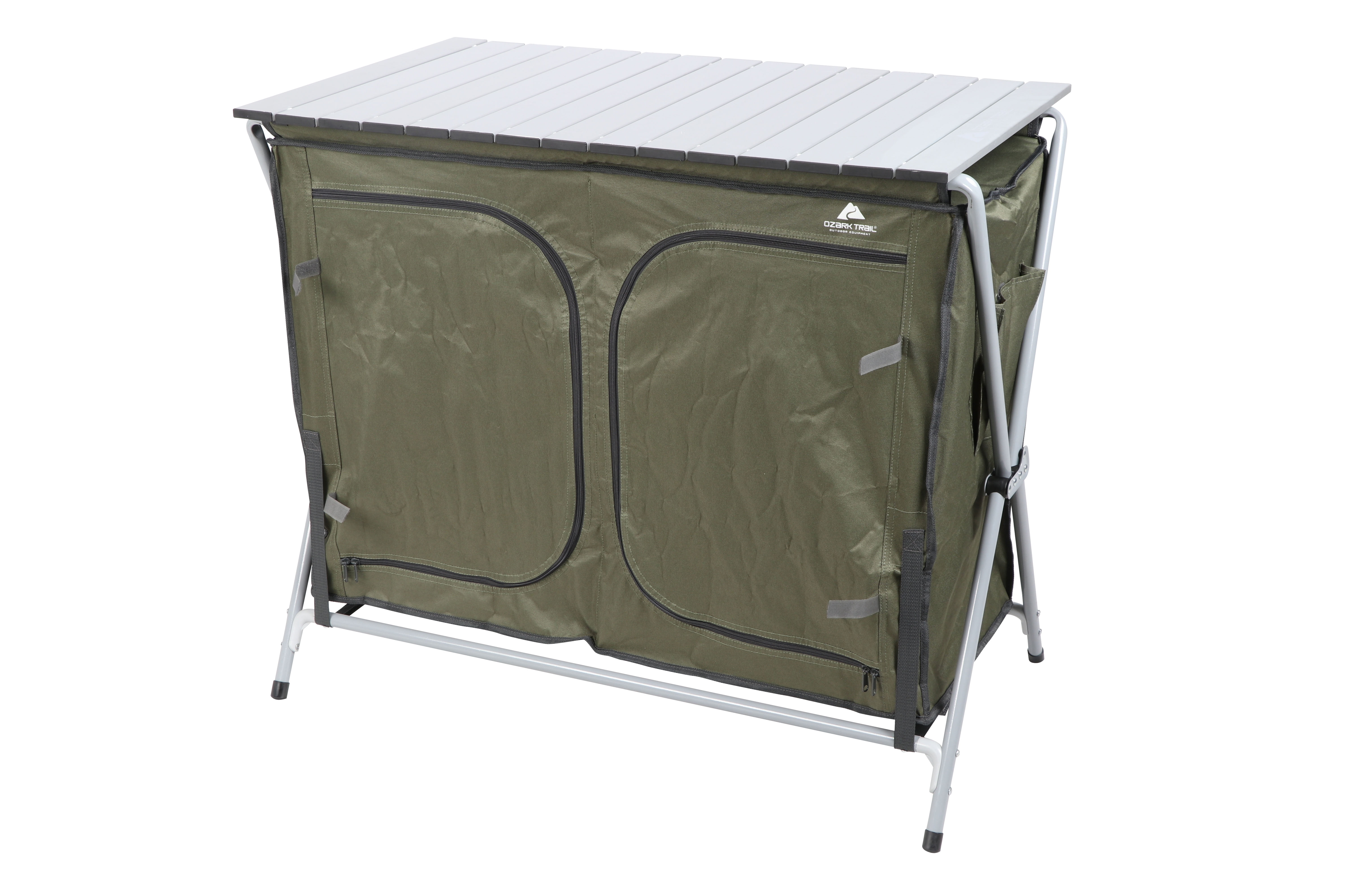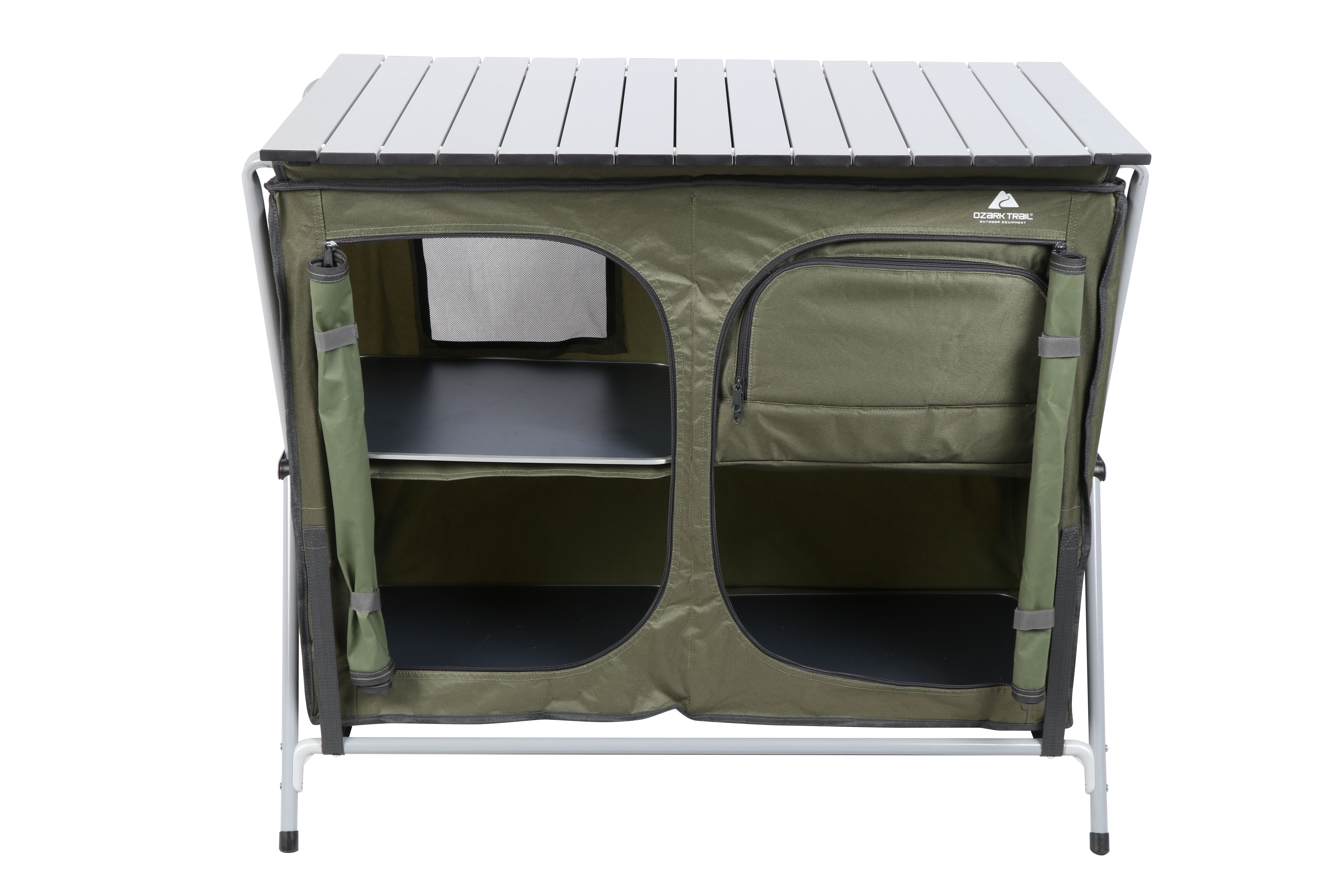 Ozark Trail Camping Table, Gray Double two-shelf deluxe cupboard lets you easily store and organize your cooking tools and supplies Quick and easy to assemble with an “X” shape frame for a sturdy work and storage space A durable aluminum roll-top is great for preparing your meals on your camping weekend Carry bag for convenience Product Overall Size: 34.2″ W x 19.6″ D x 31.5″ H