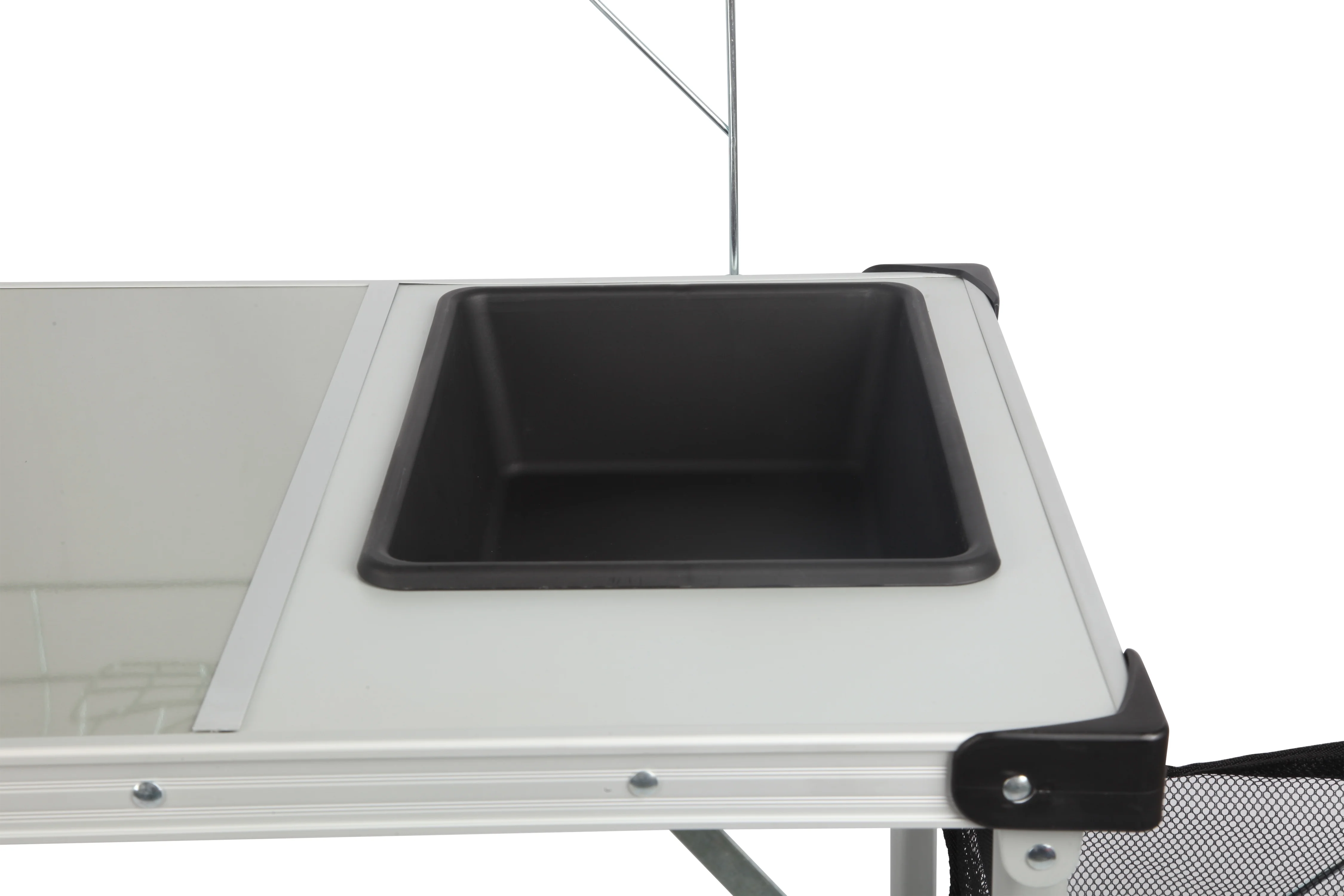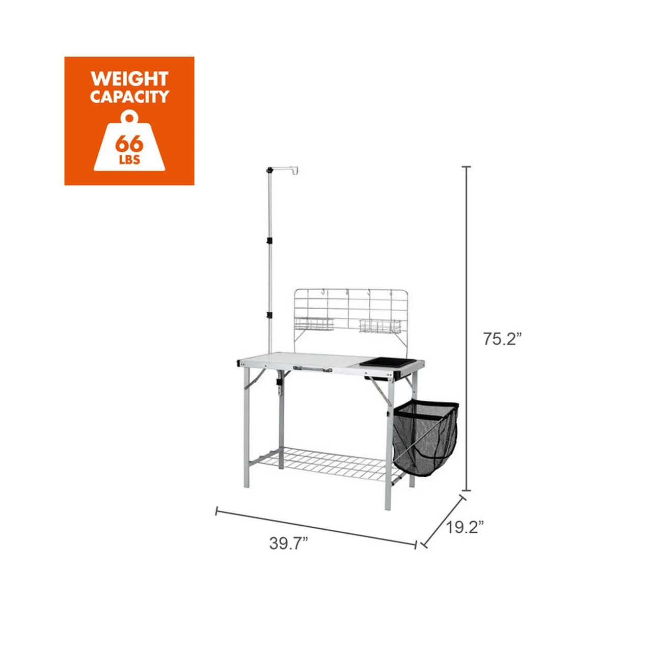 Ozark Trail Portable Camp Kitchen and Sink Table with Lantern Pole Durable steel frame with an adjustable lantern pole Easy-to-clean tabletop and plastic sink Steel rack for utensils Camping kitchen table with sink meets your culinary needs while camping Adjustable lantern pole Everything you need to transform your campsite into a kitchen area Spend less time preparing food and more time enjoying the outdoors Supports most portable grills Convenient rack for hanging items Portable camping kitchen table provides a place to store dishes out of the way Doubles as a serving area or prep station for your meals Model # TA-544.39.4″ L x 19.7″ W x 76″ H