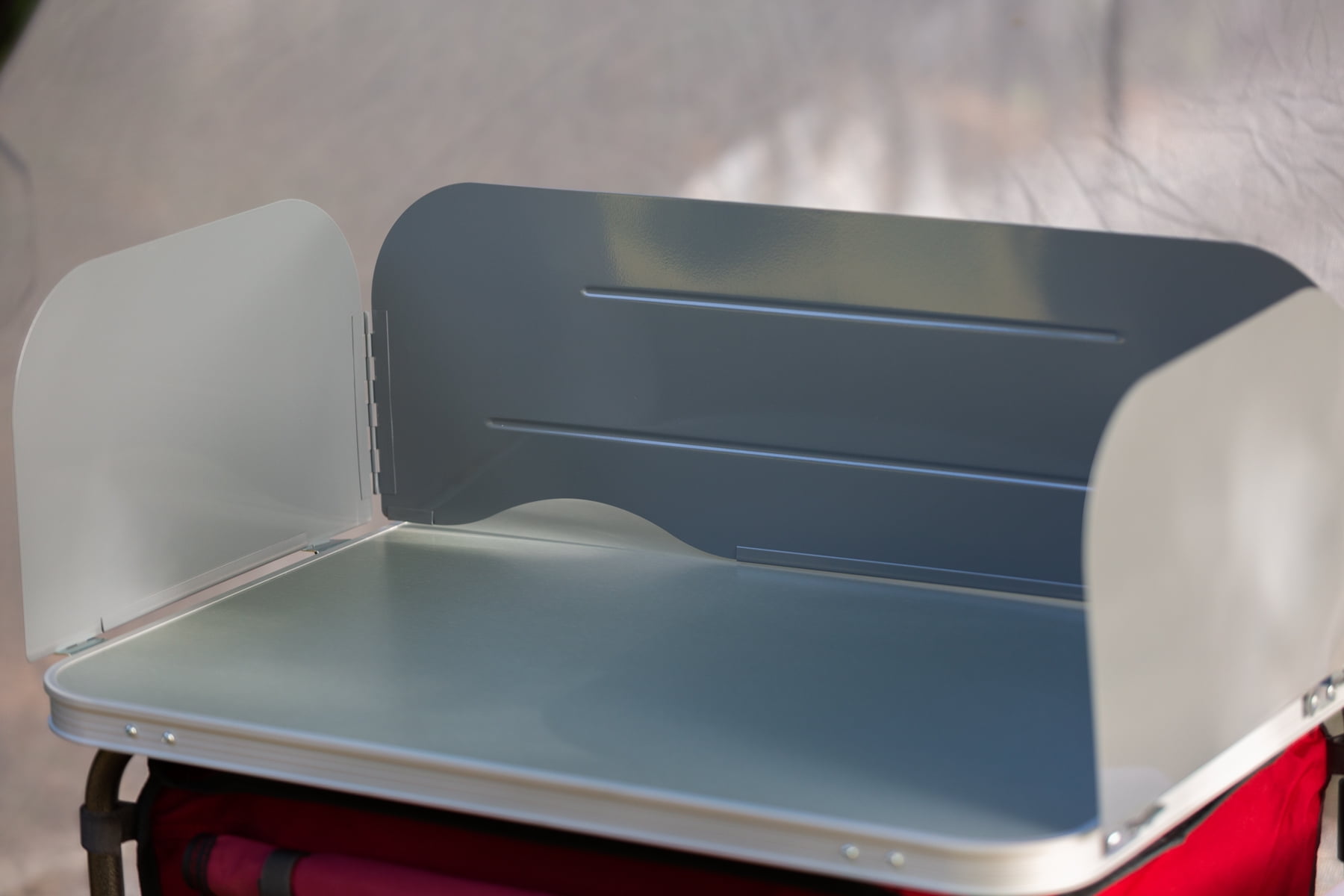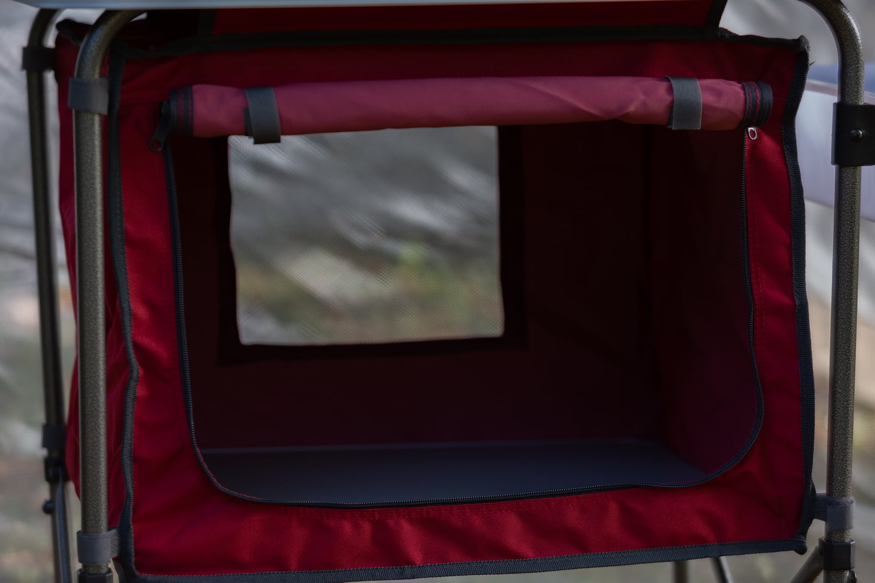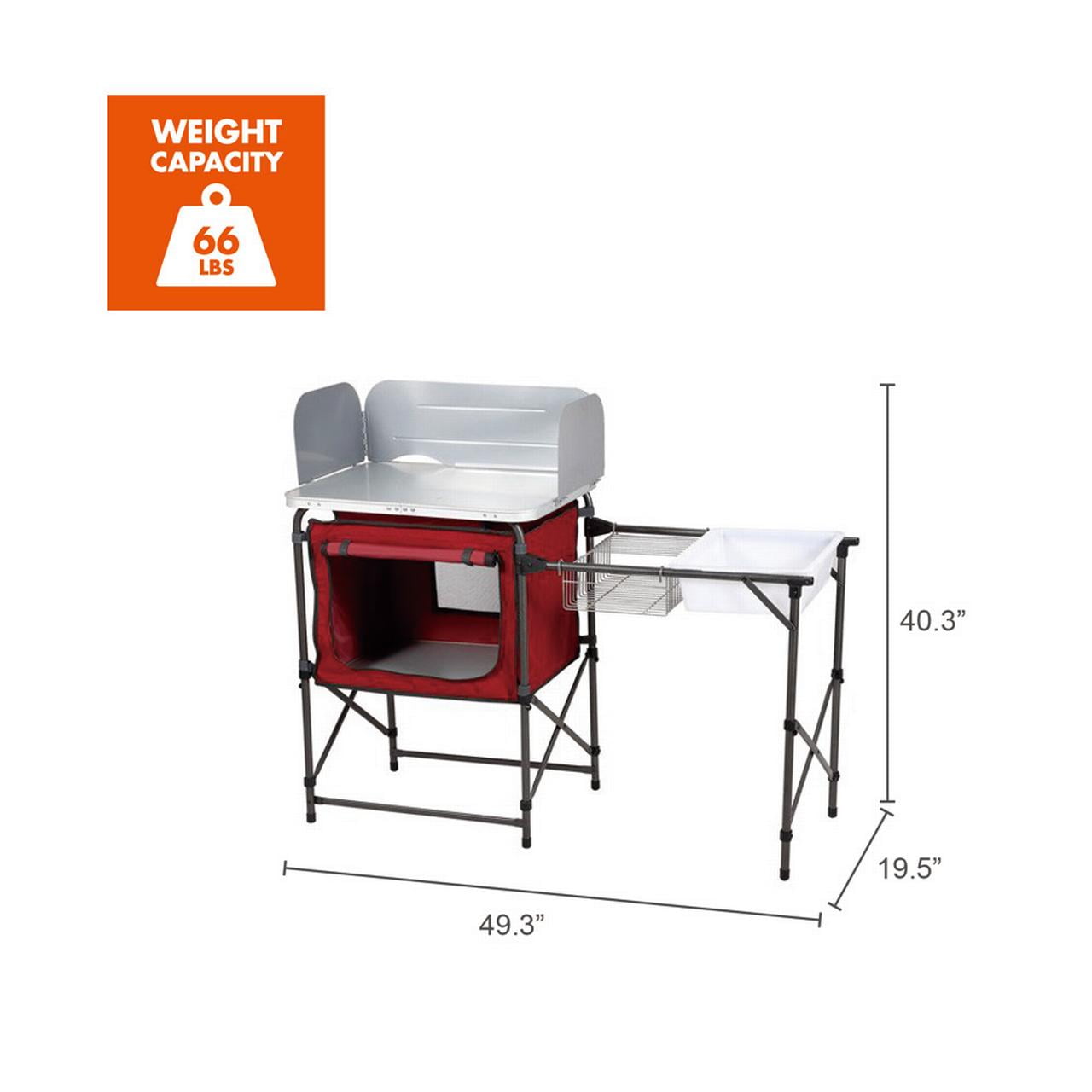 Ozark Trail Deluxe Camp Kitchen with Storage and Sink Table, Red Durable steel frame with easy-to-clean tabletop Grill table top is 19″ x 24″Removable windscreen on tabletop Windscreen Pantry organizer with zippered opening and mesh panel Outdoor sink table and drying rack included Durable steel frame Tub style sink, no drain Holds up to 65 lbs Packs small into included carry bag Assembly required Product weight: 20 lbs Dimensions (inches): 31″ x 13″ x 8.25″ Open dimensions (inches): 49″ x 19.5″ x 31.9″ Folded dimensions (inches): 33.1″ x 26″ x 5.9″ Model: TA-619, silver