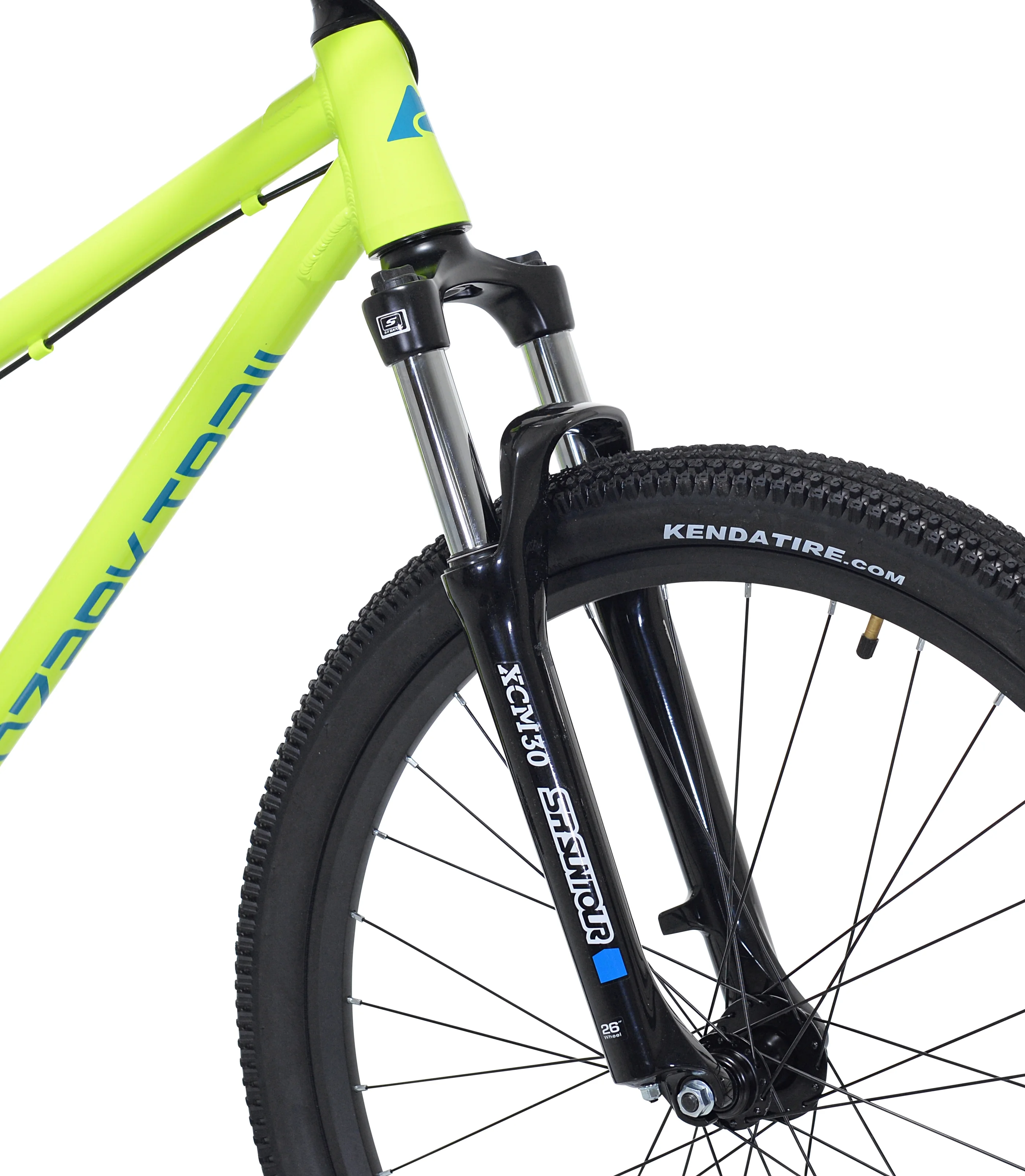 The Ozark Trail Dirt Jump bike is an exceptional value. It starts with the 13.25” alloy dirt jump frame as a base, and then we added a Suntour suspension fork with 100mm travel, Tektro rear disc brake, 32-hole double wall alloy rims and 26” x 2.3” Kenda tires. Perfect for the pump track, skatepark or even street missions. The Ozark Trail Dirt Jumper is for teens/adults between 5’2″-5’10”.