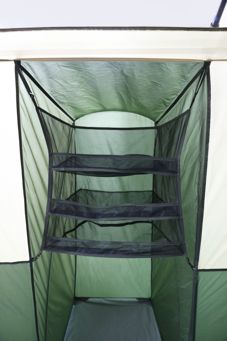 Ozark Trail Hazel Creek 12 Person 3-Room Cabin Tent, 20′ x 9′ x 84″, Green Traditional all steel cabin design with single gable entrance Two strings of LED lights hang conveniently inside tent (batteries not included) Includes two 2’ deep closets with large mesh hanging organizer and gear hanger with four carabiners Two hanging corner organizers, two integrated mesh pockets, and a tablet pocket offer plenty of storage options Two removable room dividers create separate living spaces for larger groups One room divider with silver coated fabric can be used as a movie screen Includes mud mat, E-Port, and rolling storage duffel for additional convenience Requires 6AAA batteries for 2 LED Light Strings Color: Green and tan Dimensions: 20’L x 9′ W x 84″