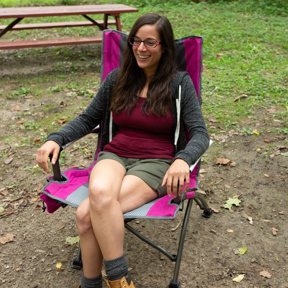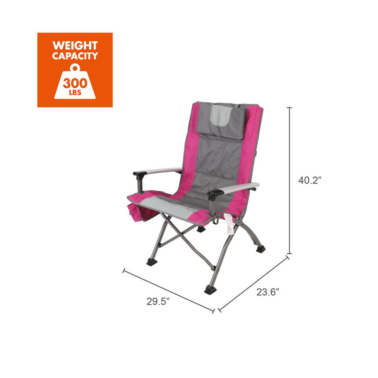 Ozark Trail Folding High-Back Chair with Head Rest, Fuchsia Higher back and headrest give you added comfort for hours of seated enjoyment Ultra-durable steel frame holds loungers of different sizes Cup holder gives you a place to keep your drink and stay hands-free Adjustable feet help to keep you stable and from teetering on uneven surfaces Overall size: 23.5″W x 29.5″D x 40.2″H Weight capacity: 300 lbs (136kg) High-back folding chair offers compact storage when not in use Available in black and Pink Model # FC-023 Adult use