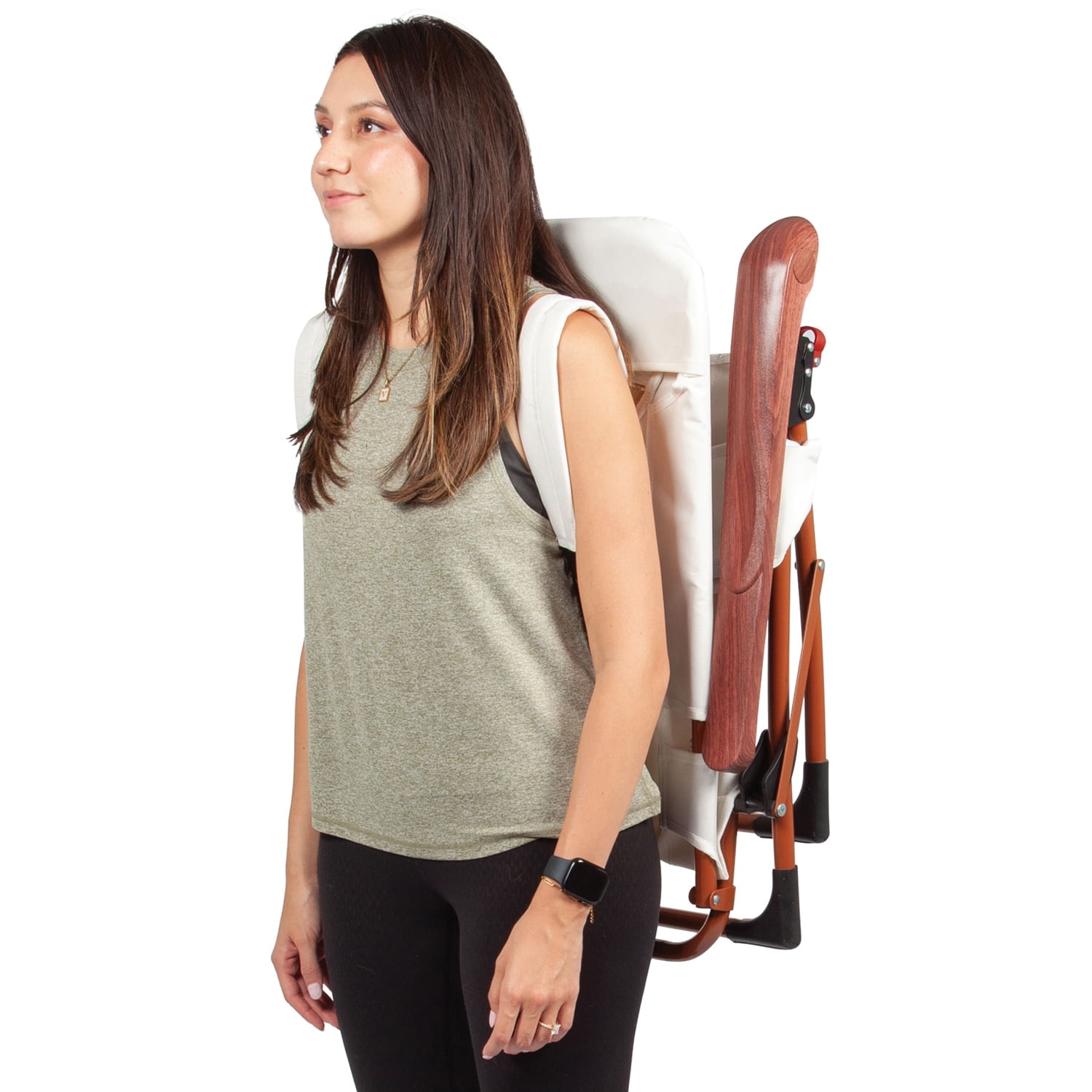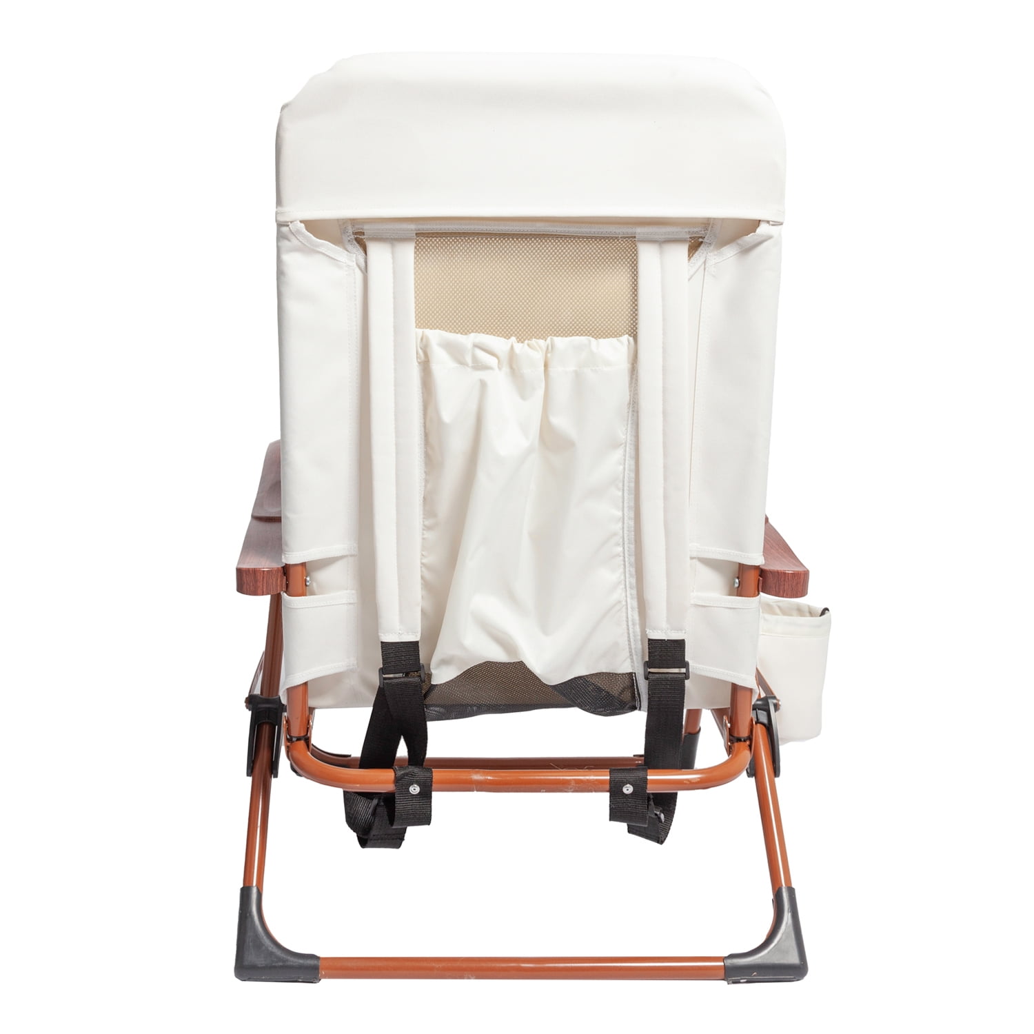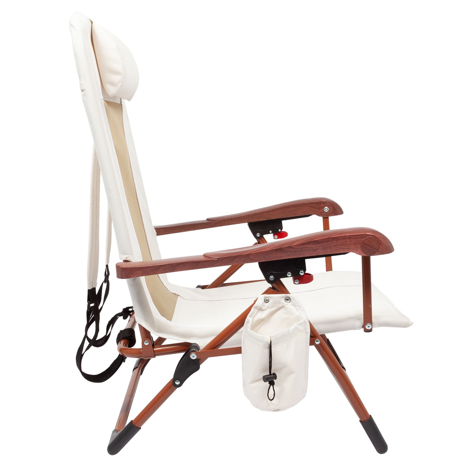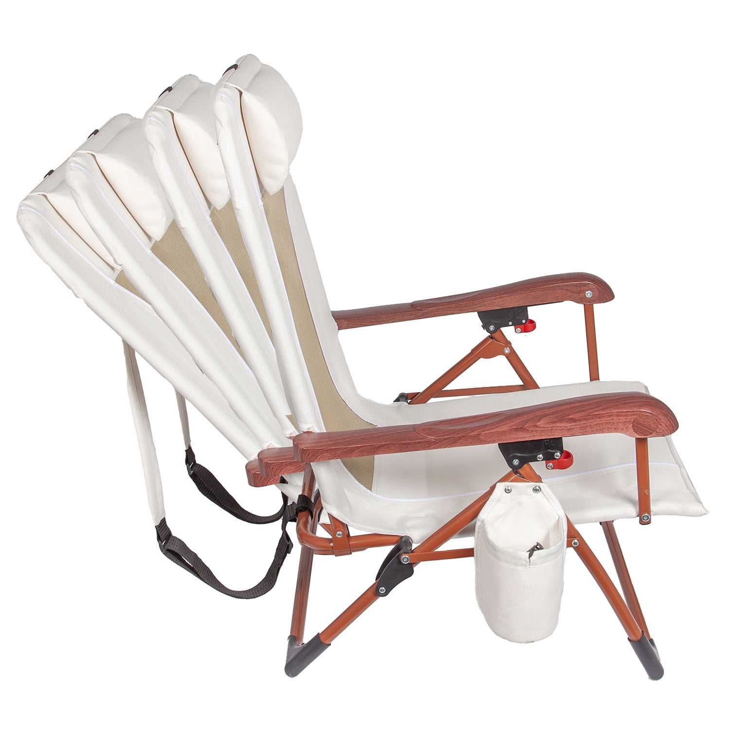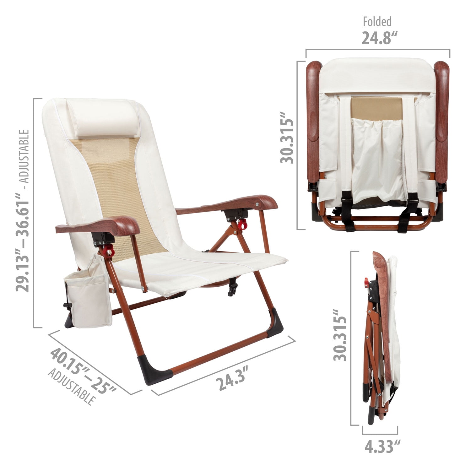 * Multiple Reclining Positions, Easily Locks into any Position Cool Breathable Moisture-Wicking Fabric Spacious Back Storage Pouch Oversized- Insulated Drink Holder (Holds up to a 30oz. Tumbler) Thick Comfortable Pillow Adjustable Shoulder Straps Attractive Woodgrain Print Arms Folds Easily for Transport and Storage Rugged Powder Coated Steel Frame