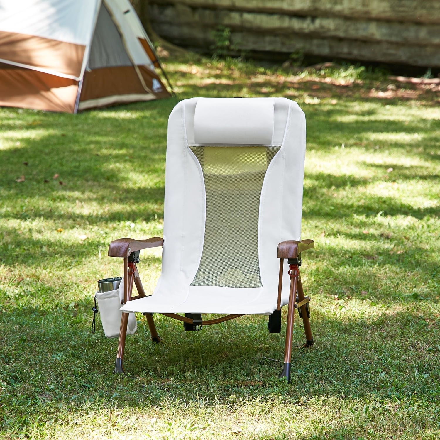 Elevate your outdoor relaxation experience with the Ozark Trail Low Profile Reclining Glamping Chair in fashionable Vanilla Dream Polyester fabric and sleek woodgrain print arms. The chair has multiple reclining positions, for maximum comfort, convenient insulated drink holder, spacious back storage pouch and adjustable, padded shoulder straps. Whether you’re out camping in the woods, lounging on the beach reading, soaking up the sun or tailgating at sporting event, this chair is quick and easy to set up and recline, giving you the best seat anywhere. Adult use. Overall size: 24.3 inches wide and is 40.15/25 inches deep with 29.13/36.61 inches high This durable chair has the capacity of 275 pounds