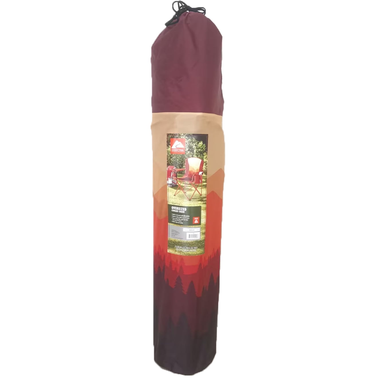 Ozark Trail Oversized Chair with Cooler Ombre Mountain Design Built-in insulated armrest cooler Includes carry bag with carry strap Built-in universal umbrella holder Integrated aluminum bottle opener Durable power-coated steel frame with built-in mesh cup holder Adult Weight capacity: 400 lbs Built-in carry strap folds the chair quickly for fast and easy transport Dimensions: 36in x 23in x 38in