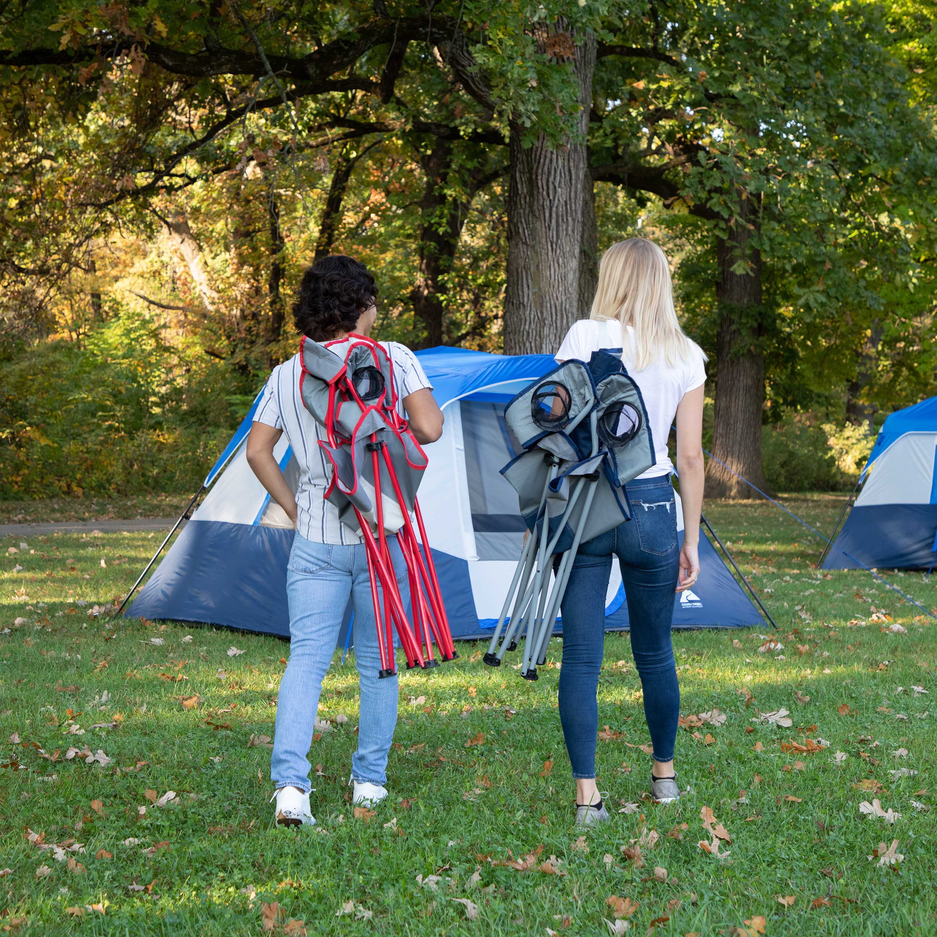 On your next outdoor adventure, grab the Ozark Trail Oversized Quad Camping Chair and relax comfortably. The Ozark Trail Oversized Quad Chair has a built-in strap and clip folding system which allows you to quickly fold and carry the chair with ease. This oversized quad chair is perfect for a variety of outdoor activities, including tailgating, sporting events, and camping. This oversized quad chair is made from durable polyester fabric with a steel frame for long-lasting comfort and convenience. The constructed steel frame boasts up to a 400-pound weight capacity. While sitting next to the campfire, keep all your favorite drinks nearby with the two built-in mesh cup holders. The included roll-top carry bag with attached shoulder strap makes for convenient transportation and storage to and from the campsite. Relax in comfort and style on your next outdoor adventure with the Ozark Trail Oversized Quad Chair Camping Chair (Blue Cove).