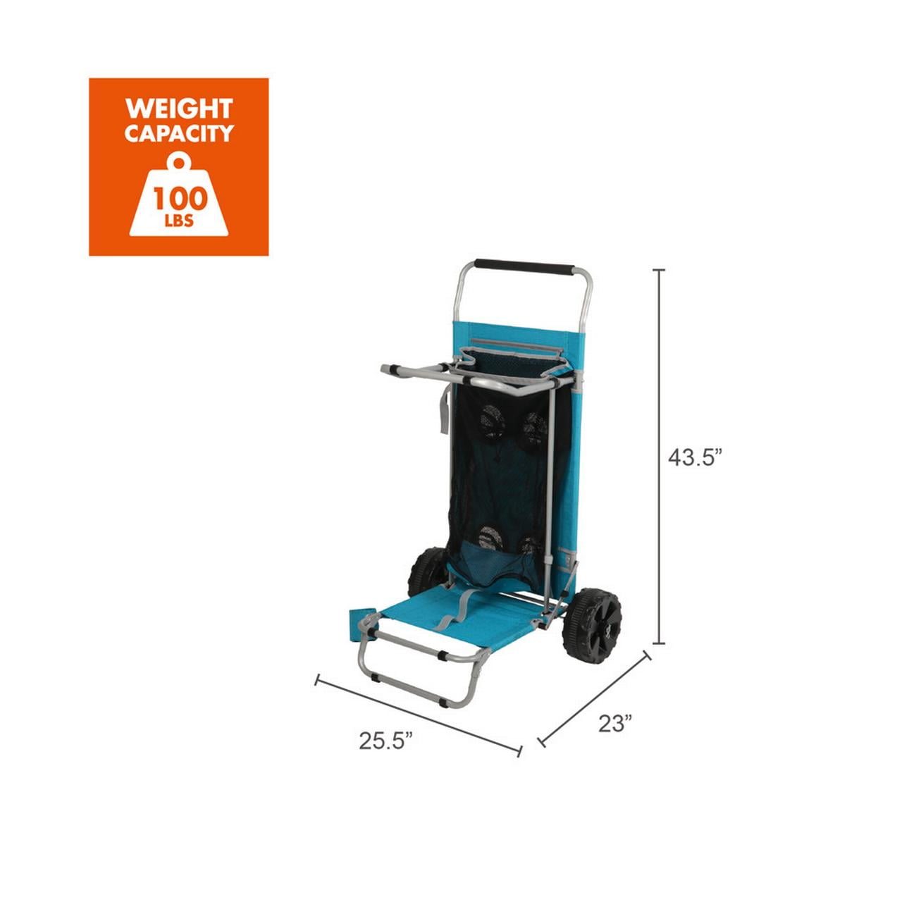Steel tube frame with powder coating Mesh pockets for extra storage space, blue in color Beach wheels for hauling items through sand, adult use Weight capacity: 100 lbs Product weight: 10.6 lbs Open dimensions (inches): 25.5″ x 23.5″ x 43.5″ Closed dimensions (inches): 19.7″ x 5.5″ x 40.9″