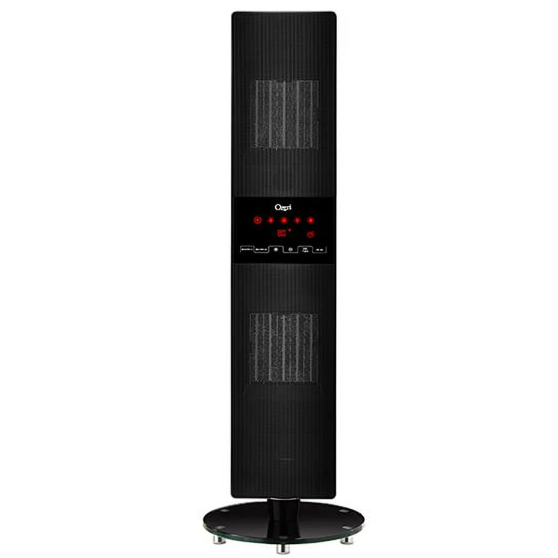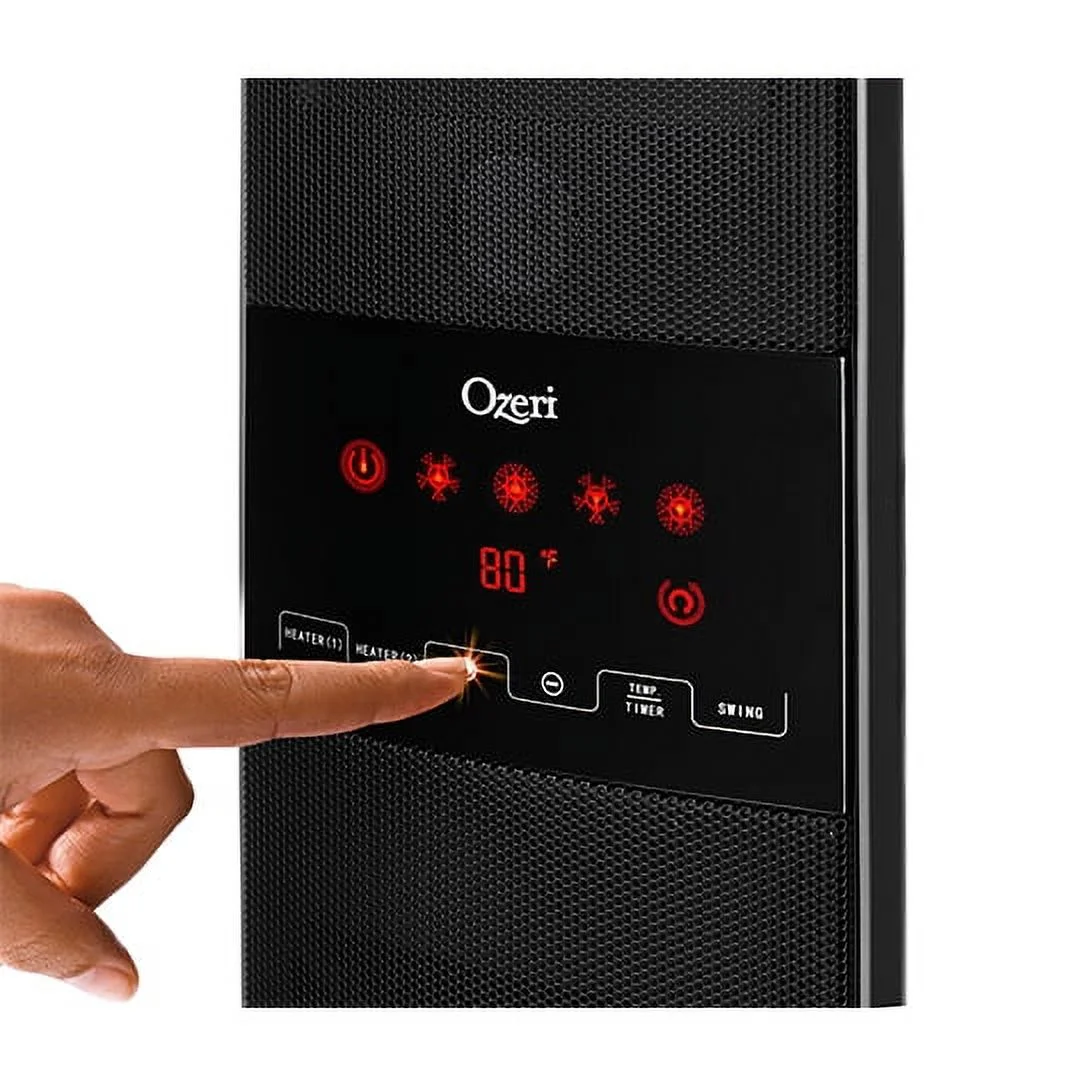 Ozeri OZH1 Dual Zone Ceramic Heater Adjustable Thermostat Remote Control 33.5in Ozeri is proud to present its OZH1 dual zone oscillating ceramic heater. The Ozeri OZH1 provides rapid heat on a wintry night with a programmable 12-hour timer and thermostat so that you can sleep in comfort. The OZH1 dual zone oscillating ceramic heater features a sleek space-saving design enhances room decor with a sturdy glass base designed to reduce the occurrence of accidental tip overs. The OZH1 utilizes a touch-button illuminated LED display that boasts a better viewing angle and common LCD displays and an extended-range remote control unit for maximum convenience. The OZH1 utilizes dual PTC ceramic heating systems to allow for 2 independently controllable heating zones each with 2 speeds for rapid heat distribution at 800 W (low) or 1500W (high). it also includes overheat protection to prevent irritating dust burning odors and an intelligent thermostat that adjusts heat output according to the ambient temperature and automatically turns off when the selected temperature is reached. The OZH1 dual zone oscillating ceramic heater utilizes a whisper quiet DC motor that generates warming air with the lowest possible noise coefficient and dismountable dustproof filters for easy cleaning. It measures 33.5 inch in height and includes a Recessed handle for easy transporting.