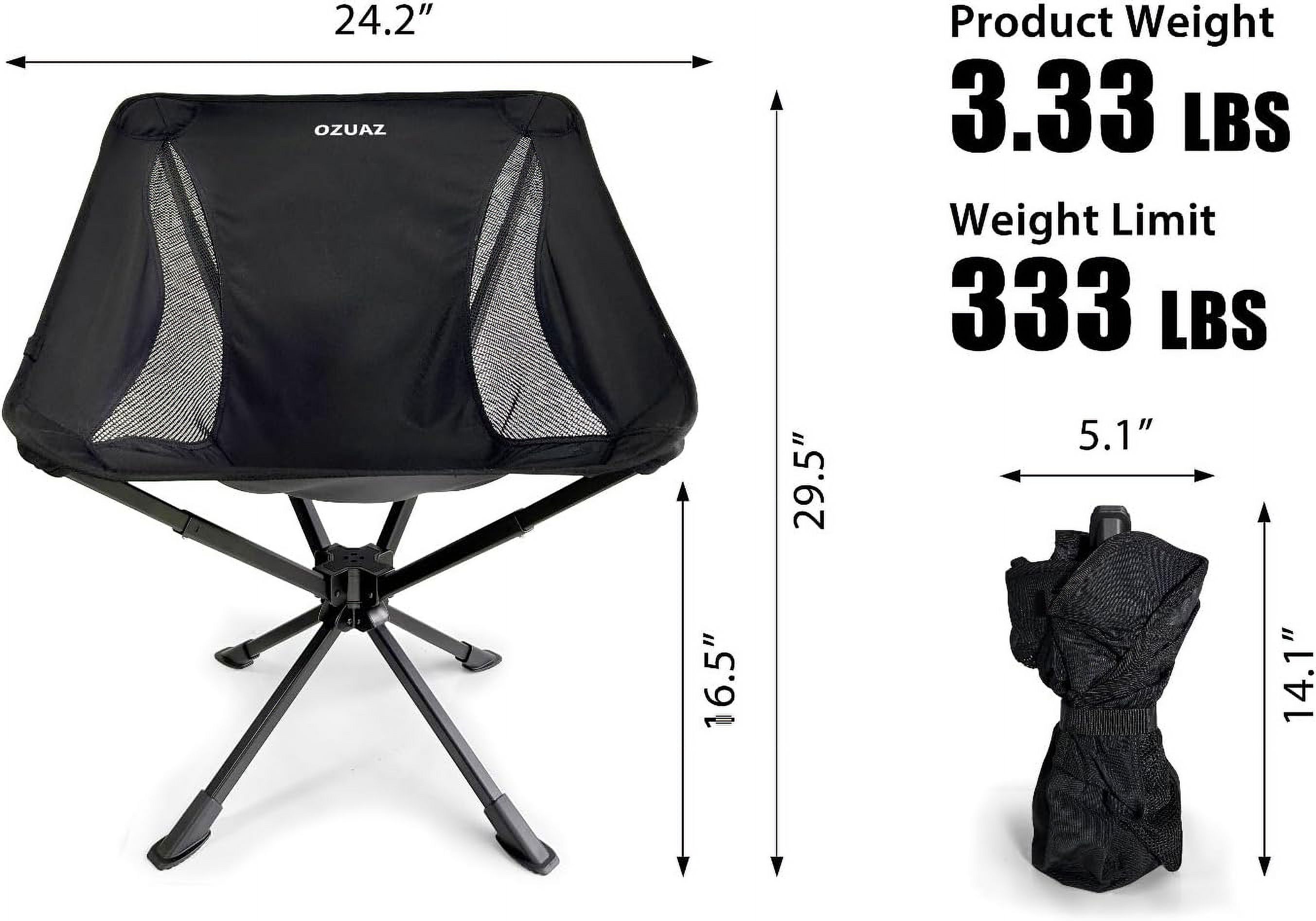 Ozuaz Portable Folding Camp Chair, Black Swivel Portable Chair: Features a 360° swivel design for enhanced comfort and convenience during outdoor activities Lightweight and Compact: Weighs only 3.55 lbs and collapses to a compact size of 13.4” x 3.7” x 3.7”, making it easy to transport and store Quick Setup: Instantly set up in just 8 seconds with no detachable parts, allowing for hasslefree relaxation Durable Construction: Made from aircraftgrade aluminum and waterproof nylon, ensuring longlasting use and support for up to 300 lbs Stability Features: Equipped with large antislip, wearresistant feet for added stability on various surfaces Versatile Use: Ideal for camping, beach outings, fishing trips, picnics, and outdoor festivals, enhancing your outdoor experience