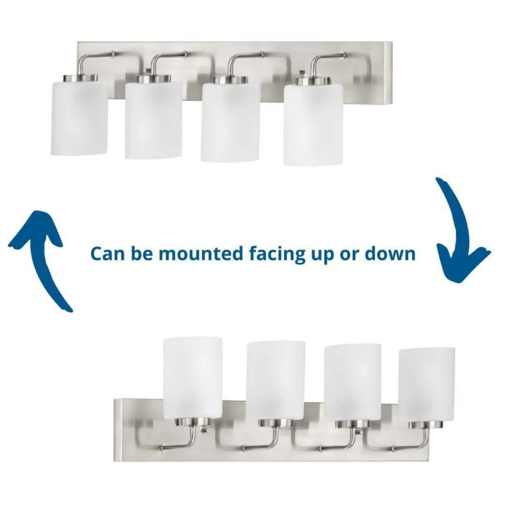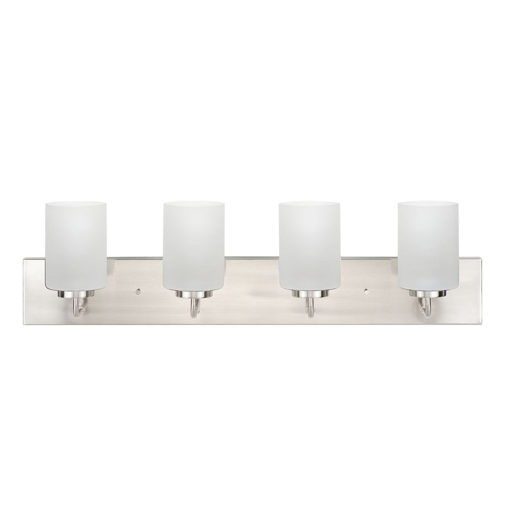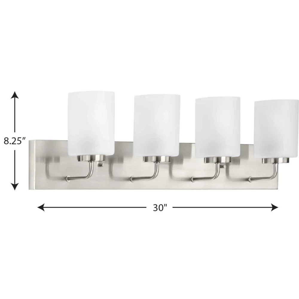 Progress Lighting-P300330-009-Collection: Merry, Material: Steel, Finish Color: Brushed Nickel, Width: 5.75″, Height: 8.25″, Length: 30″, Depth: 6″, Height From Outlet Box: 6″, Backplate Width: 30″, Backplate Length: 4.37″, Lamping Type: Incandescent, Number Of Bulbs: 4, Wattage: 100 Watts, Moisture Rating: Damp Rated, Desc: Incorporate a clean, contemporary design with the Merry Collection 4-Light Etched Glass Brushed Nickel Transitional Bath Vanity Light. Light sources glow from within crisp etched glass shades for a generous elegant glow sure to transform any bath into a modern retreat. The rectangular backplate, curved arms, and round light bases are coated in a beautiful brushed nickel finish that perfectly blends transitional and modern character. Back Plate Height: 4.37 / Back Plate Width: 30.00 / Shade Included: Yes / Shade Dimensions: 4 x 4 x 5.37 . ,-Merry – 4 Light Bath Vanity-Brushed Nickel Finish