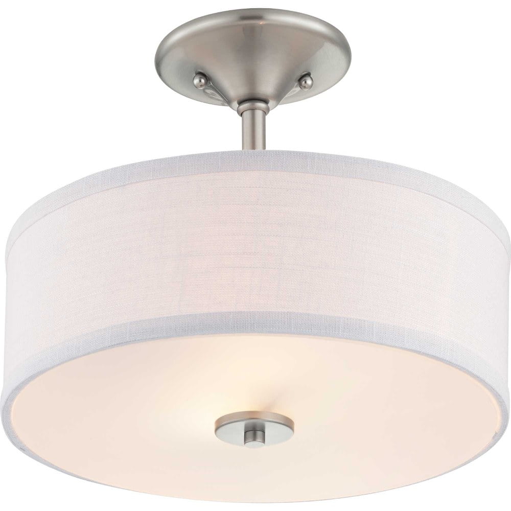Collection: Inspire, Material: Steel, Finish Color: Brushed Nickel, Width: 13″, Height: 10.13″, Length: 13″, Lamping Type: Incandescent, Number Of Bulbs: 2, Wattage: 75 Watts, Moisture Rating: Damp Rated, Desc: Harkening back to a simpler time, the Inspire Collection freshens traditional forms with flowing lines. The two-light semi-flush fixture features an etched glass diffuser with a summer linen shade finished with Brushed Nickel details. This fixture is suitable for a variety of design styles, including Modern, Traditional and Farmhouse and the simple design is a perfect complement to a variety of fixture collections. Canopy Included: Yes / Canopy Diameter: 5.19 / Shade Included: Yes / Shade Dimensions: 13 x 13 x 4.5 . , – – Inspire – Close-to-Ceiling Light – 2 Light in Farmhouse style – 13 Inches wide by 10.13 Inches high-Brushed Nickel Finish –