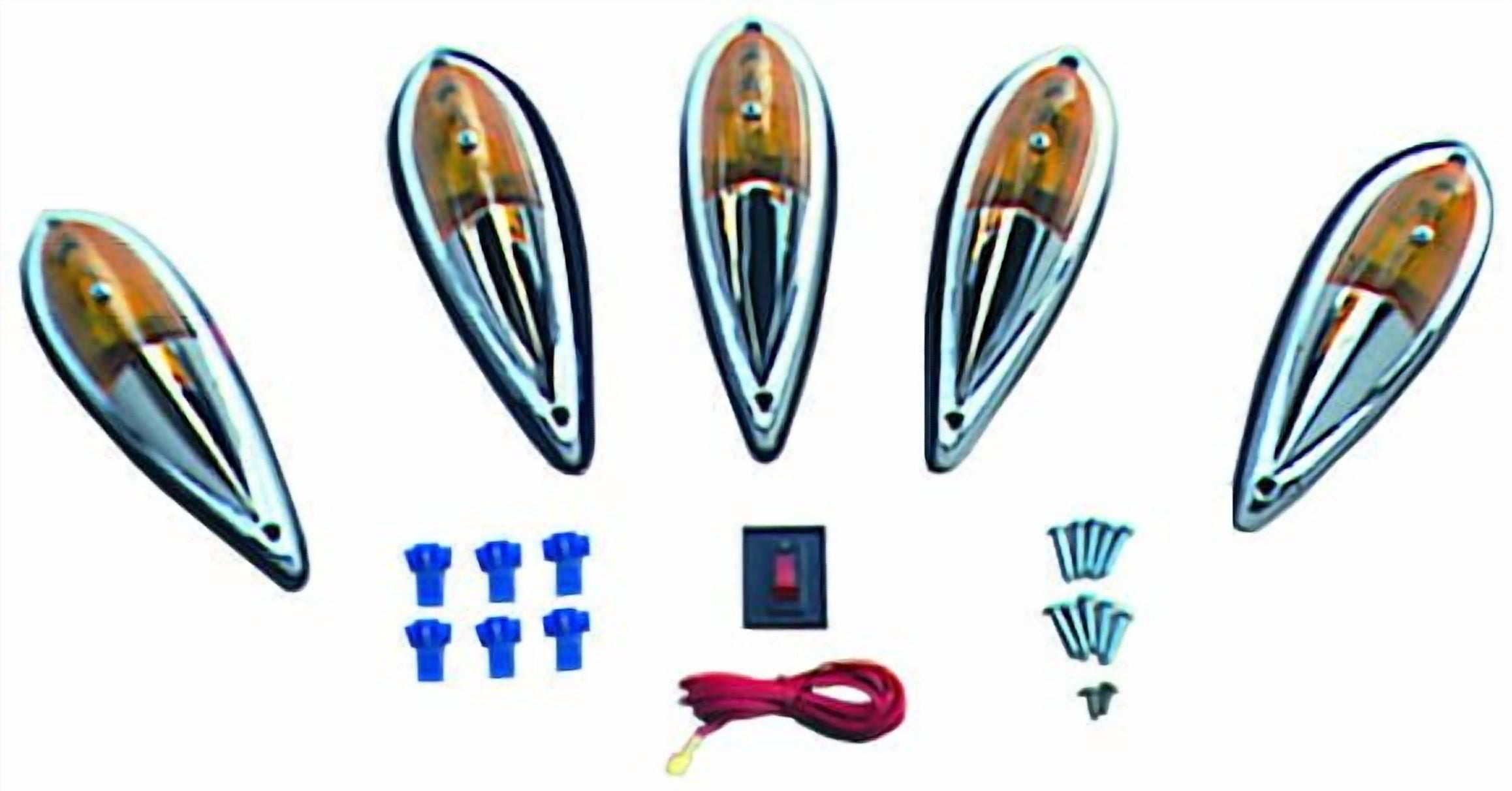 These bright amber illuminated cab roof lights give the ‘big rig’ look to light duty trucks and sport utility vehicles and provide a better visual fix to drivers in other vehicles. Constructed of a die-cast, tripled plated chrome base designed for flat or curved surfaces. Sold in a 5 light kit and include all necessary mounting hardware, wiring and a manual switch.