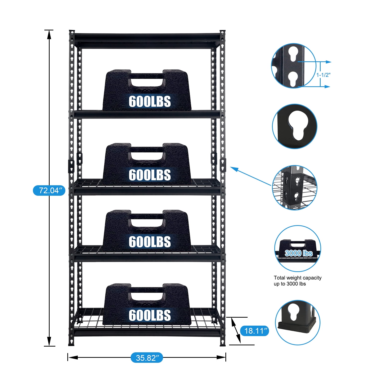 This Pachira 5-Shelf Steel Shelving Unit is a versatile and functional piece for homes, offices, warehouses and more. It is made of heavy-duty steel and built for strength and durability. This heavy-duty steel shelving unit has five shelves that provide efficient storage space. It can hold various items, large and small, and has a weight capacity of up to 600 lbs per tier when evenly distributed. The shelves of this five-tier shelving unit can be adjusted every 1-1/2 to allow for extra space as needed. The flexible design can be assembled vertically for traditional shelf space or horizontally for a workbench style piece. It measures 18L x 36W x 72H.