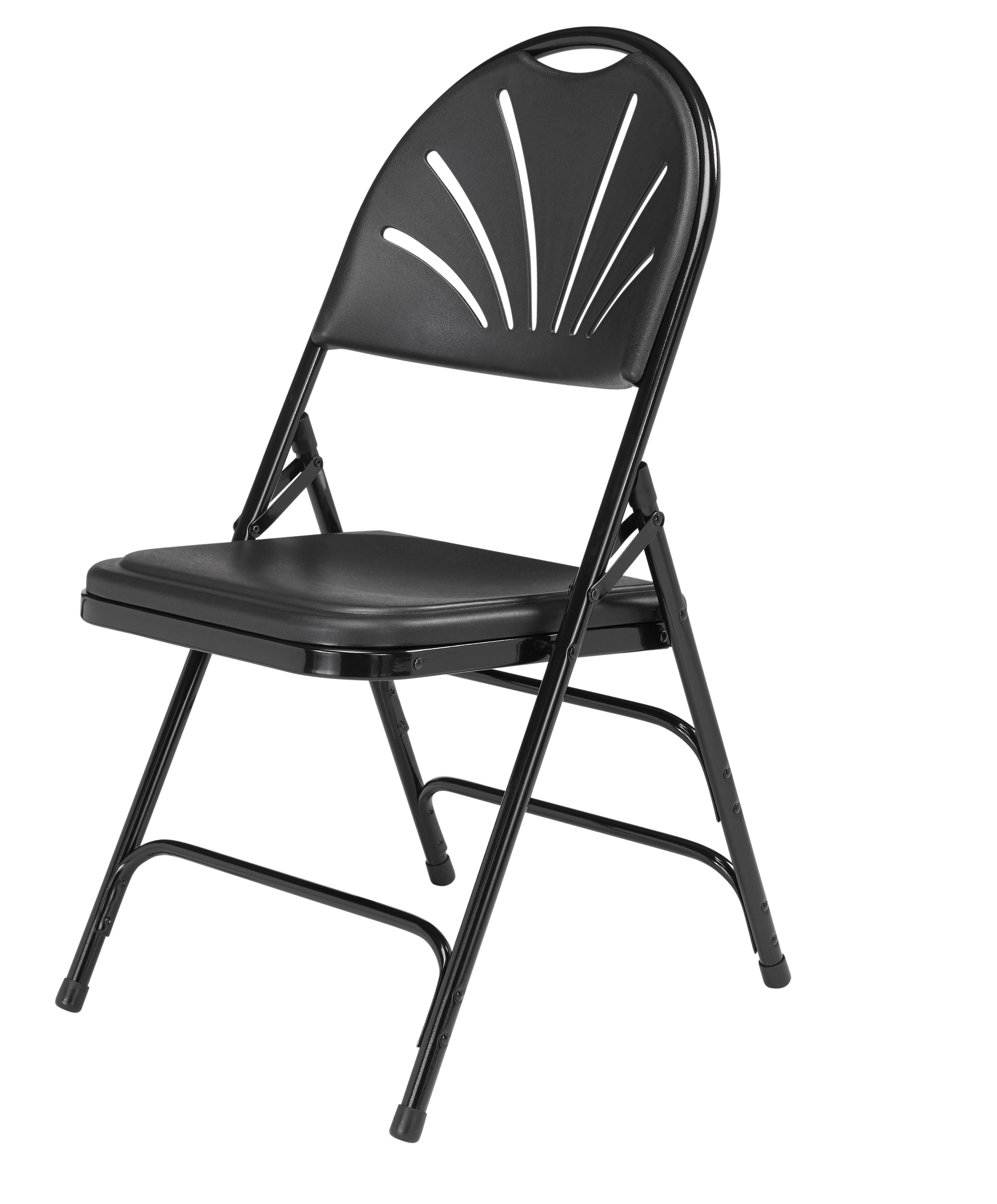 The NPS amazingly comfortable 1110 black, plastic, fan-back folding chair offers the perfect solution for both indoor and outdoor seating events such as meetings, graduations and receptions. This lightweight institutional-grade chair was made to provide you with the strengths of metal and all the benefits of plastic. The black, powder-coated 18-gauge tubular steel frame features three double-riveted U-braces for support. The attractive radius fan-back provides ergonomic comfort and breathability to provide relief during long presentations. Color-coordinated V-tip stability plugs provide added reinforcement and matching replaceable glides prevent floor damage.”