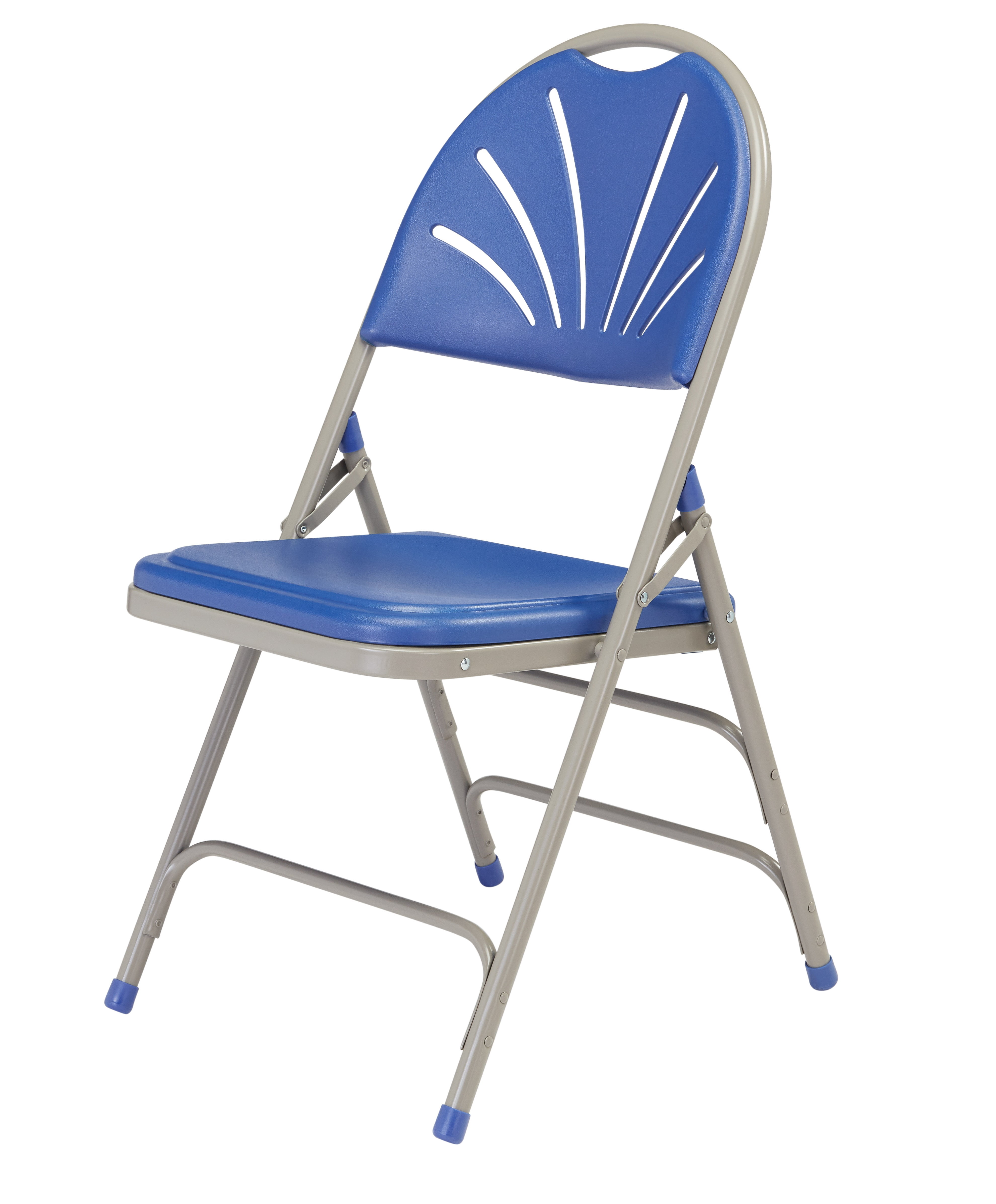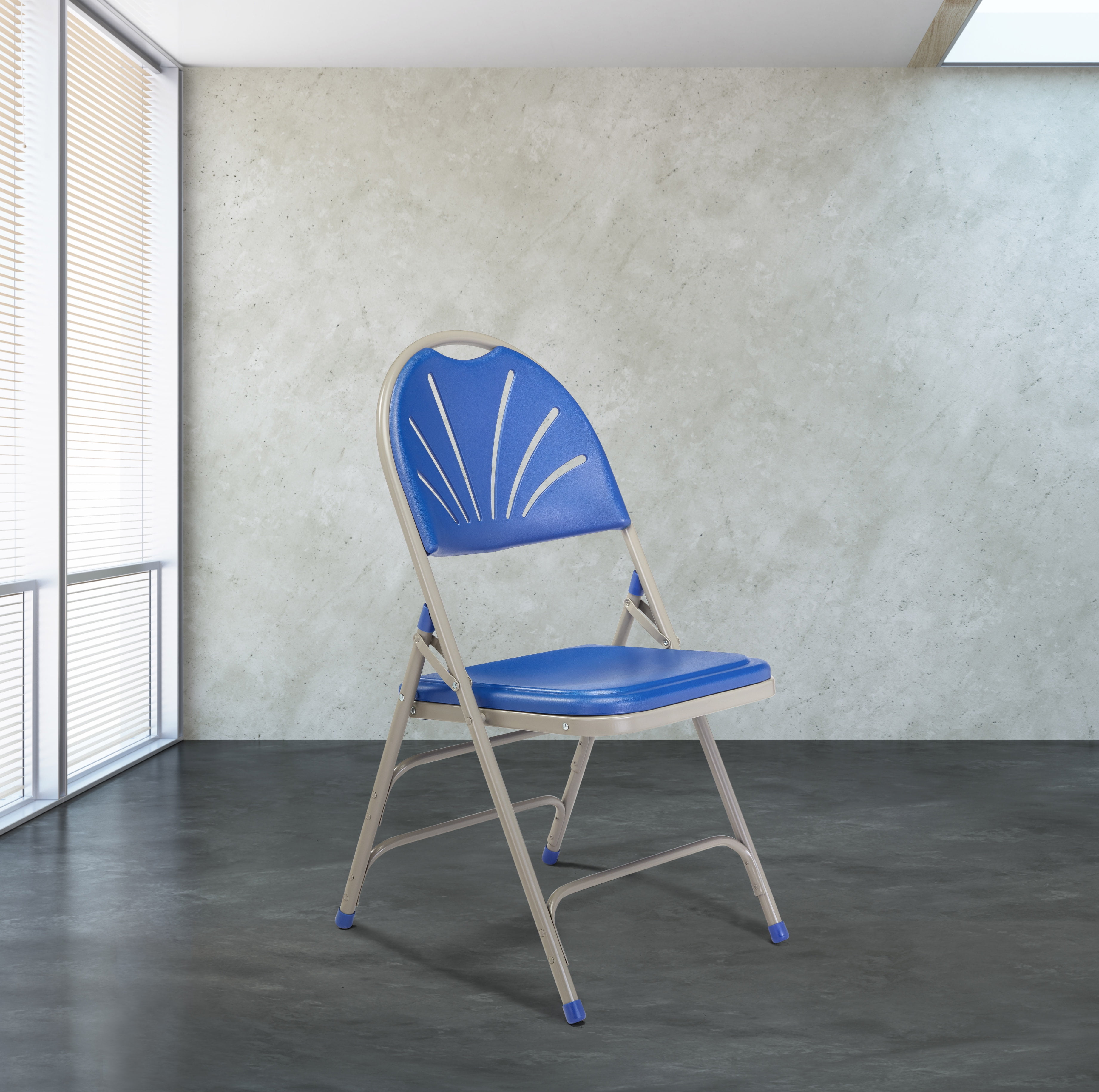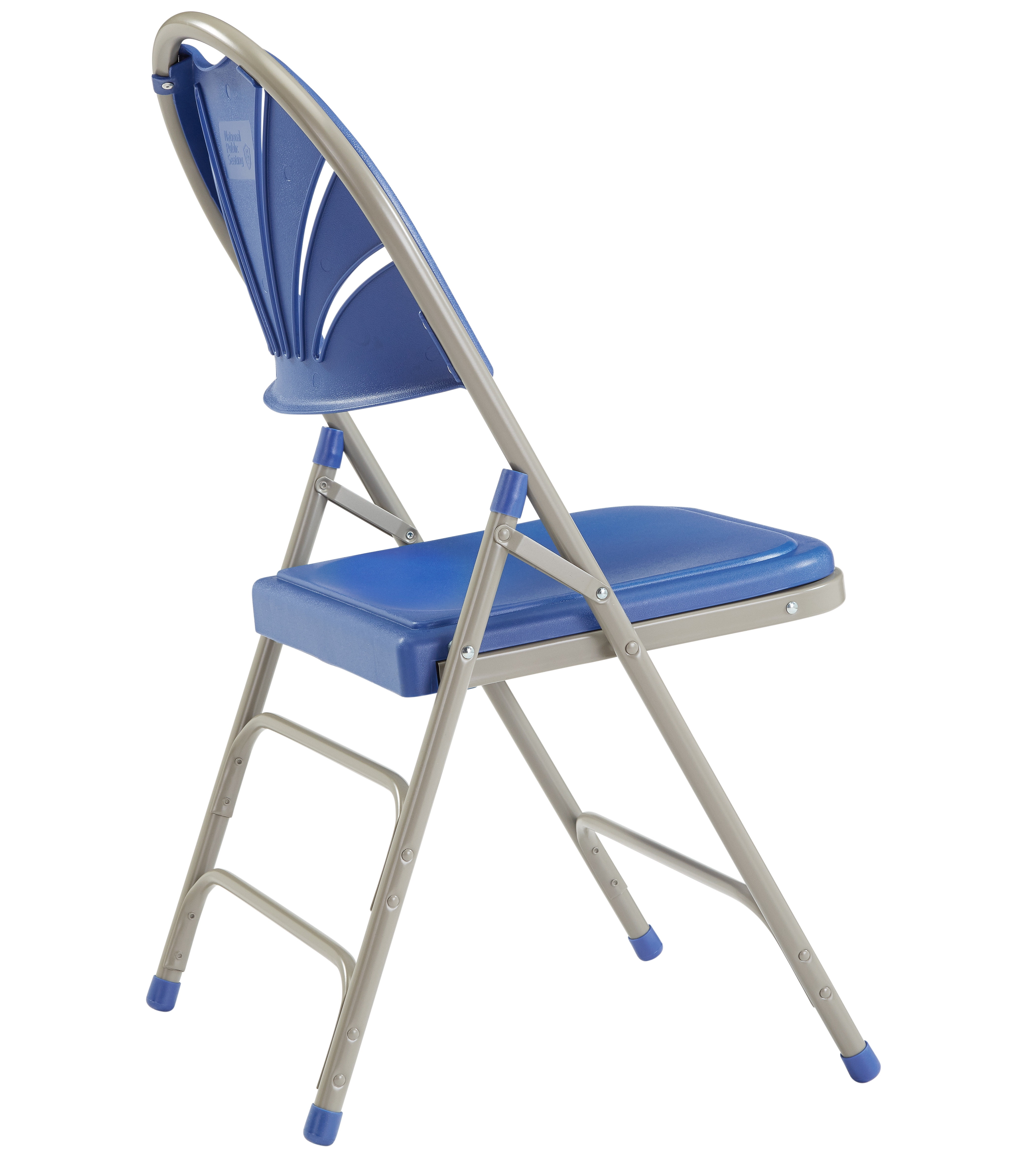 The NPS amazingly comfortable 1105 blue, plastic, fan-back folding chair offers the perfect solution for both indoor and outdoor seating events such as meetings, graduations and receptions. This lightweight institutional-grade chair was made to provide you with the strengths of metal and all the benefits of plastic. The grey, powder-coated 18-gauge tubular steel frame features three double-riveted U-braces for support. The attractive radius fan-back provides ergonomic comfort and breathability to provide relief during long presentations. Color-coordinated V-tip stability plugs provide added reinforcement and matching replaceable glides prevent floor damage.