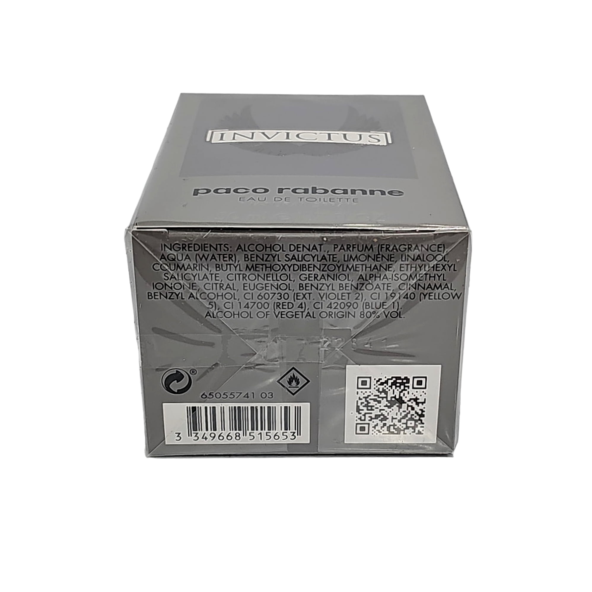 Paco Rabanne Invictus Eau de Toilette for men. The scent of victory. Fierce freshness and animal sensuality. Heroic woody-fresh. A heroic woody-fresh fragrance where the vibrant meets the muscular. Invictus perfume embodies two forces that collide: biting freshness and animal sensuality. The sea winds dominate. Grapefruit bursts. The virile woods prevail and ignite. The scent of magnetic patchouli, sensual guaiac wood and ambergris. Double victory! Heroic woody-fresh. Biting freshness and animal sensuality. Who wins? Grapefruit and guaiac wood collide. Vibrant meets muscular. An olfactory shock where two forces collide: biting freshness from marine accord, grapefruit bark, and bay leaf, a hot, sensual blast from buaiac wood ambergris, and labdanum resin. Be unforgettable with Paco Rabanne Invictus Eau de Toilette.