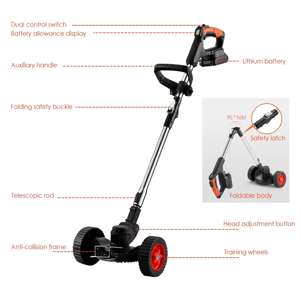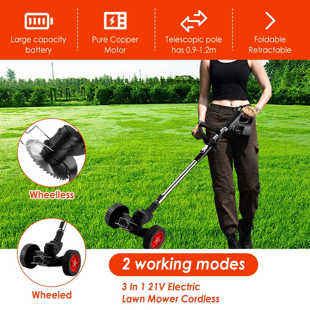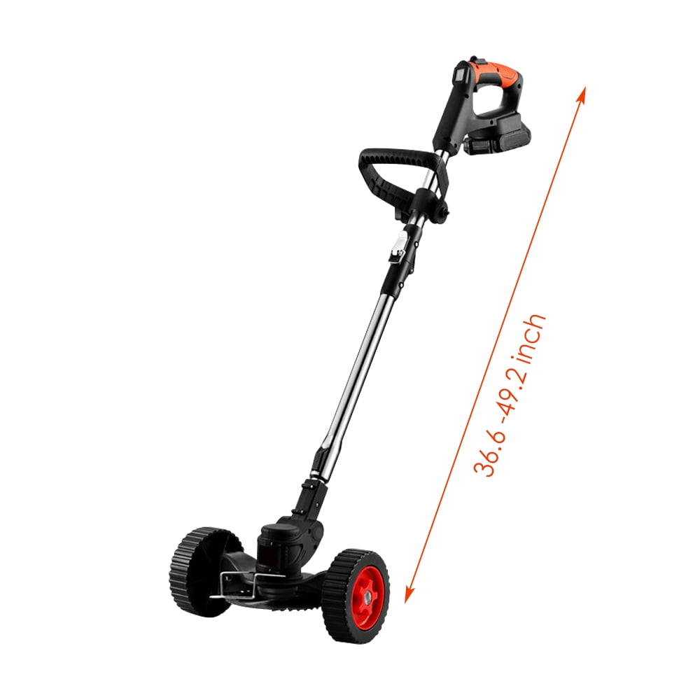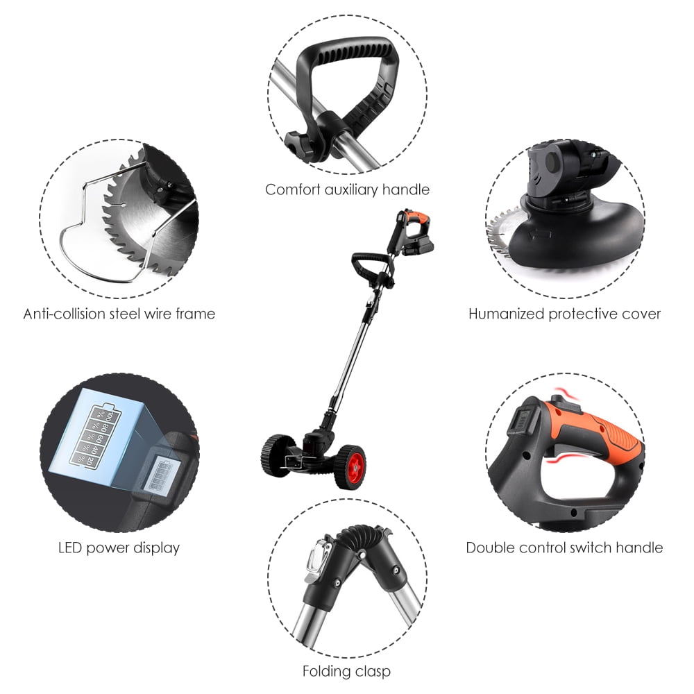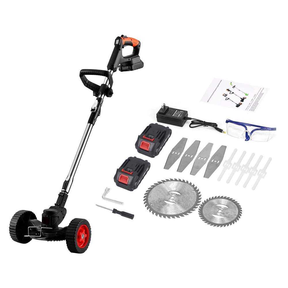 Feature: 1. New large-capacity batteries make you’re cutting more powerful and lasting. Professional Cordless Weed Eater, Trimmers, and Trimming machines, with power motor and drive device, No-load speed 18000RPM, to help you clear the lawn trimming work. 2. The telescopic pole is longer than the Weed Wacker on the general market, the entire length can reach 50 inches after being stretched. It can also be used by taller men. 3. Rotating baffle design, to prevent splashing when the Weed Trimmer. The angle of the machine head rotation is 0-90° freely adjustable at will to ensure that it can be suitable for most complex working environments. 4. Batter Powered Weed Eater with metal blades have three types(weed ropes are suitable for mowing soft grass, the flat blade is suitable for tiny branches, weeds, and small shrubs, and manganese steel circular saw blades are suitable for pruning thicker shrub branches). 5. Suitable for small gardens, villas, etc. Thanks to its easy handling, the trimmer is quickly at hand and saves you a lot of time. The best way to enjoy the free time you have gained is together with your family in your beautiful, well-tended garden. Specifications: Name: Mower Material: ABS+metal Color: red+black Battery: lithium battery, 21V, 2000mAh (included) Power: 650W Speed: 18000 rpm Diameter of round blade: 150mm Straight edge diameter: 146 mm Each run time: is 45 minutes Two batteries are 90 minutes Charging time: about 120 minutes Packing list: 1 * Lawnmower 1 * Saw blade 5 * White plastic blade 2 * Metal blade 1 * Handle 2 * Battery 2 * Wheel 1 * American charging equipment 1 * User manual Notes: 1. Due to manual measurement, please allow a difference of 0.1-0.2 inches. 2. Due to light and screen differences, the product may be slightly different from the picture
