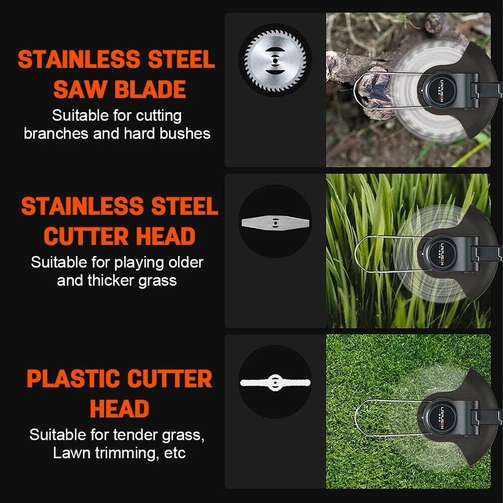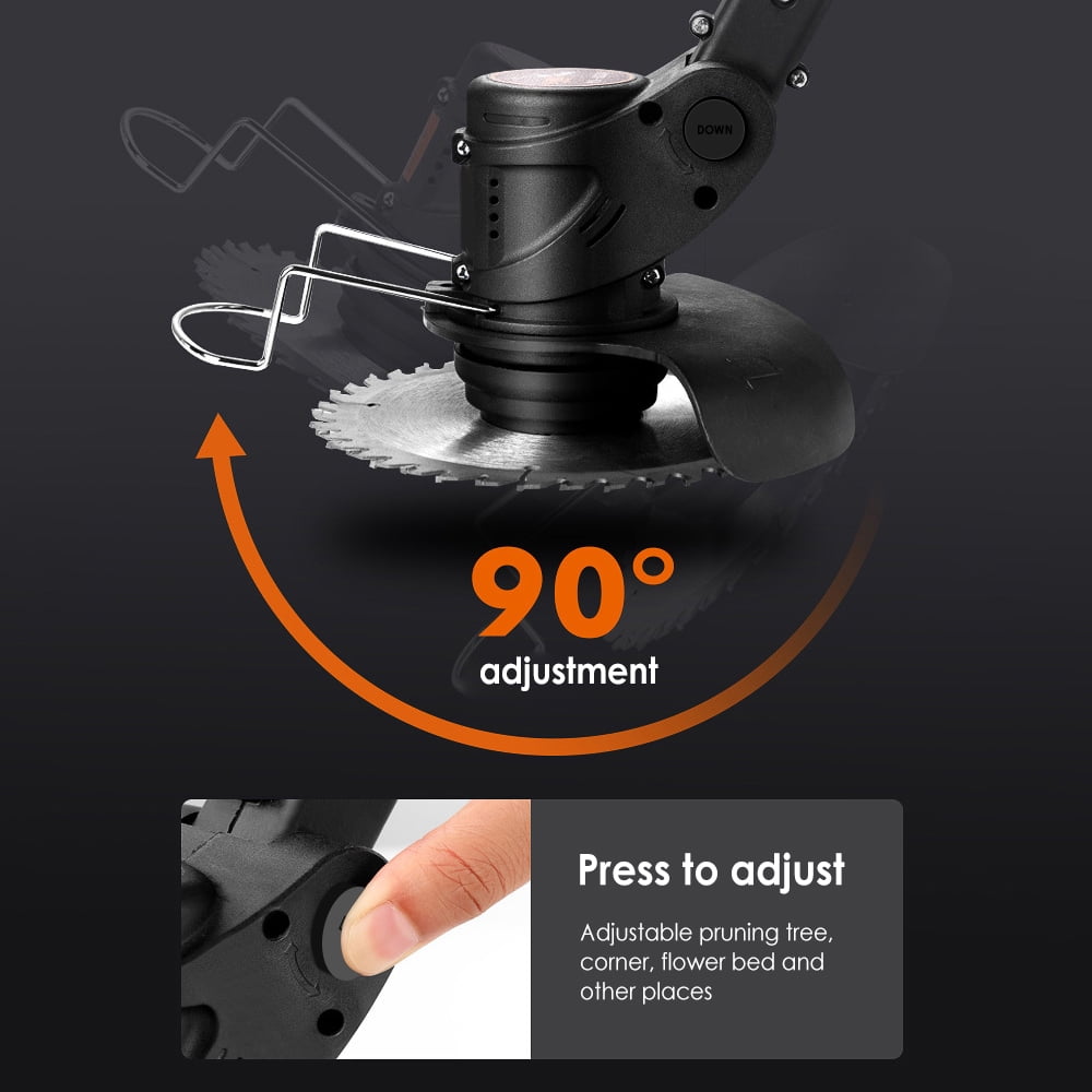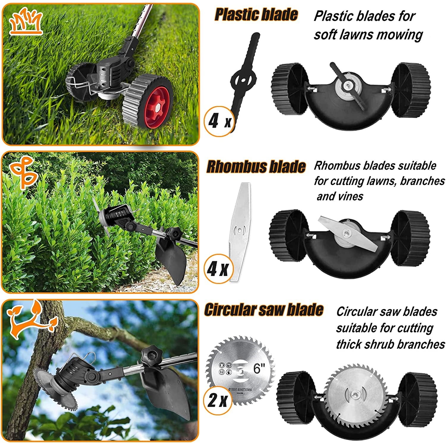 1. New large-capacity batteries make you’re cutting more powerful and lasting. Professional Cordless Weed Eater, Trimmers, and Trimming machines, with power motor and drive device, No-load speed 18000RPM, to help you clear the lawn trimming work. 2. The telescopic pole is longer than the Weed Wacker on the general market, the entire length can reach 50 inches after being stretched. It can also be used by taller men. 3. Rotating baffle design, to prevent splashing when the Weed Trimmer. The angle of the machine head rotation is 0-90° freely adjustable at will to ensure that it can be suitable for most complex working environments. 4. Batter Powered Weed Eater with metal blades have three types(weed ropes are suitable for mowing soft grass, the flat blade is suitable for tiny branches, weeds, and small shrubs, and manganese steel circular saw blades are suitable for pruning thicker shrub branches). 5. Suitable for small gardens, villas, etc.Thanks to its easy handling, the trimmer is quickly at hand and saves you a lot of time. The best way to enjoy the free time you have gained is together with your family in your beautiful, well-tended garden.