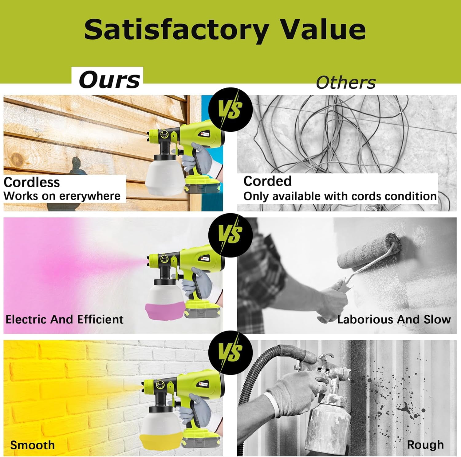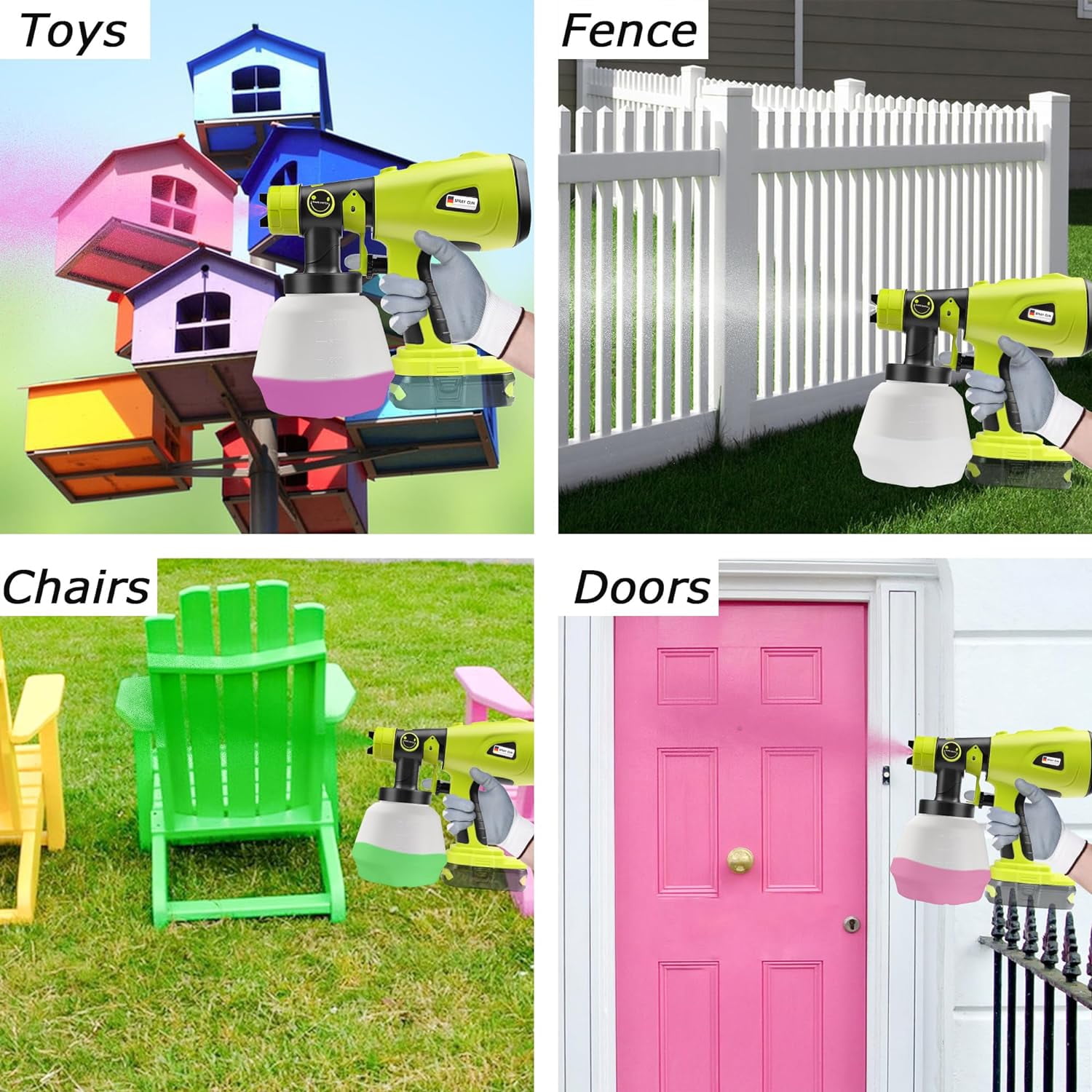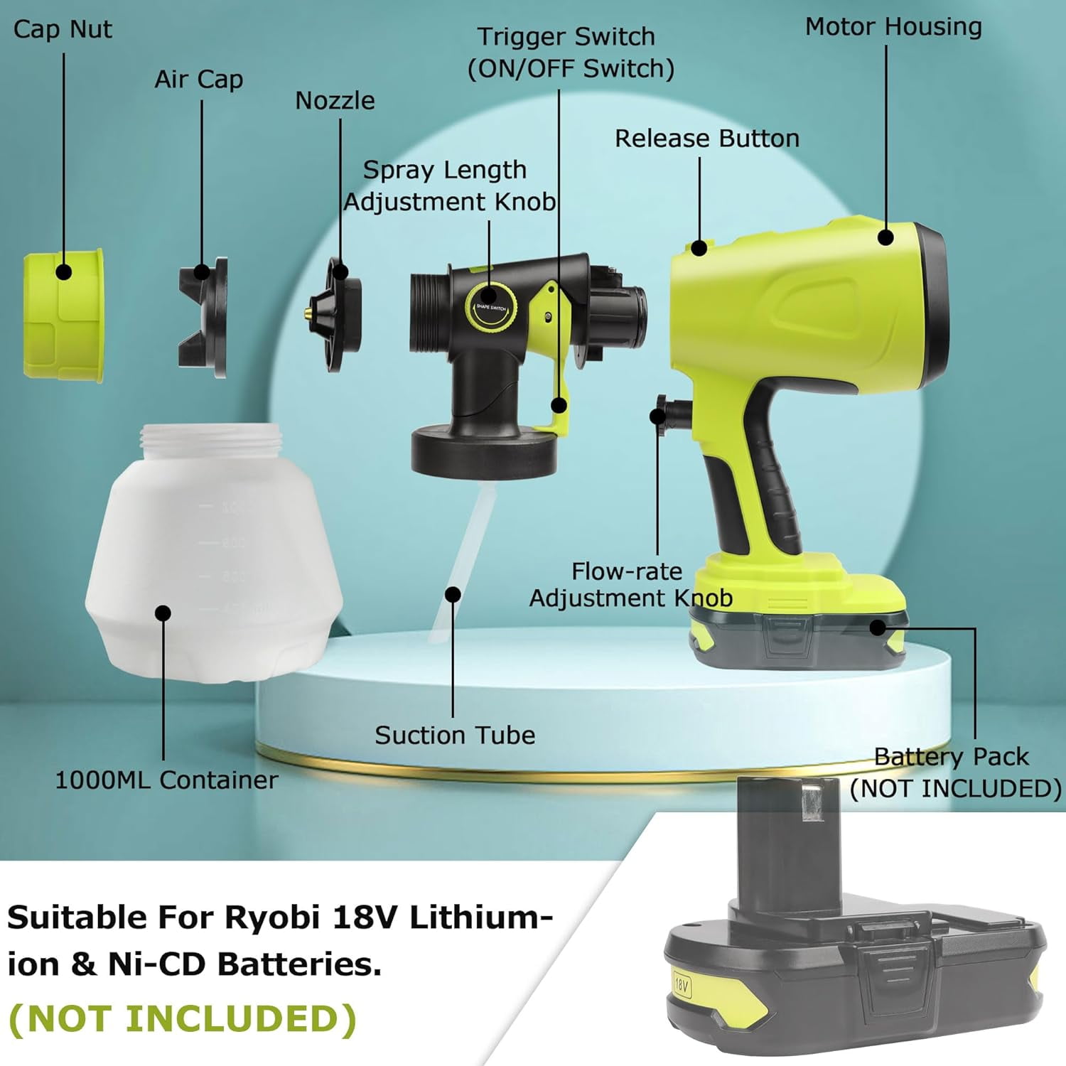 Powerful Performance: Equipped with a 200W brushless motor and 4 premium copper nozzles, this paint sprayer enhances efficiency and durability with an airflow of 1600 ml/min Ease of Use: Enjoy painting freedom with the cordless design, featuring a spray distance switch and pattern adjustment knob for effortless control. Compact size: 10 x 3.5 x 9 inches Versatile Applications: Perfect for home renovations, yard landscaping, and small furniture upgrades, including furniture, cars, fences, interior walls, garage doors, and garden tables and chairs Multiple Nozzle Sizes: Comes with 4 copper nozzles (3.0mm, 2.5mm, 1.8mm, and 1.0mm) to cater to various spray requirements. Crafted from pure copper for corrosion resistance and longevity Compatible with Ryobi Batteries: Designed to work with all Ryobi ONE+ 18V Li-ion, Ni-Cad, and Ni-Mh batteries (battery not included) Safety Features: Built-in low voltage and overload protections ensure the safety of your Ryobi battery, providing peace of mind while you work