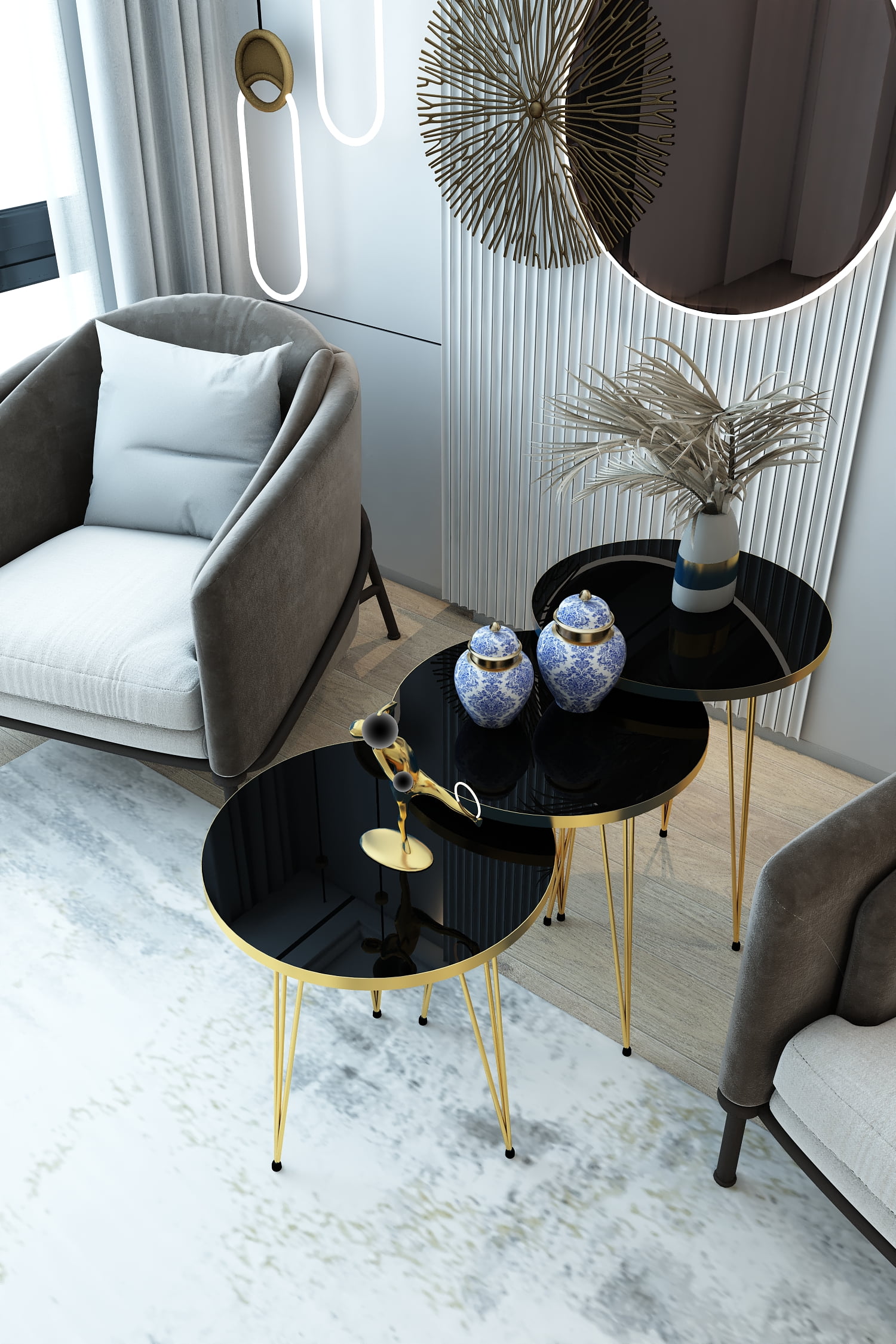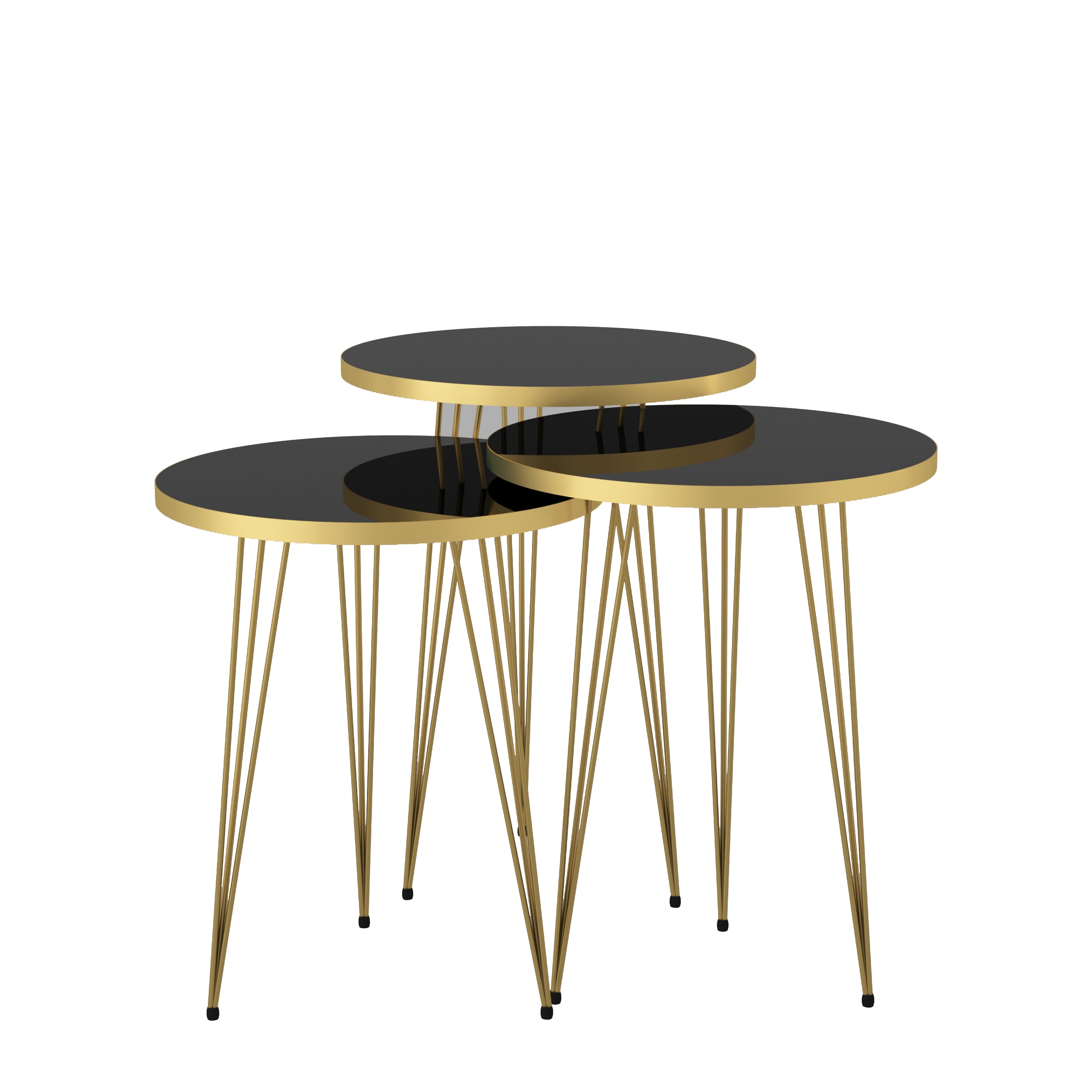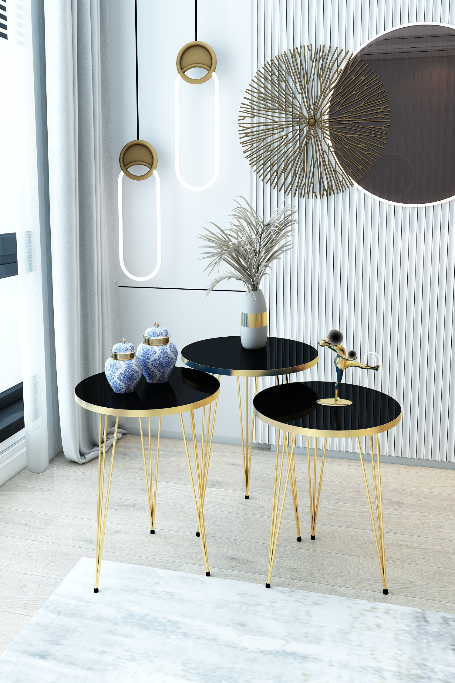 PAK HOME – Set of 3 High Gloss Black Nesting End Tables – Round Wood Sofa Side Accent Tables with Metal Legs – BLACK/GOLD