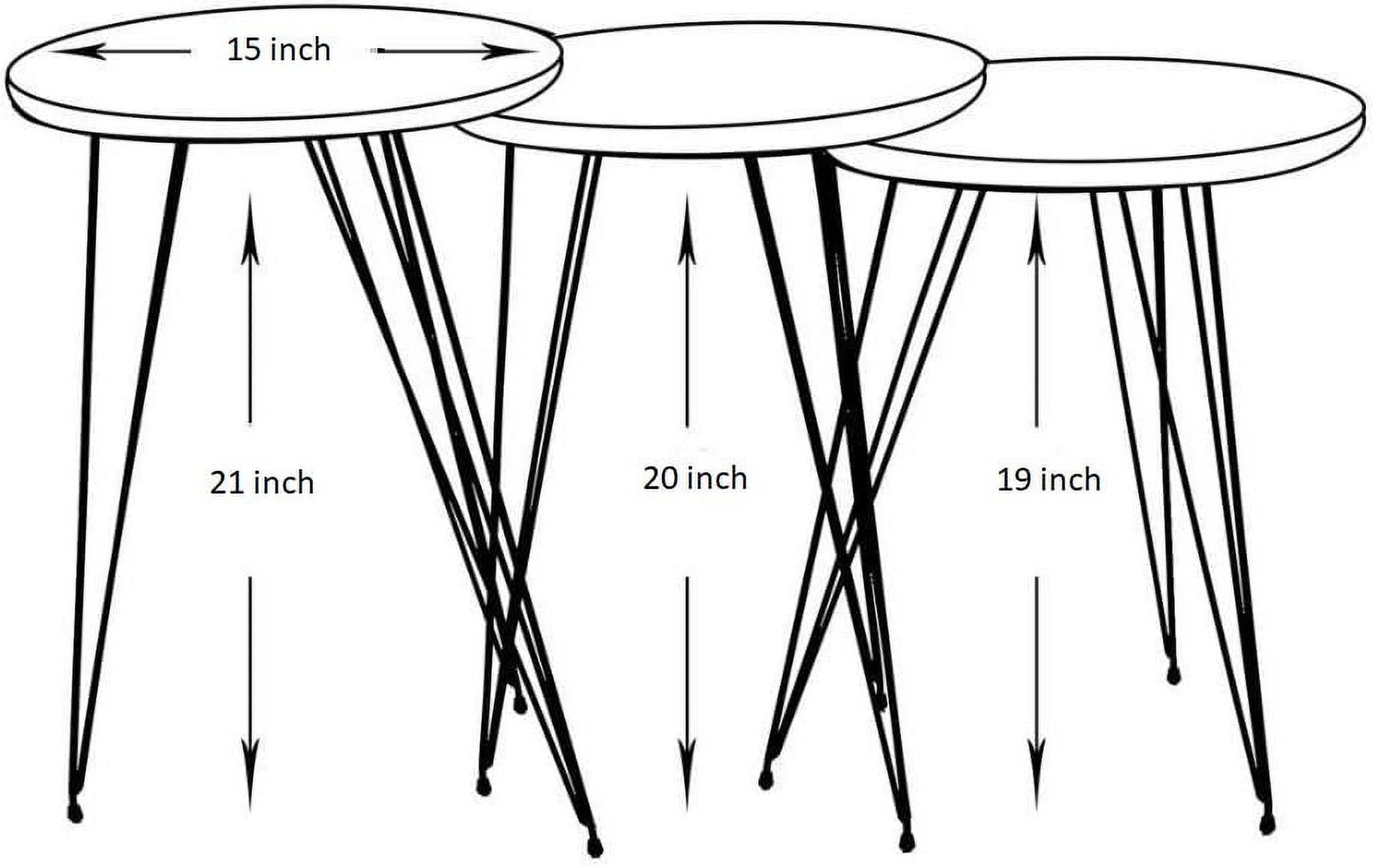 Set of 3 Nesting Tables Dimensions: Large one: 15.3″ diameter x 21.2″ height Medium one: 15.3″ diameter x 19.6″ height Small one: 15.3″ diameter x 18.1″ height. High Quality & Modern Design: Strong and sturdy small tables are made of high-quality wood material and metal legs.