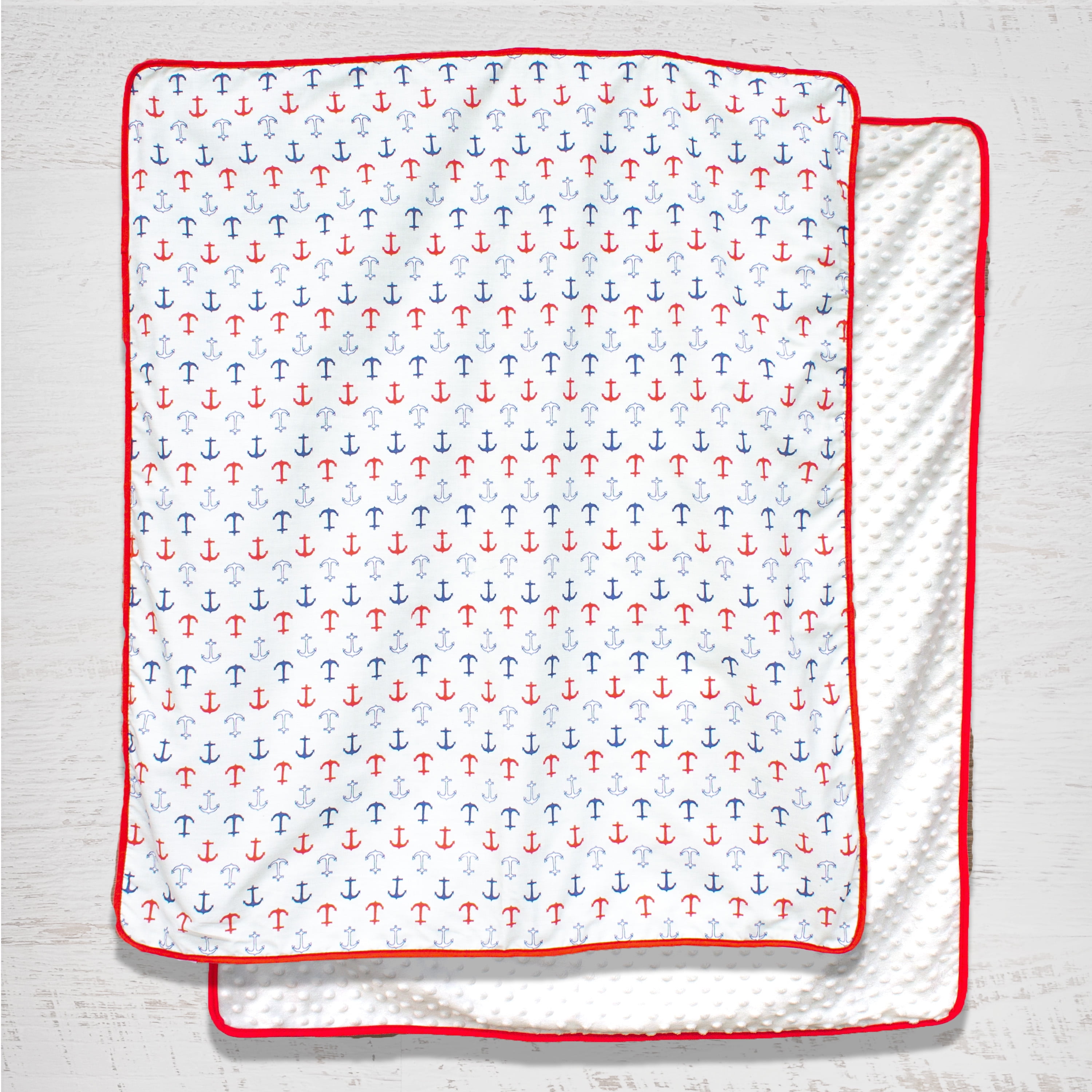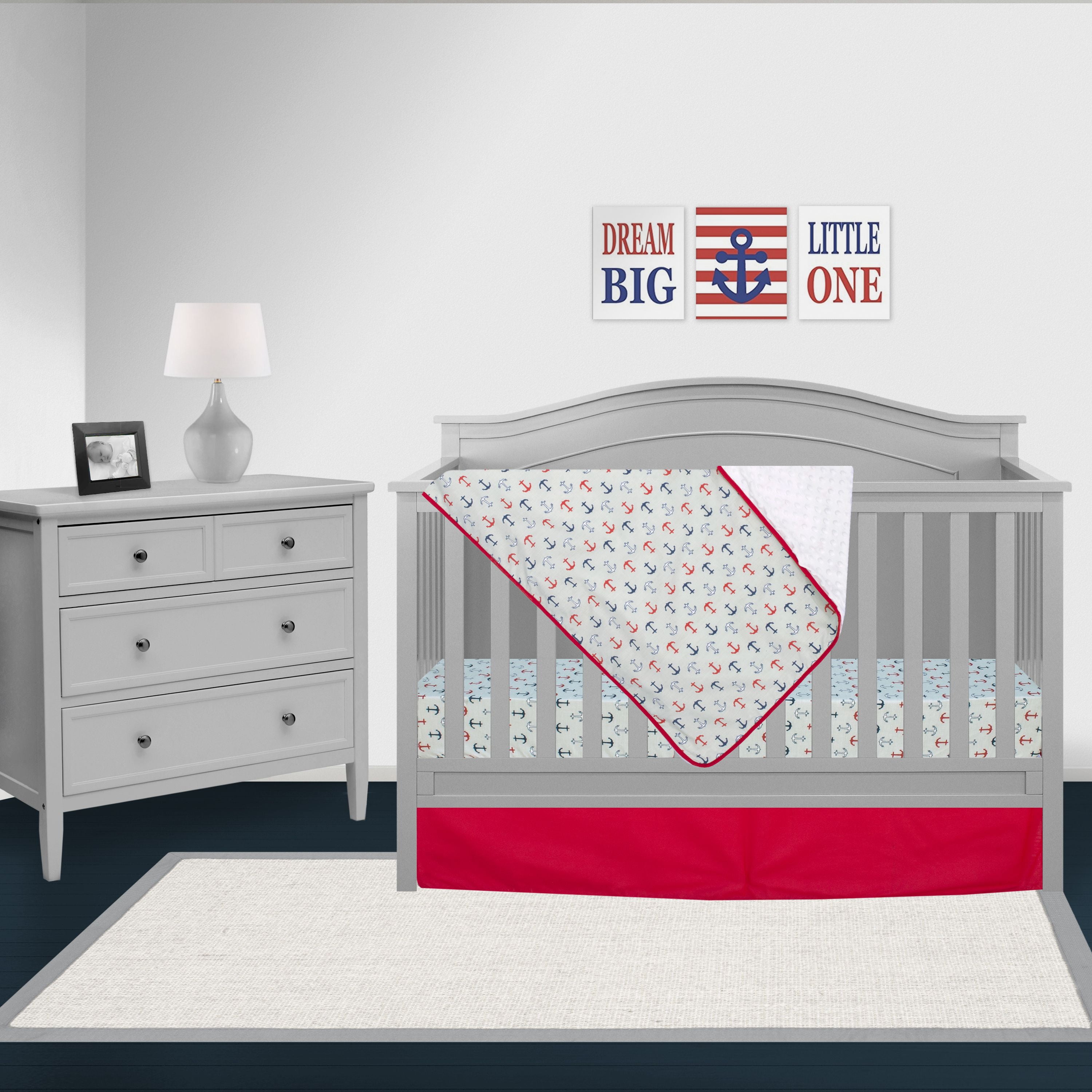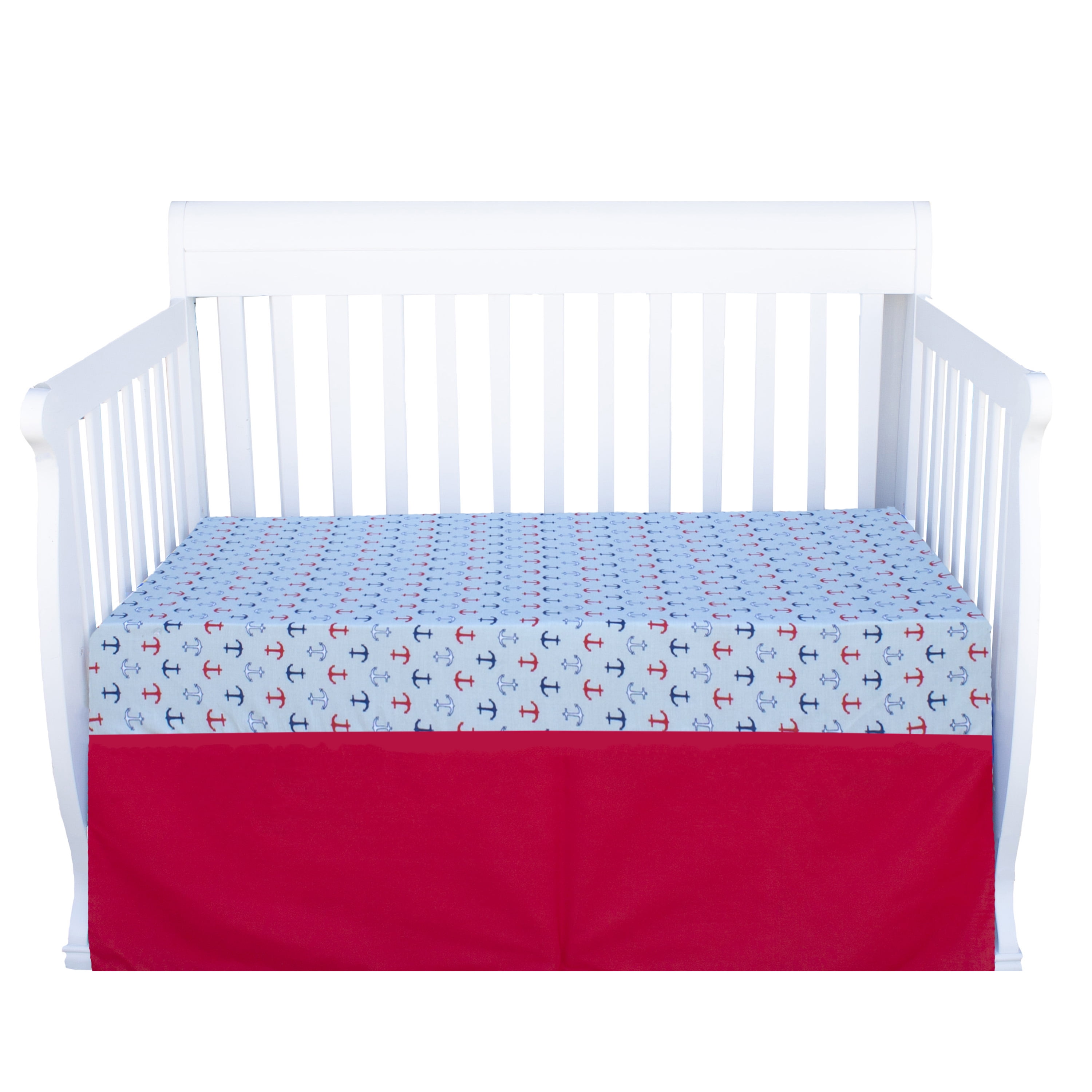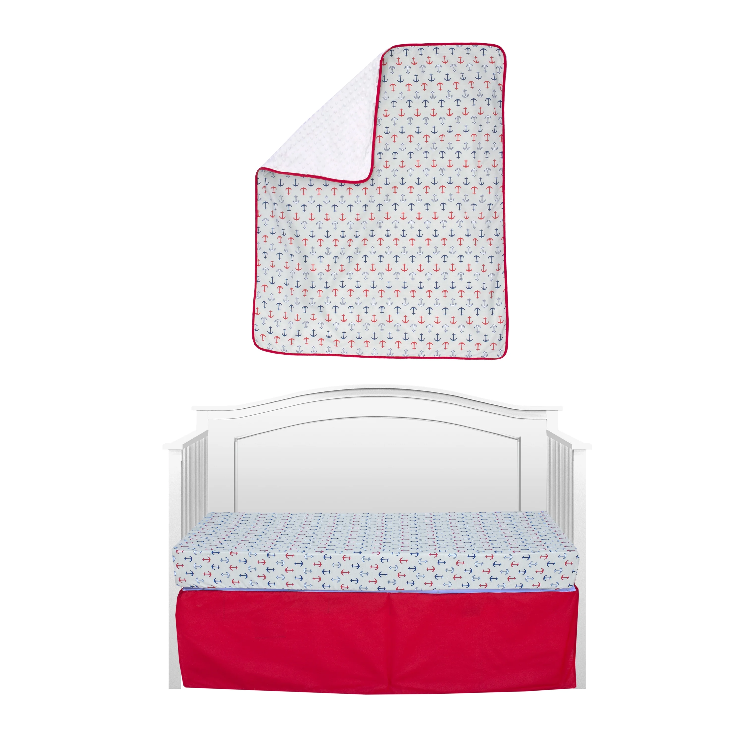Pam Grace Creations Anchors Away 3 Piece Red Nautical Crib Bedding Set Set includes Reversible Chenille Dot Baby Blanket, Fitted Crib Sheet, and Crib Skirt Other matching items available to complete your Anchors Away nursery set include Boppy Cover, Changing Pad Cover, Curtain Panels, and Lamp Shade Soft cotton/poly blend allows for easy machine wash and dry Imported Color scheme features Red, Navy, Grey, and White